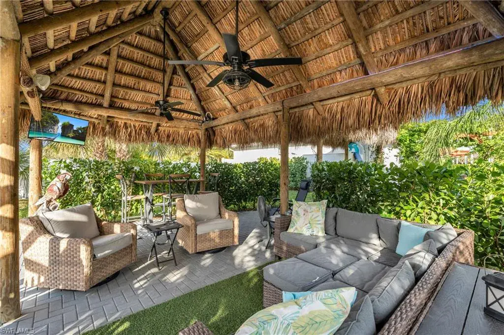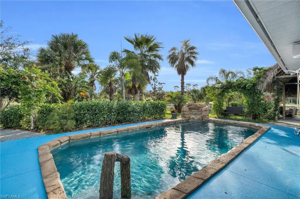 Step outside into your resort-style backyard featuring a gorgeous pool with rock waterfall, two oversized tiki huts with full outdoor kitchens, a private fishing dock, tropical landscaping, and expansive decking—designed for both entertaining and relaxing. The canal offers southern exposure for golden sunsets and Gulf access—a rare opportunity in Golden Gate Estates.