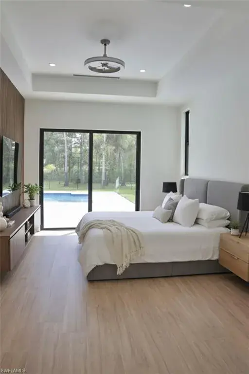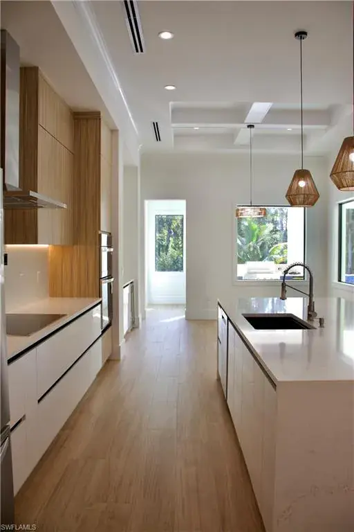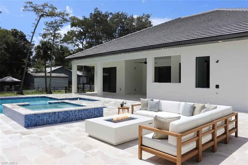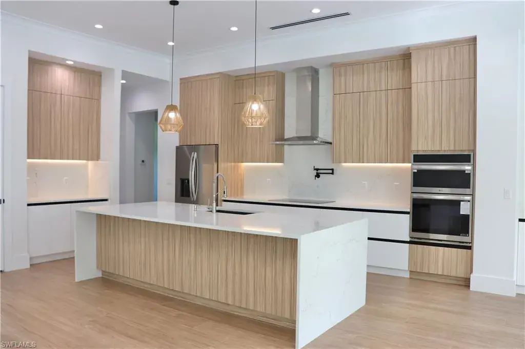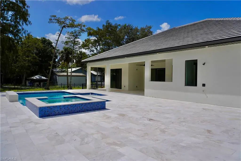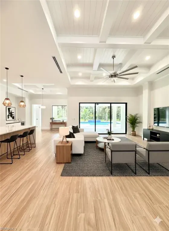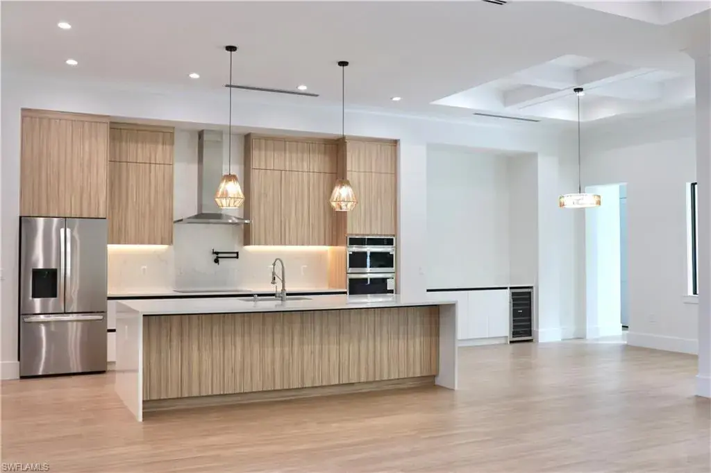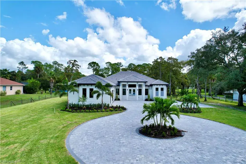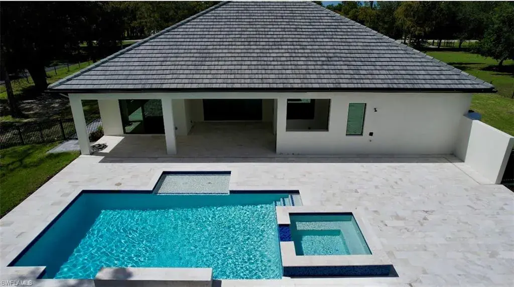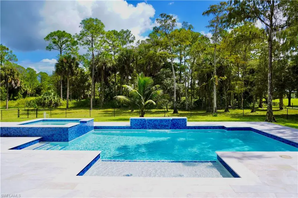Step into modern coastal elegance with this newly built 4-bedroom + den, 3-bath pool home with over 2,800 sqft of living space and 3-car garage perfectly situated on a private 2.5 acre lot in Golden Gate Estates. This home features an open-concept layout, high coffered ceilings, and contemporary finishes throughout. The gourmet kitchen boasts European-style cabinetry, quartz waterfall island, stainless steel appliances, double ovens, and modern pendant lighting. The spacious living area seamlessly connects to the outdoor oasis, where sliding glass doors open to a covered lanai and sparkling salt pool with integrated spa and sun shelf overlooking lush tropical landscaping. Outdoor kitchen with gas grill, great for entertaining. Retreat to the primary suite featuring a spa-inspired bathroom with a freestanding soaking tub, oversized glass shower, and dual floating vanities. Enjoy the Florida lifestyle with indoor–outdoor flow, wood-look porcelain tile flooring, and energy-efficient impact windows and doors throughout. The home also includes a wine bar area, pantry, and spacious laundry room. Fully landscaped with paver driveway, fenced yard and aluminum automatic front gate, ready to move in! Located minutes from Collier Blvd, top-rated schools, shopping, and the beautiful Gulf beaches — this home blends modern design, privacy, and convenience in one perfect Naples address.
