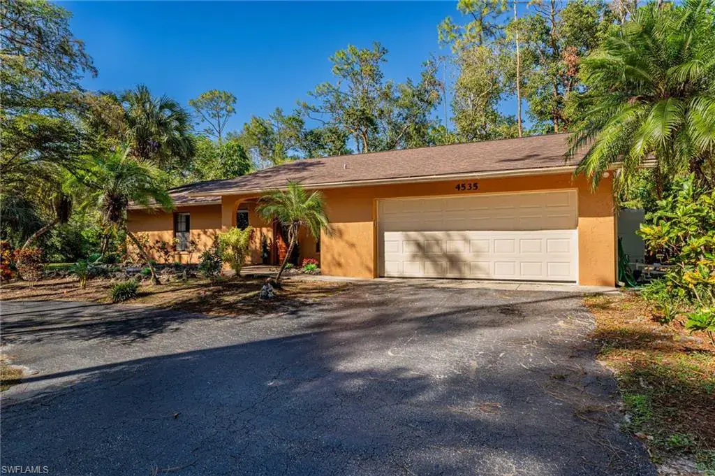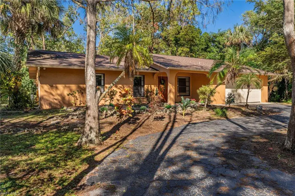 Welcome to this nicely kept 3 bedroom, 2 bath stucco home with a 2 car attached garage. Being sold “As Is”. This lot is high and dry, sitting on 165 x 662/ 2.5 acres. Paved driveway. Complete privacy nestled in tall trees and a park like setting surrounded with fruit trees. 5 Horses are allowed. This home features counter top kitchen seating, formal dining room, separate den/office and family room. Relax and enjoy the spacious screened in lanai with below ground spa. Tiled flooring, marbled kitchen counters, water conditioning system, roof and air conditioning replaced 7 years ago. The irrigation sprinkler system is on timers and the pump is 4 years old. This open floor plan has over 2100 sq feet under air. Plenty of room on this lot for building a large main house or guest house! This property is located just off of Collier Blvd, with estate properties of multi million dollar homes. Close to downtown Naples, shopping, dining and 2 airports.