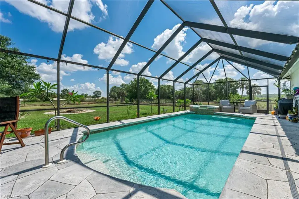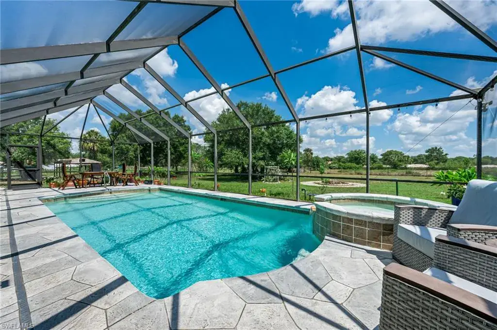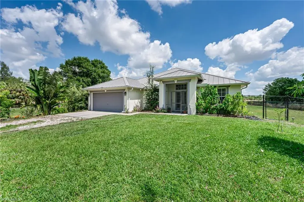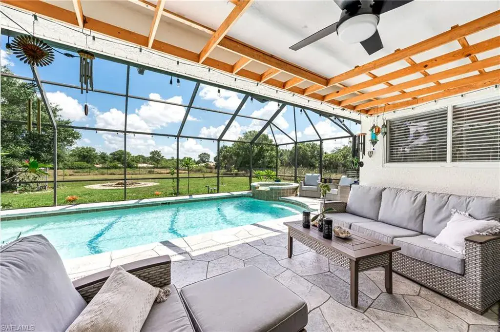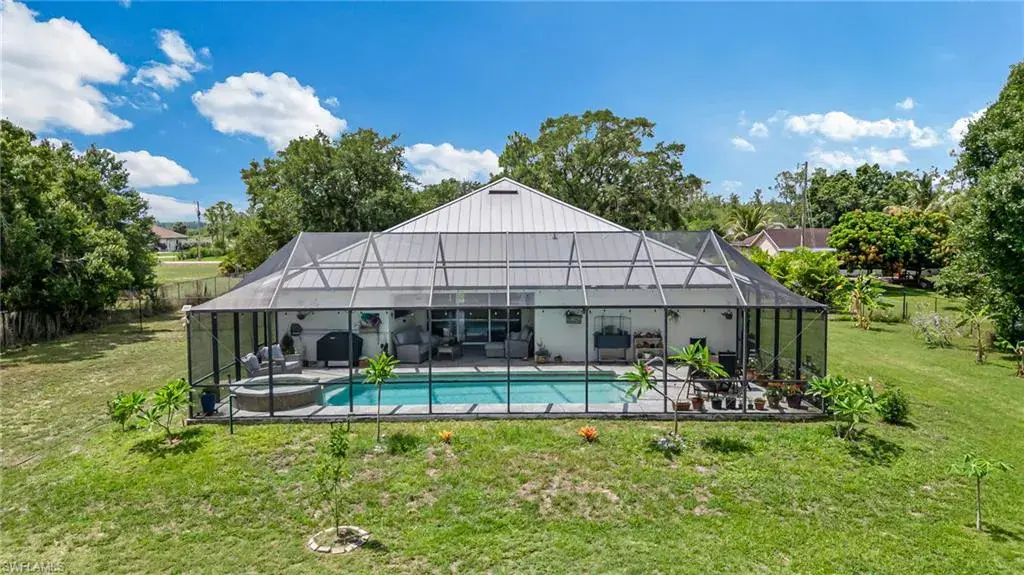 Nestled on 2.27 acres of peace and solitude in a rapidly growing area of Golden Gate Estates, this impeccably maintained home with spacious rooms has numerous upgrades that will bring peace of mind and modern comfort, and include, a brand new $17k, Lennox AC system with uv light and extra filtration function, (installed 7/9/2025), a durable metal roof with new guttering, a whole-house reverse osmosis system, an upgraded electrical panel with generator inlet and well breaker, underground wiring to the road, a whole-house surge protector, and upgraded interior/exterior lighting. The home also boasts a new pool pump, spa heater, water heater, and fresh Sherwin-Williams paint inside and out. You’ll also find a wide variety of ornamental trees and flowers. Several types of Frangipani, two Royal Poinciana trees, very young, Mexican Sunflower bushes/trees, Queen‘s Wreath, rose bushes, including Heirloom Hybrid Roses in a white rose garden, lemongrass plants, three Confederate/Star Jasmine‘s growing up trees, two varieties of Claredendrom-Light Bulb, and Harold’s Trumpet, Yellow Tabebuias and huge oak trees in the front yard along with beautiful Water Oak trees, white and blue Plumbago, and so many more. And…All of the gardening has been maintained by natural gardening concepts, including, composting, hand-pulled weeding, and natural pest control! The expansive backyard includes a fenced-in three-quarters of an acre with a six-foot black chain link fence—perfect for the safety of pets and small children.  In addition to all of that, the seller has laid plywood flooring and shelving in the attic for extra storage!!—every detail here has been thoughtfully addressed.
