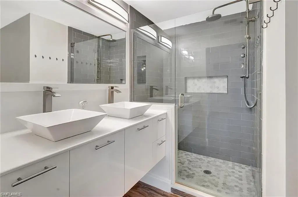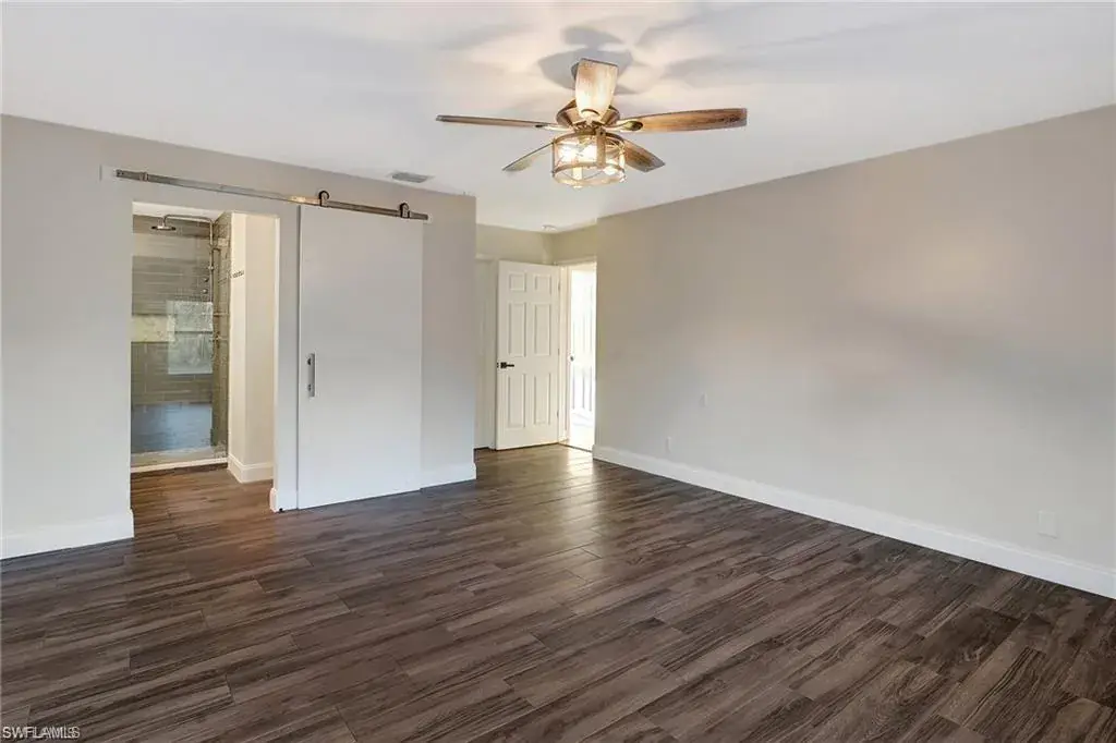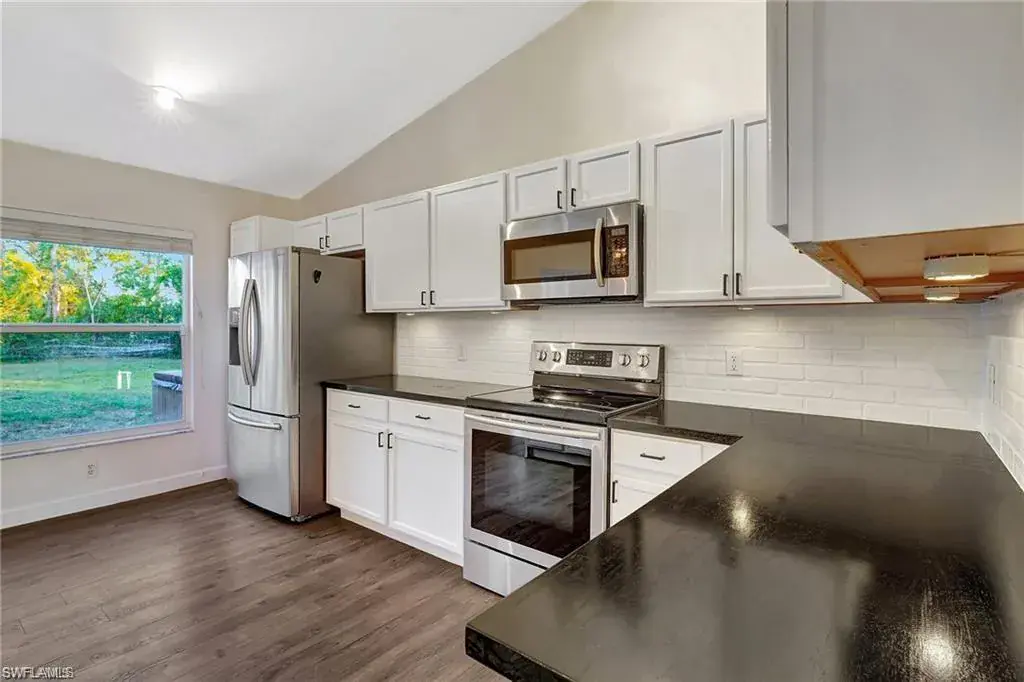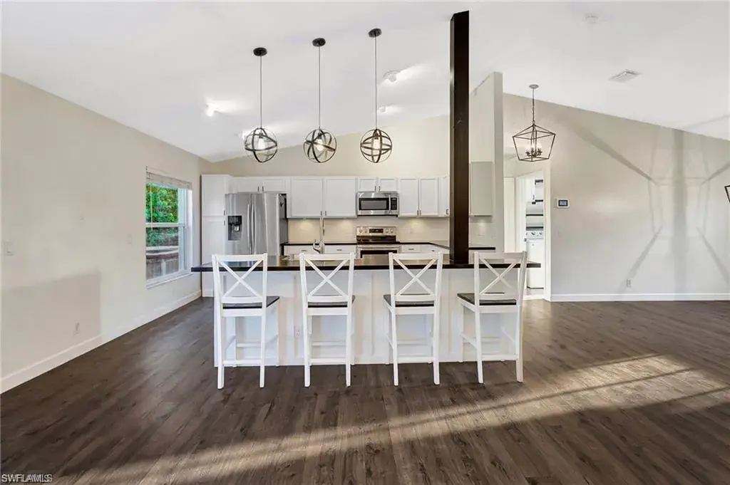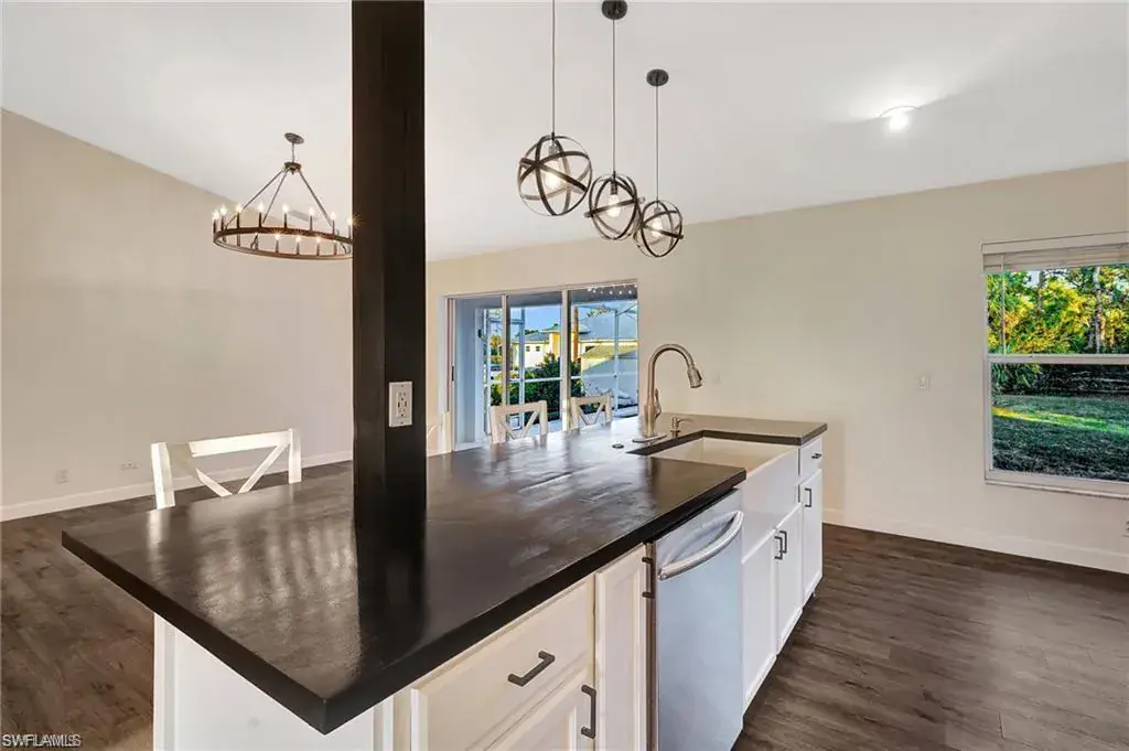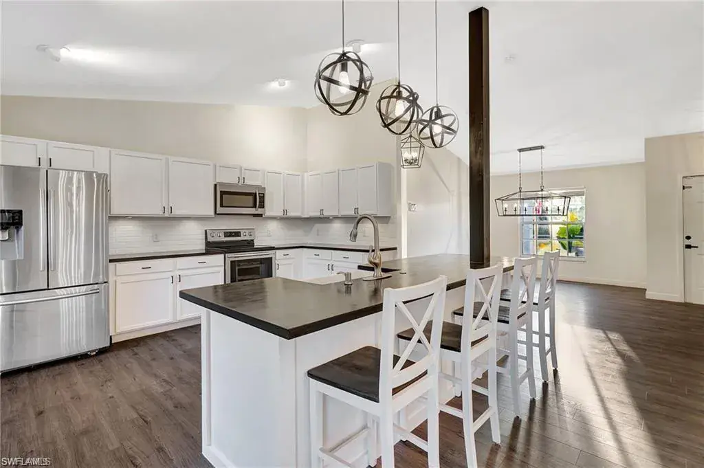 The heart of the home features a modern kitchen with an island, butcher block countertops, stainless steel appliances, and updated light fixtures. Throughout the main living areas, you’ll love the luxury vinyl flooring and smart lighting for both style and convenience.