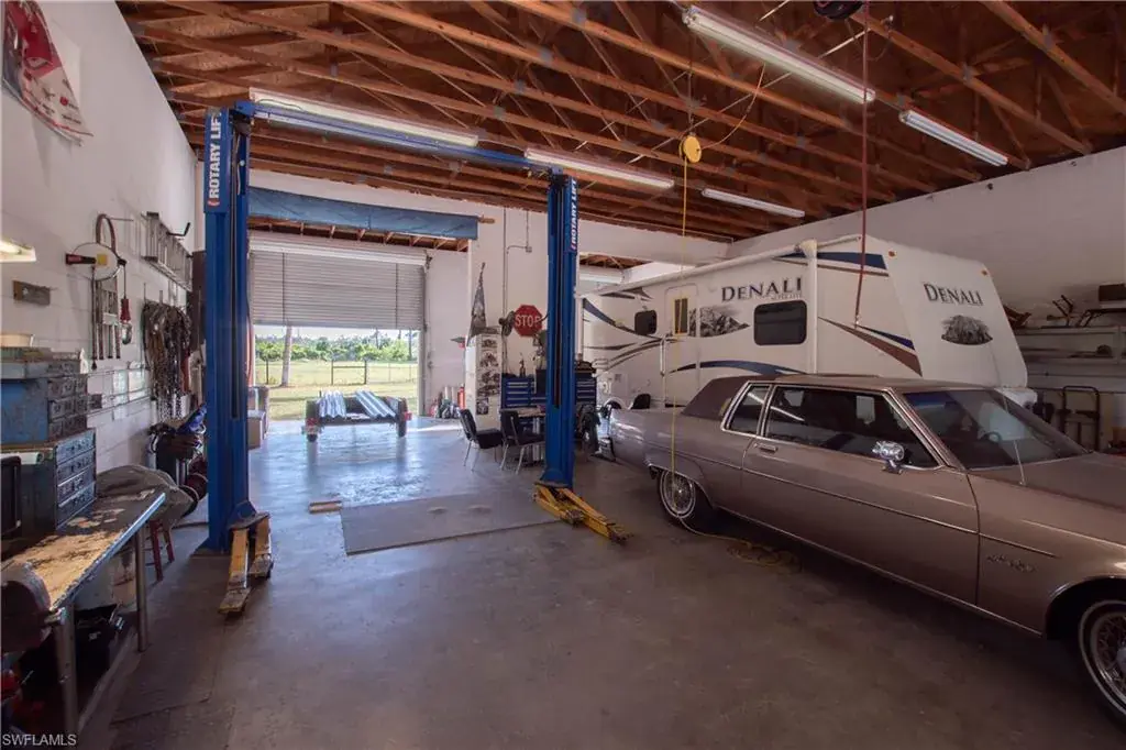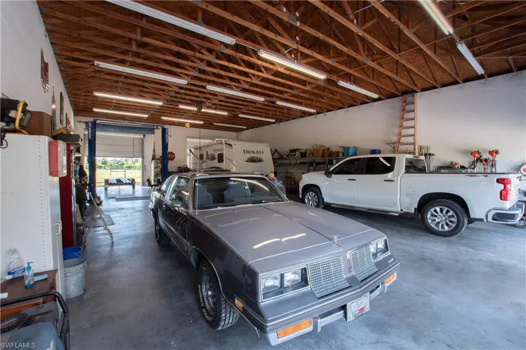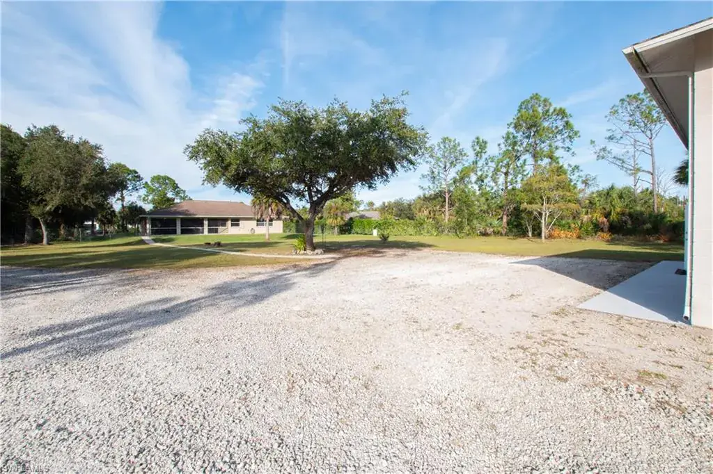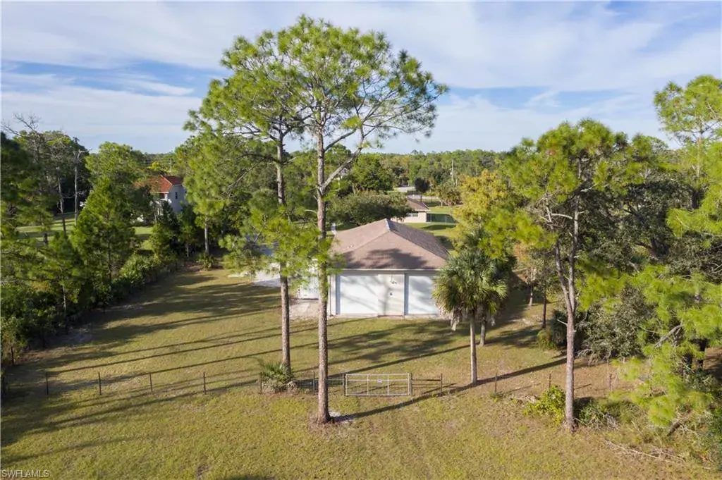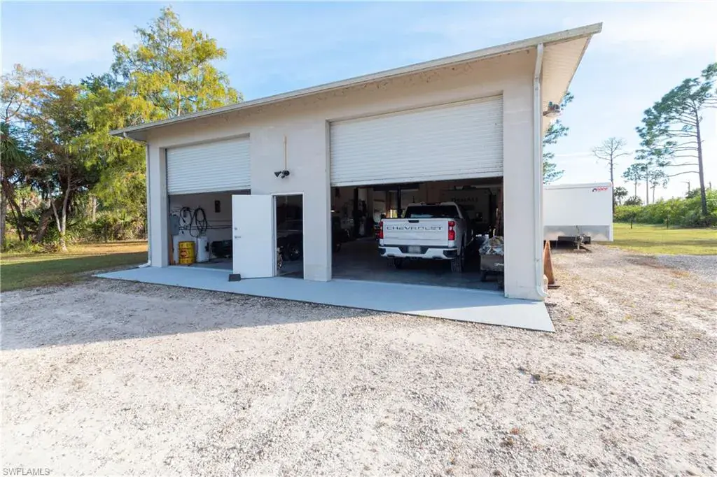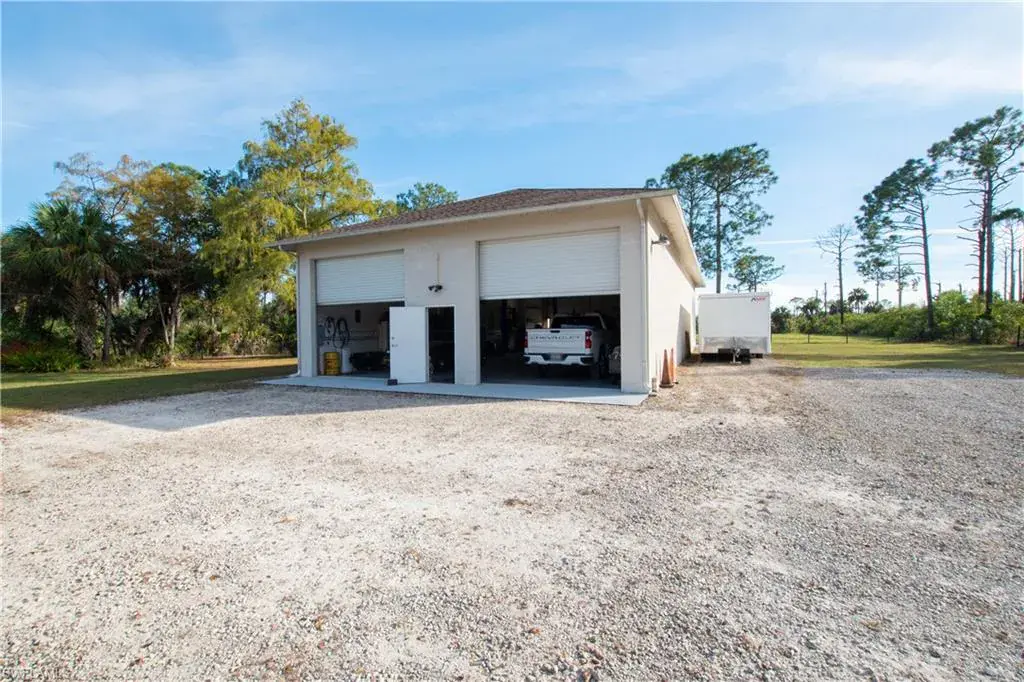Welcome to Golden Gate Estates. Embrace the possibilities of having a home and shop on 3.09 pristine acres, already cleared, fenced and gated. This 3-bedroom, 2-bath home blends comfort and function with tile throughout and vaulted ceilings. The updated Cornerstone kitchen features custom cabinetry, two pantries, and a hidden storage nook. The primary suite offers two walk-in closets and a spa-like bath with soaking tub and walk-in shower. Pocketing sliders open to the screened lanai and view of the huge backyard, ready for any size pool you can imagine. A 2017 roof, 2025 A/C and hurricane shutters provide peace of mind. The 35×70 CBS shop has four 12-foot doors allowing easy pull-through for large trailers and RVs. Not just for storage, this shop is set up for work; with a car lift, air compressor and power hookups along both side walls and there’s even a paint booth. Outside the shop there’s plenty of room to maneuver long trailers and a reinforced gravel parking area for a larger motorhome. At the rear of the property you’ll find a shooting range and a berm along the property line to create a landscaped buffer from Immokalee Rd. Located in a highly sought-after section of Golden Gate Estates, off Wilson Blvd north of Immokalee Road. Just one intersection away from the nearest Publix shopping center and fire station.