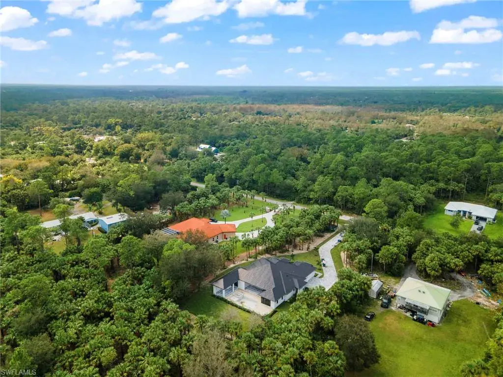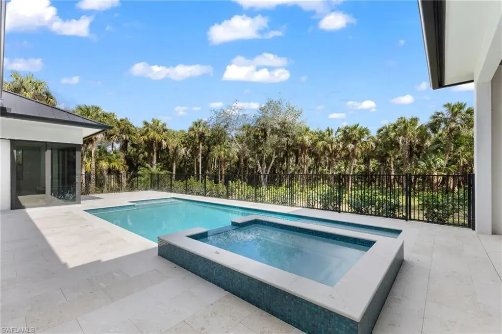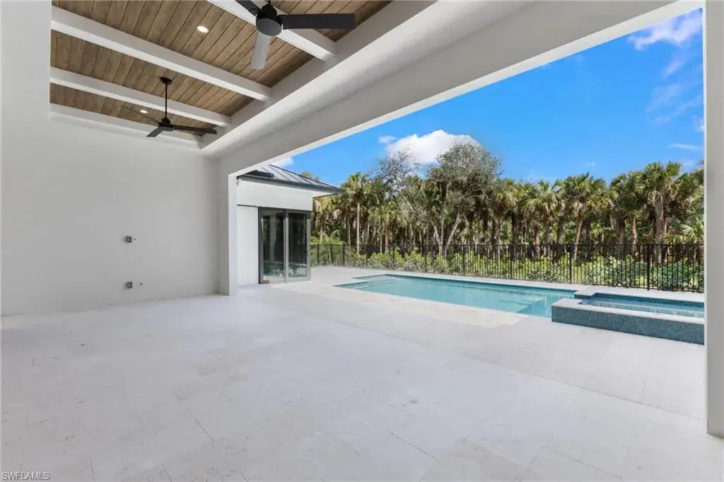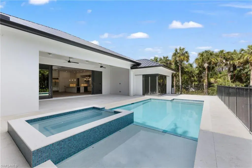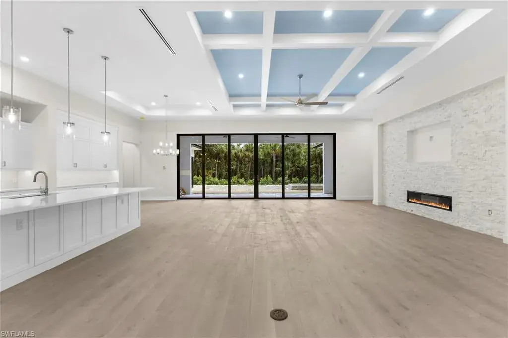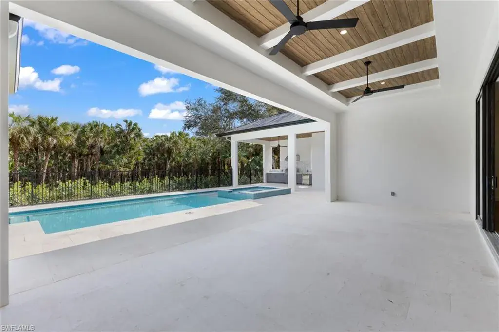 Welcome to a masterpiece of luxury living! This brand-new estate residence, completed to the highest standards, is situated on a sprawling 2.27-acre, 100% certified upland lot in one of Naples’ most desirable locations. With 5,812 sq ft under roof, this home offers an exceptional blend of opulence, functionality, and serenity. Step inside to discover 5 bedrooms, 4 private en-suite full bathrooms, and 1 half bathroom, all thoughtfully designed with impeccable attention to detail. The Master and Junior Suites open directly to the pool, spa, and a stunning outdoor living area, featuring natural sandstone flooring, an outdoor kitchen and an oversized covered lanai—perfect for entertaining or relaxing in your private retreat. The fifth bedroom, thoughtfully positioned off the front entrance, doubles as an elegant home office. The living room features a modern gas fireplace, creating a warm and inviting ambiance, perfect for cozy evenings or hosting guests.