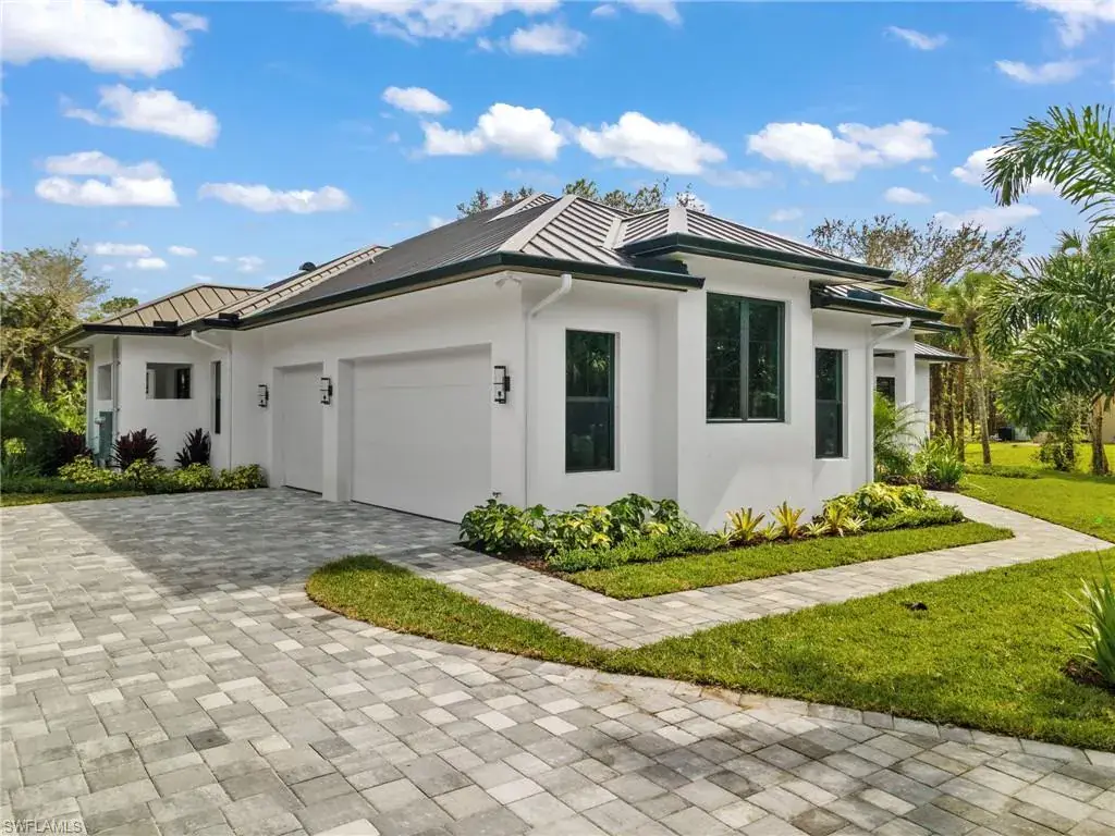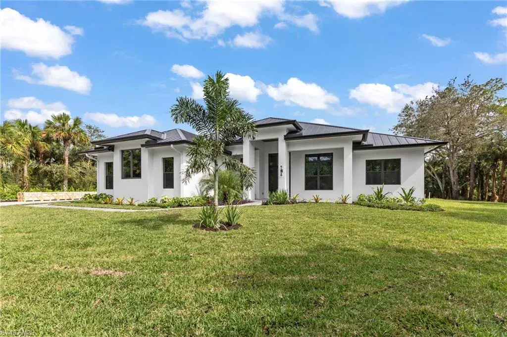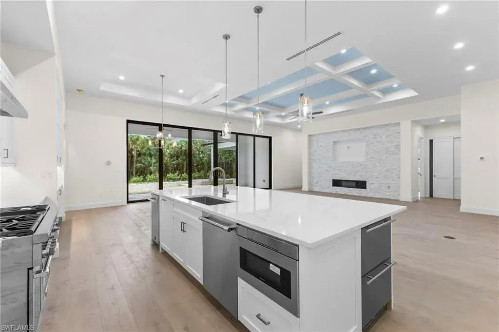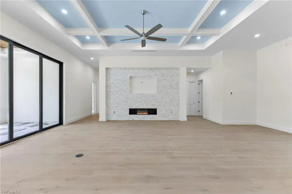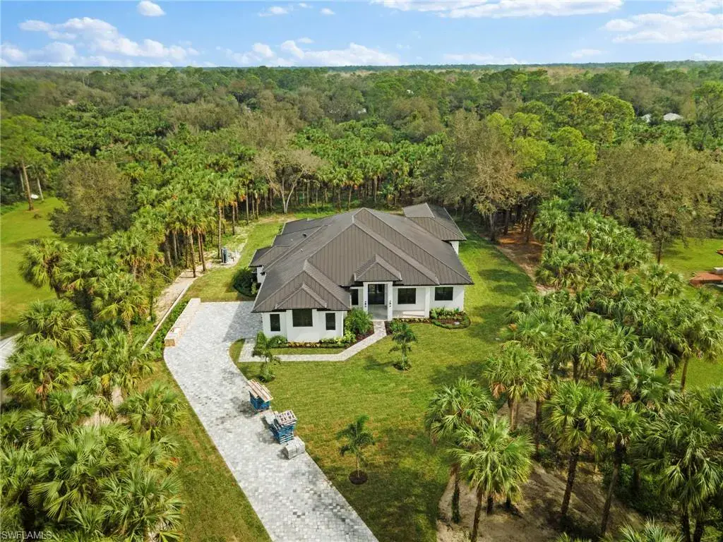 Welcome to a masterpiece of luxury living! This brand-new estate residence, completed to the highest standards, is situated on a sprawling 2.27-acre, 100% certified upland lot in one of Naples’ most desirable locations. With 5,812 sq ft under roof, this home offers an exceptional blend of opulence, functionality, and serenity. Step inside to discover 5 bedrooms, 4 private en-suite full bathrooms, and 1 half bathroom, all thoughtfully designed with impeccable attention to detail. The Master and Junior Suites open directly to the pool, spa, and a stunning outdoor living area, featuring natural sandstone flooring, an outdoor kitchen and an oversized covered lanai—perfect for entertaining or relaxing in your private retreat. The fifth bedroom, thoughtfully positioned off the front entrance, doubles as an elegant home office. The living room features a modern gas fireplace, creating a warm and inviting ambiance, perfect for cozy evenings or hosting guests.