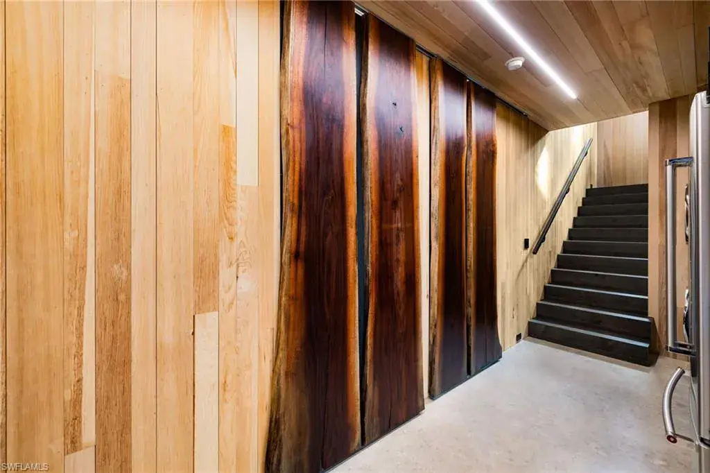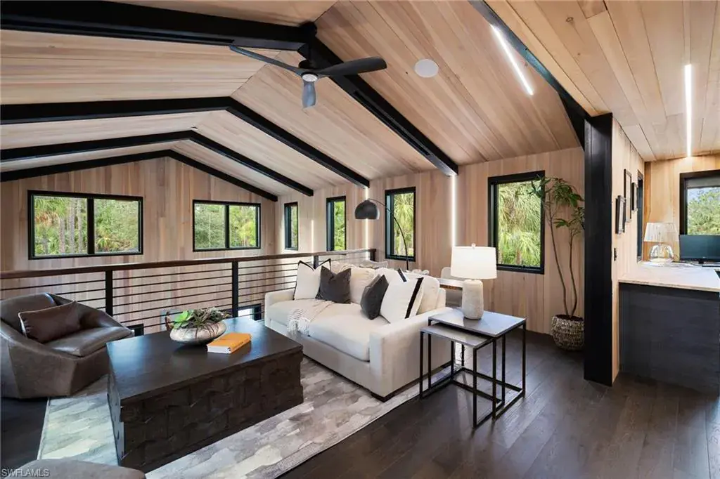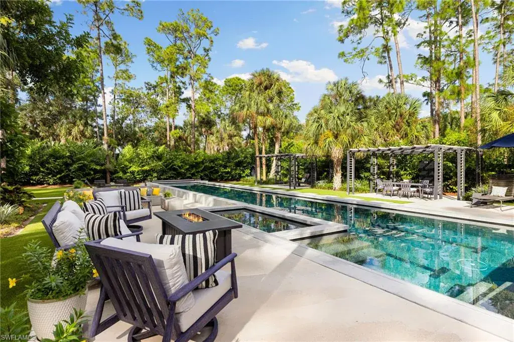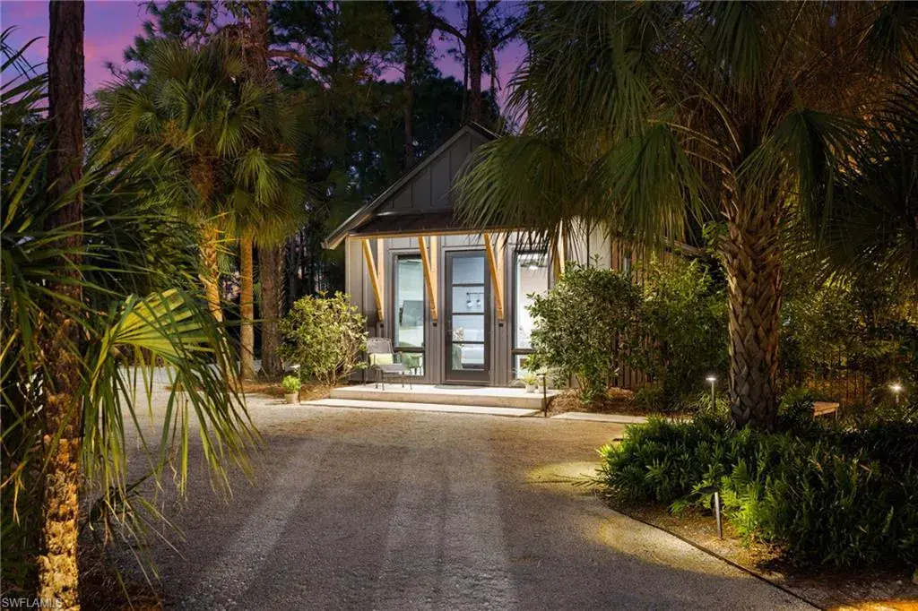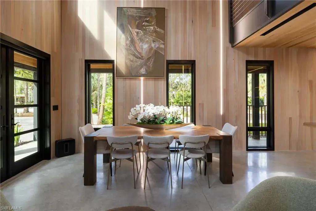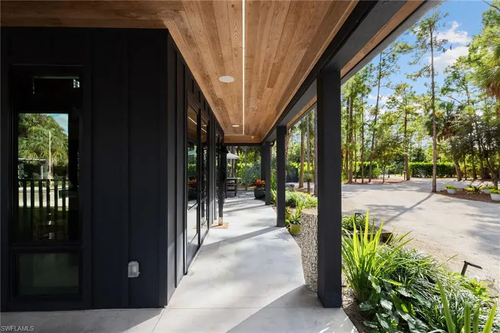 Naples Custom Masterpiece, where Luxury meets Design! This exceptional Naples residence (being offered turnkey) featured in Gulfshore Life’s 2022 Annual Home Edition and featured in various commercials, showcases the artful craftsmanship of custom furniture by a local designer. Every element reflects a deep connection to Florida’s authentic landscape, blending modern design, sustainability, and artisanal detail. The main home was designed with a focus on energy efficiency, the home features lcynene spray foam insulation, Andersen 400 Series low-E impact windows, and a standing seam metal roof. The open-concept layout enhances natural flow and light, with sugar pine interior walls, polished concrete floors, and custom steel-framed windows and doors offering timeless style. The gourmet kitchen is a showpiece of design and function, with solid walnut cabinetry, stainless steel accents, and high-end appliances including a Viking dual-fuel range, Dacor tower refrigerator, and Viking dishwasher. A striking walnut island and custom Guanacaste slab dining table complete the space. Two luxurious bathrooms feature floor-to-ceiling quartz slab showers, the downstairs bath with live-edge walnut and steel custom door and the second floor a sugar pine door, and TOTO washlets. Bedrooms include Pranasleep adjustable beds and custom-built furnishings. Upstairs, Legno Bastone oak flooring, custom cabinetry, and designer furnishings define the loft and office areas. Smart-home integration includes LED lighting, Sonos sound system, fiber optic connectivity, and comprehensive security cameras. Enjoy resort-style living in the luxurious outdoor spaces featuring a 12′ x 75′ two-lane lap pool and spa with detailed design, hydraulic solar-assisted cover, synthetic turf, and custom pergolas. Two fire pit areas, Sonos-integrated outdoor speakers, and the lush landscaping create a serene private retreat perfect for entertaining. The fully equipped 422 sq ft guest house offers a complete kitchen, laundry hookups, and the same impeccable finishes—sugar pine walls, concrete floors, and solid quartz walk-in shower. Ideal for guests, in-laws, or a private studio. Two carports, a climate-controlled 4,000 sq. ft. motor lounge with bay doors at both ends plus a second-floor cigar lounge and bar with floor to ceiling windows, a downstairs office space with kitchen and bath, plus additional storage containers and coop with hen house that can be converted to a dog kennel. Additional features include: 400-amp electrical service and solar-supported systems, soft-start HVAC system with linear vents, reverse osmosis water system with UV light, hardie board siding with custom cypress soffits and porch ceilings, fenced dog run and irrigation using well water for sustainability. This home is a true blend of artistry, functionality, and eco-conscious design — and embodies modern Naples living at its finest, with endless possibilities!