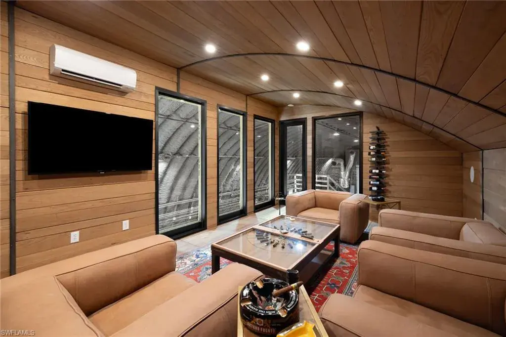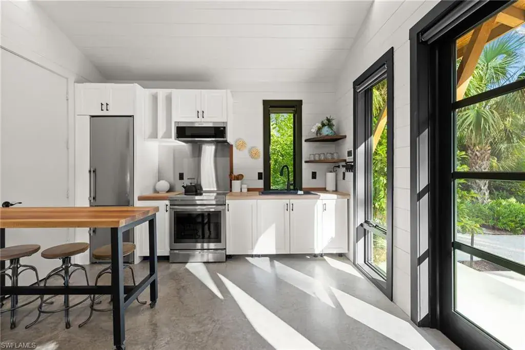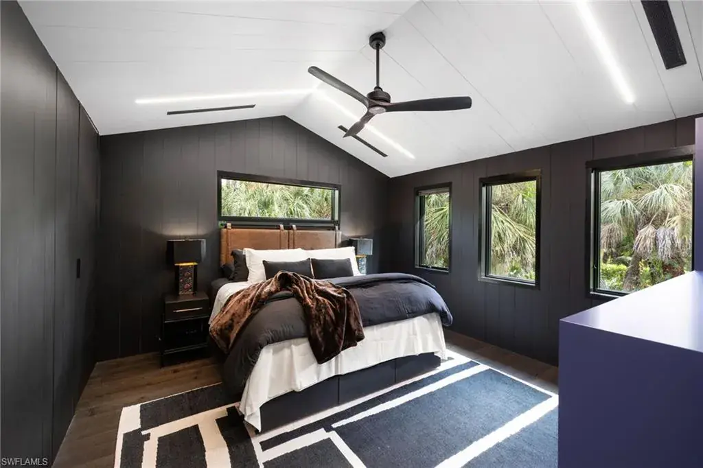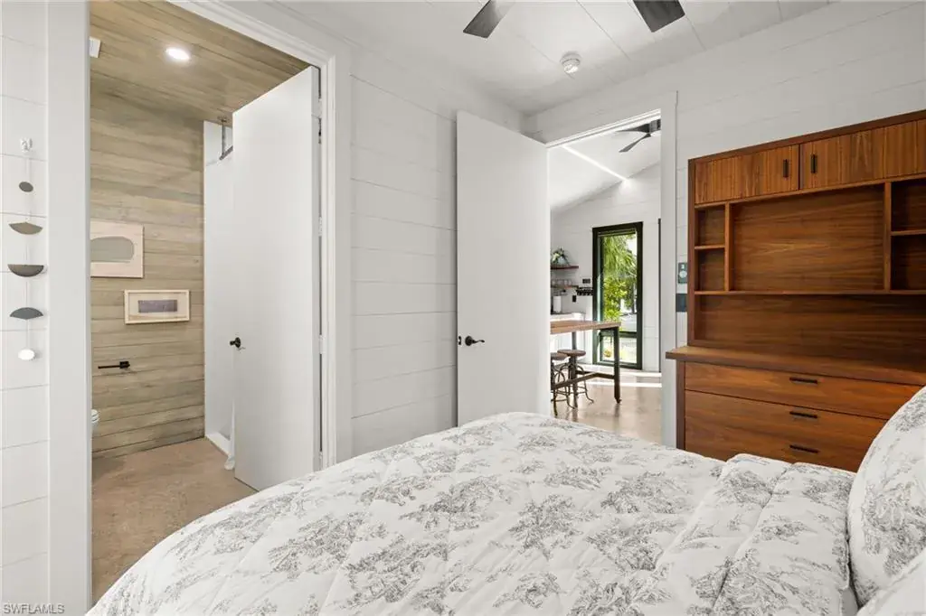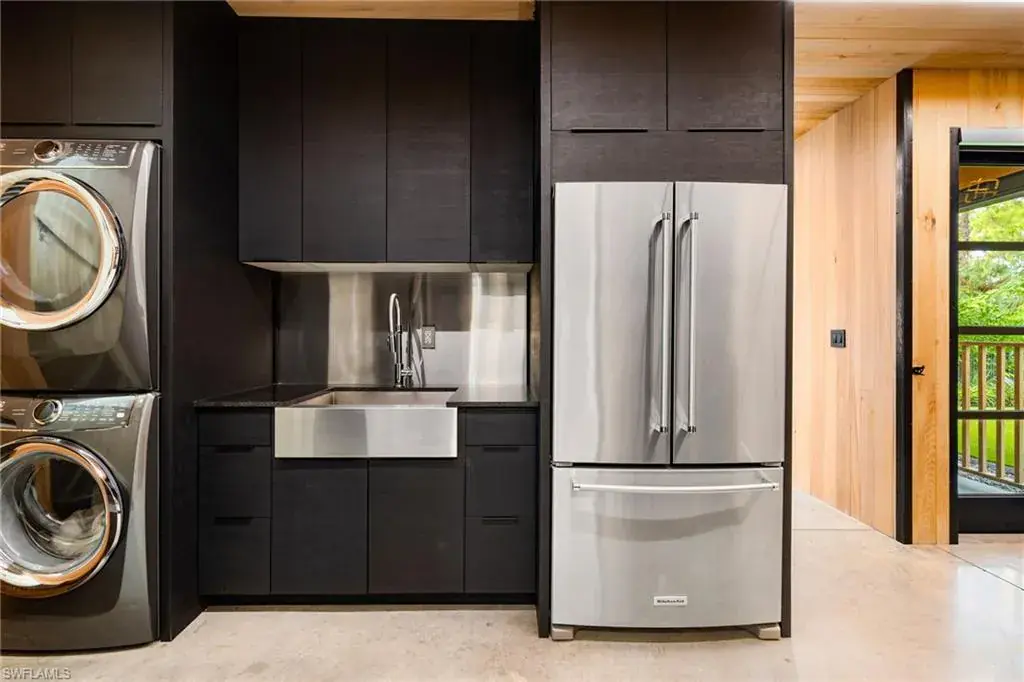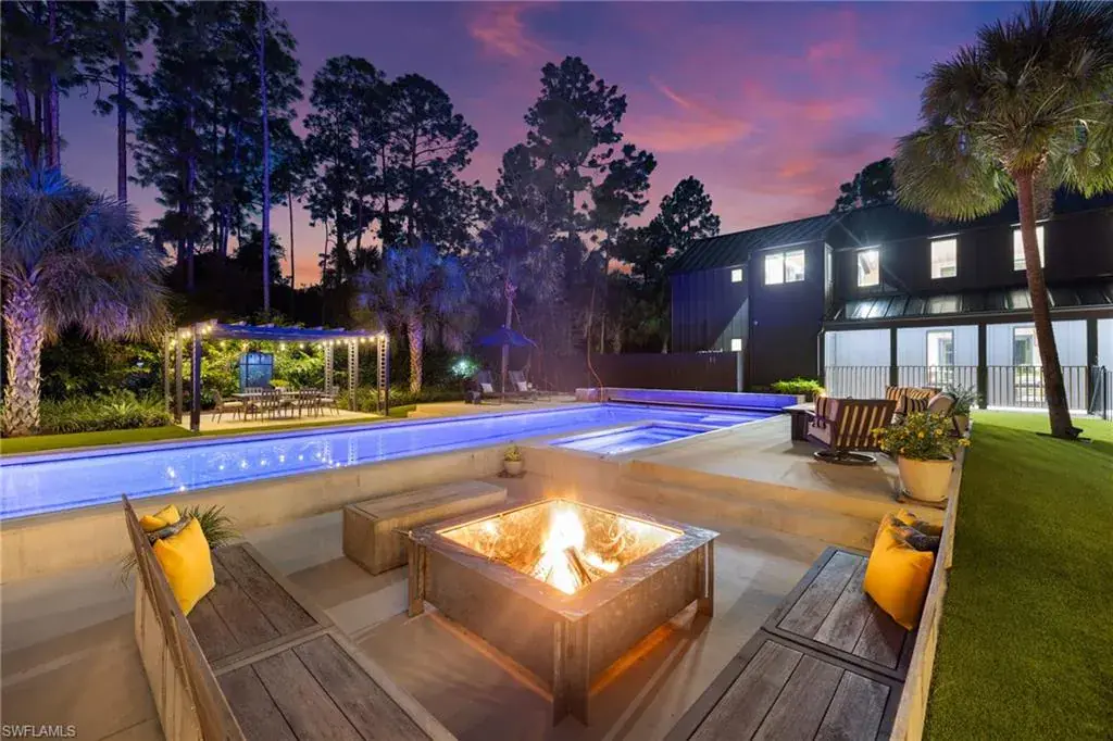 Naples Custom Masterpiece, where Luxury meets Design! This exceptional Naples residence (being offered turnkey) featured in Gulfshore Life’s 2022 Annual Home Edition and featured in various commercials, showcases the artful craftsmanship of custom furniture by a local designer. Every element reflects a deep connection to Florida’s authentic landscape, blending modern design, sustainability, and artisanal detail. The main home was designed with a focus on energy efficiency, the home features lcynene spray foam insulation, Andersen 400 Series low-E impact windows, and a standing seam metal roof. The open-concept layout enhances natural flow and light, with sugar pine interior walls, polished concrete floors, and custom steel-framed windows and doors offering timeless style. The gourmet kitchen is a showpiece of design and function, with solid walnut cabinetry, stainless steel accents, and high-end appliances including a Viking dual-fuel range, Dacor tower refrigerator, and Viking dishwasher. A striking walnut island and custom Guanacaste slab dining table complete the space. Two luxurious bathrooms feature floor-to-ceiling quartz slab showers, the downstairs bath with live-edge walnut and steel custom door and the second floor a sugar pine door, and TOTO washlets. Bedrooms include Pranasleep adjustable beds and custom-built furnishings. Upstairs, Legno Bastone oak flooring, custom cabinetry, and designer furnishings define the loft and office areas. Smart-home integration includes LED lighting, Sonos sound system, fiber optic connectivity, and comprehensive security cameras. Enjoy resort-style living in the luxurious outdoor spaces featuring a 12′ x 75′ two-lane lap pool and spa with detailed design, hydraulic solar-assisted cover, synthetic turf, and custom pergolas. Two fire pit areas, Sonos-integrated outdoor speakers, and the lush landscaping create a serene private retreat perfect for entertaining. The fully equipped 422 sq ft guest house offers a complete kitchen, laundry hookups, and the same impeccable finishes—sugar pine walls, concrete floors, and solid quartz walk-in shower. Ideal for guests, in-laws, or a private studio. Two carports, a climate-controlled 4,000 sq. ft. motor lounge with bay doors at both ends plus a second-floor cigar lounge and bar with floor to ceiling windows, a downstairs office space with kitchen and bath, plus additional storage containers and coop with hen house that can be converted to a dog kennel. Additional features include: 400-amp electrical service and solar-supported systems, soft-start HVAC system with linear vents, reverse osmosis water system with UV light, hardie board siding with custom cypress soffits and porch ceilings, fenced dog run and irrigation using well water for sustainability. This home is a true blend of artistry, functionality, and eco-conscious design — and embodies modern Naples living at its finest, with endless possibilities!