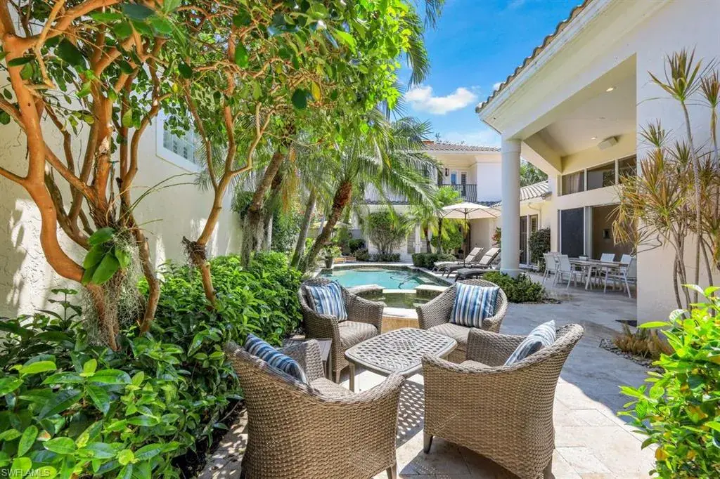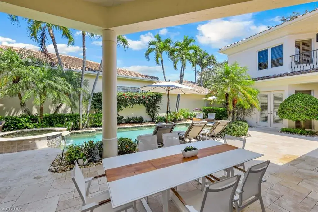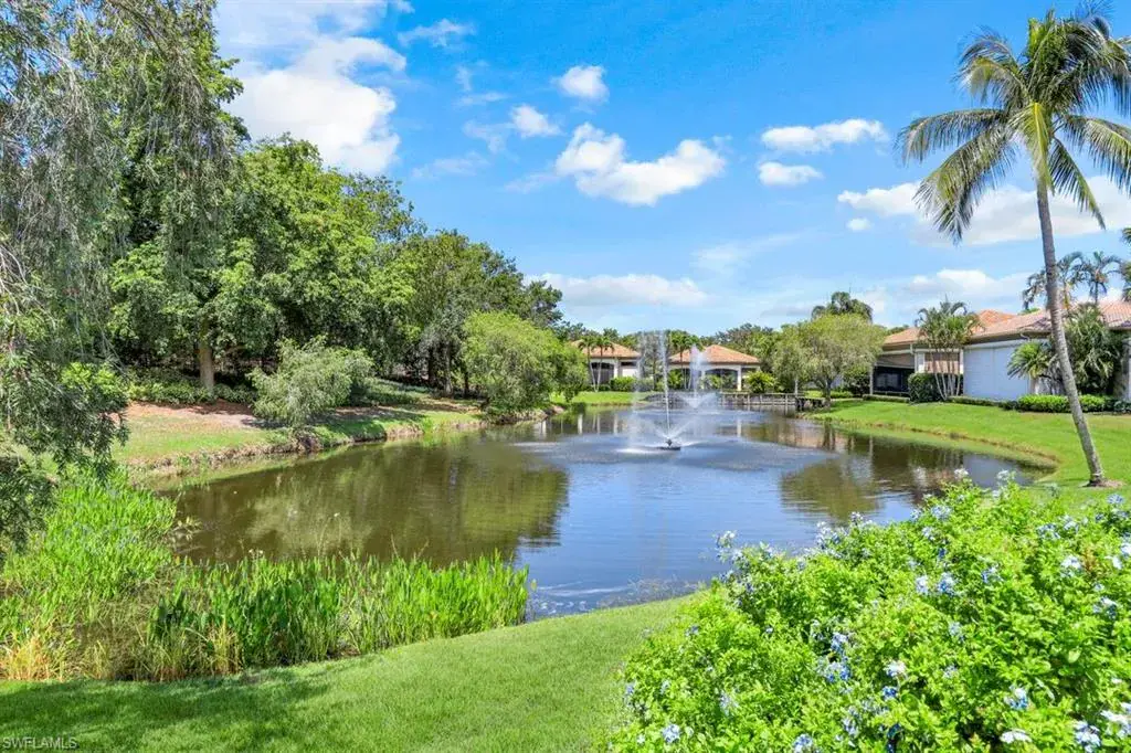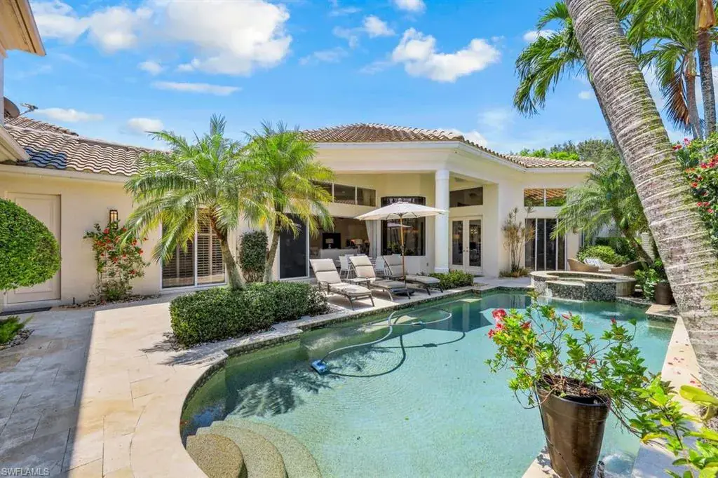 H10348 N Naples Country Club community next to Mercato! Grand Isle closest to US 41 breathtaking fountain gated entrance (1 of 3 gated entrances.) Lovely courtyard home flaunts large pool and spa surrounded by a colorful garden setting, guest Cabana w/kitchenette/wine cooler/plumbed gas grilling area. Inside enjoy lg open rooms, soaring ceilings, French Oak wide plank wood flooring, updated bathrooms, Lutron light system, sound music system, water filter, 2 water heaters, gas cooking, wine cooler, electric shutters/blinds, lg his/her closets, Smart Home wifi, AC disinfecting system, landscape lighting & 2 car garage. Lanai overlooks breezy backyard w/sparkling fountain lake views & wildlife galore! Certified roof inspection performed recementing ridges & tiles plus an application of a protective barrier spray on 5/18/23. HOA covers anti-mildew to roofs yearly, exterior painting every 6 yrs + Community Center usage: tennis, bocce, spa, restaurant/bar perfect for socializing. Bask in Naples’ sunny beaches/watersports, Mercato/Waterside Shops, delectable dining, golf, tennis, Artis performances, museums and so much more all a short distance from your new home in popular Pelican Marsh!