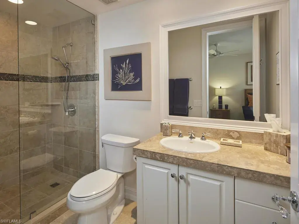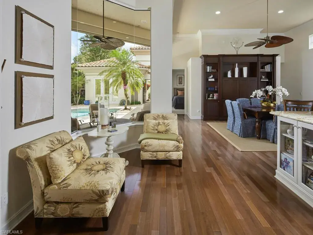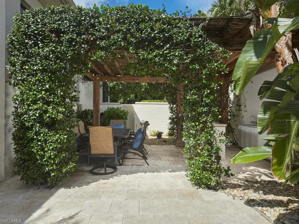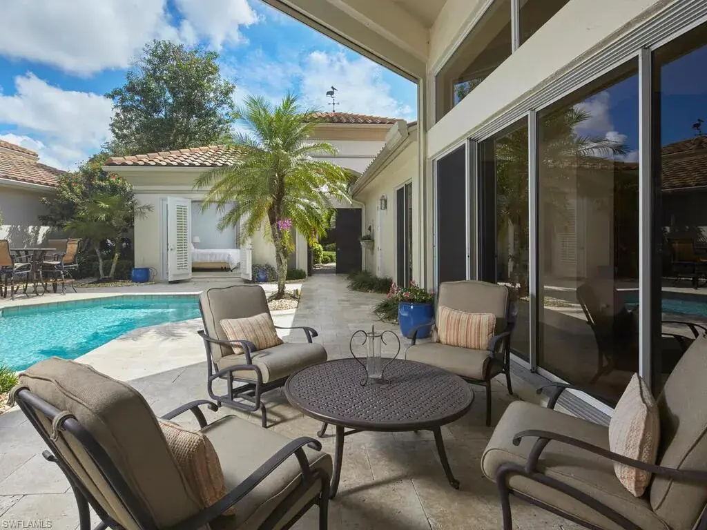 Tucked within the exclusive gates of Grand Isle at Pelican Marsh, this luxury courtyard home blends elegance, privacy, and resort-style living in the heart of Naples. The main residence offers two spacious bedrooms plus a den and two and a half baths, showcasing rich dark wood floors that add warmth and sophistication throughout. Across the tranquil courtyard, a private guest casita provides an additional bedroom and full bath, ideal for visitors or a home office retreat.