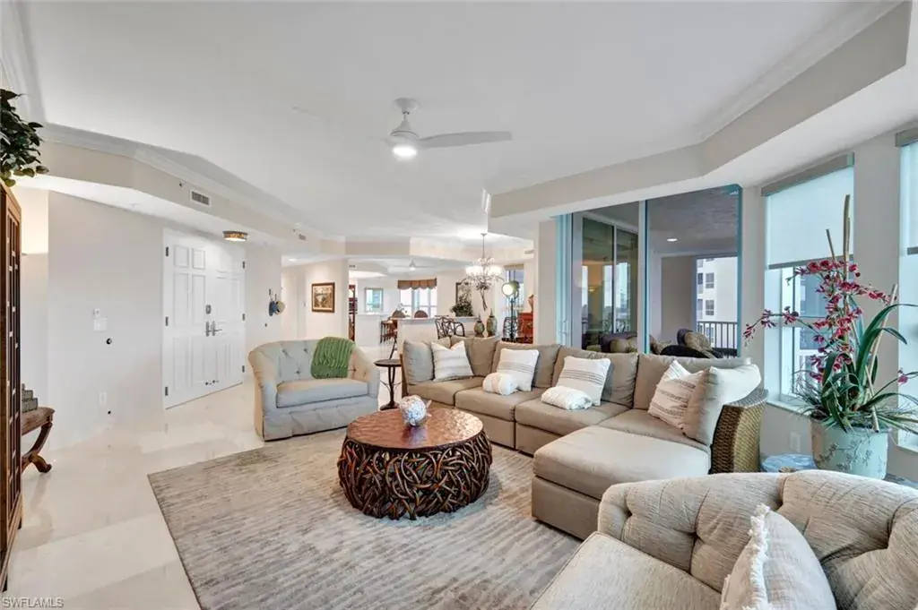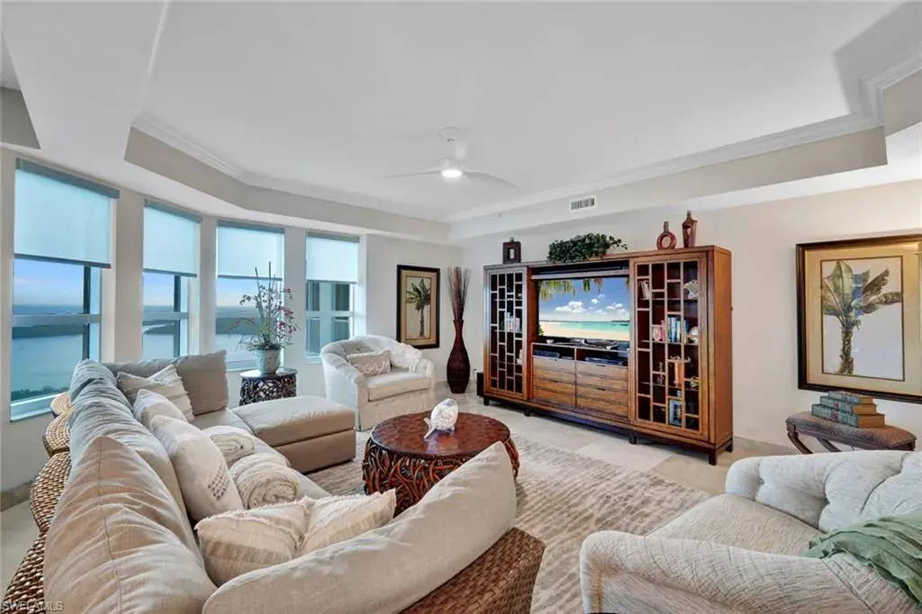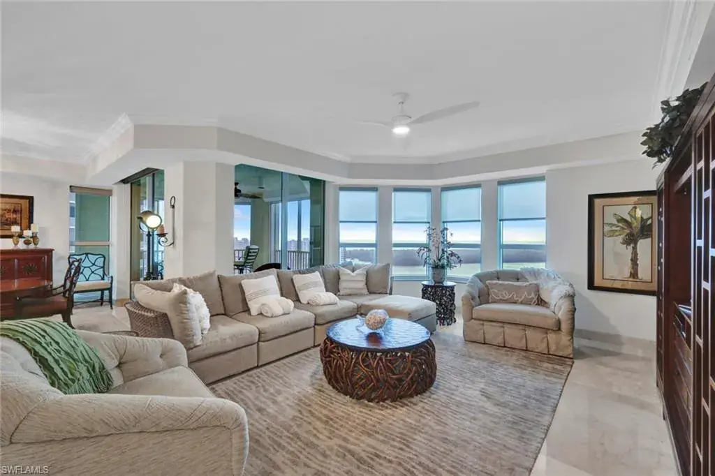 Enter the living room from your secured elevator and be greeted with stunning views of the Gulf and Turkey Bay. This 3,400 sq ft open floor plan end unit is light and bright and an entertainer’s dream. The kitchen features quartz counters, SS GE Monogram appliances, a wine cooler and breakfast nook. The spacious primary suite is separated from the two guest suites (each with bath ensuite), providing ultimate privacy for you and your guests. Enjoy panoramic views and gorgeous sunsets on the wrap-around lanai. Grande Excelsior residents have two, deeded, under building parking spaces; a pool and spa, barbecue area, and a fitness room. Available is membership in the exclusive FLORIDIAN BEACH CLUB, with casual dining, a bar, pool, beach chairs, towels, and service on the sand. Included in your HOA dues is access to The Club at the Dunes, featuring fine dining, an indoor-outdoor restaurant, resort pool, tiki bar, state-of-the-art fitness center and staffed tennis facility. Need more space for friends or family visit? Efficiency suites are available for rent by Dunes owners. These 5 Star Resort Amenities are why The Dunes is the Premier Coastal Community in Naples. And, Pet Friendly!