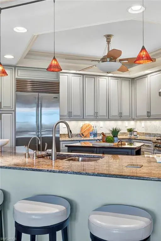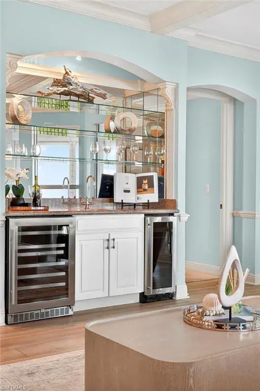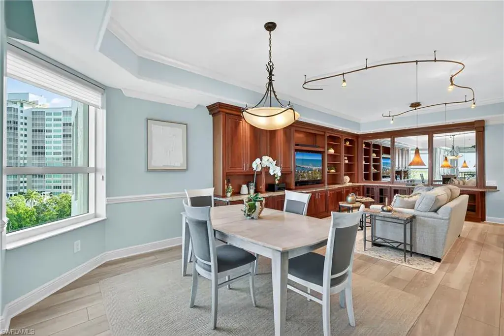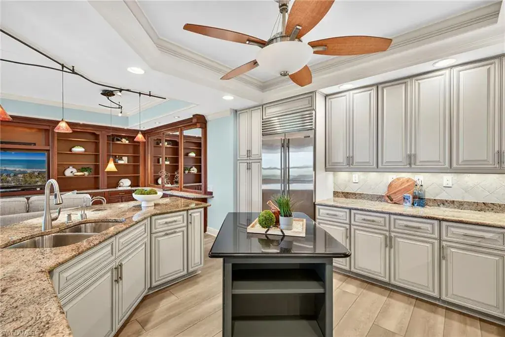 The living room features a stylish wet bar and custom built-in cabinetry, creating an ideal setting for entertaining. The chef’s kitchen is open to the family room and includes a convenient pass-through to the dining area, where Gulf views provide a stunning backdrop. Elegant crown molding and thoughtful details throughout enhance the home’s refined ambiance.