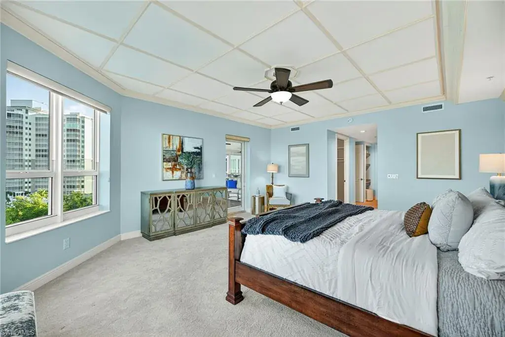 The primary suite offers spectacular views of the Bay and Gulf, along with a luxurious bath featuring a double vanity, soaking tub, and separate shower. A second primary suite doubles as an office or den with access to a private lanai, perfect for work or relaxation. The third guest suite also enjoys its own private balcony, offering comfort and privacy for family and guests.