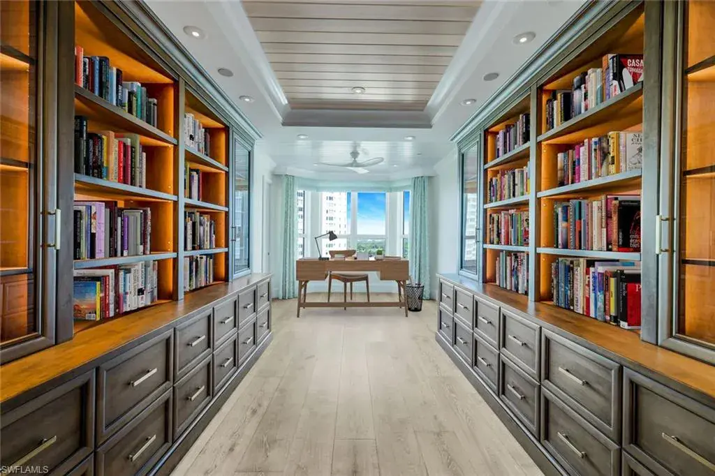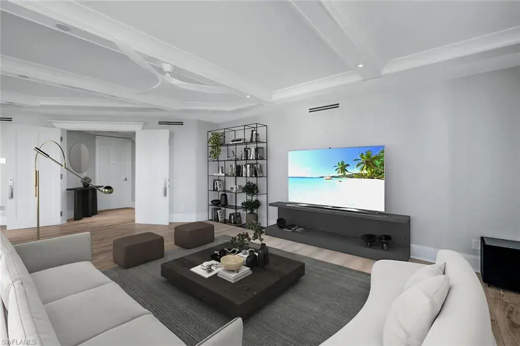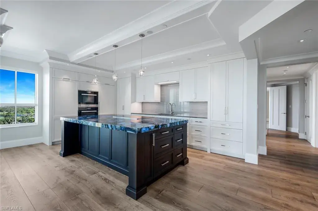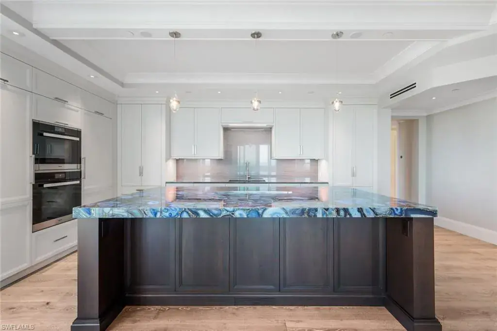Experience the epitome of luxury living in this totally reimagined, one of a kind, 3 bedroom + den residence. With incredible water views. This Grande Preserve residence features Legno Bastone flooring and extensive coffered ceilings throughout. The chef’s dream kitchen boasts a separate full-size freezer and refrigerator, wine cooler, induction cooktop, and an under-lit Antolini Blue Agate island countertop that serves as a striking centerpiece. The spa-like primary bathroom offers ultimate relaxation with a jetted tub and steam shower, while all en-suite bathrooms have been fully remodeled with new cabinets, sleek showers, and under-lit vanities, showcasing impeccable attention to detail. A large wrap-around lanai with sliding glass doors offers an incredible entertainment space featuring an electric grill, perfect for hosting friends or enjoying a quiet retreat. This serene outdoor area provides breathtaking views of Turkey Bay & the Gulf of Mexico, making it an ideal spot to relax and unwind.