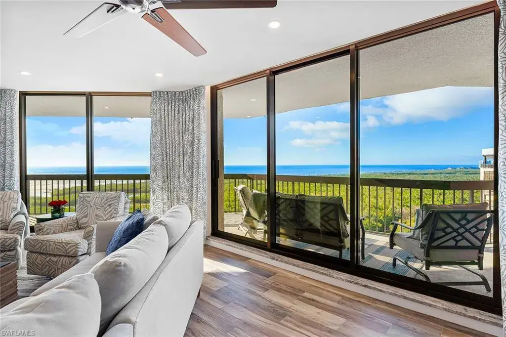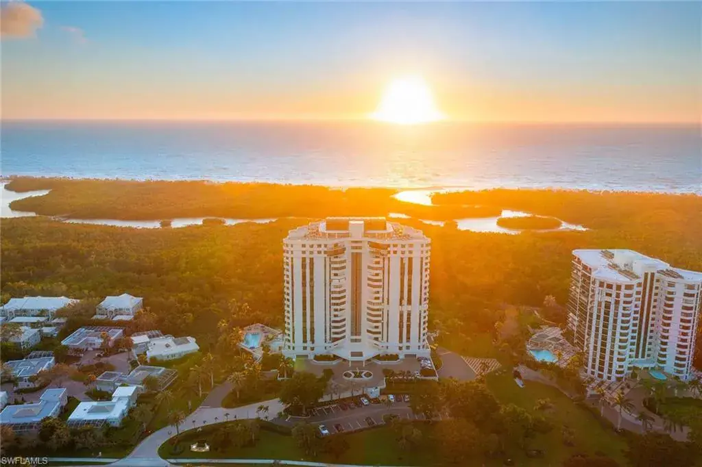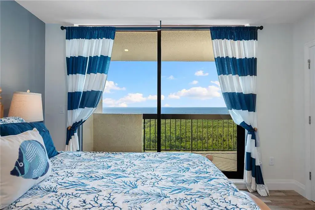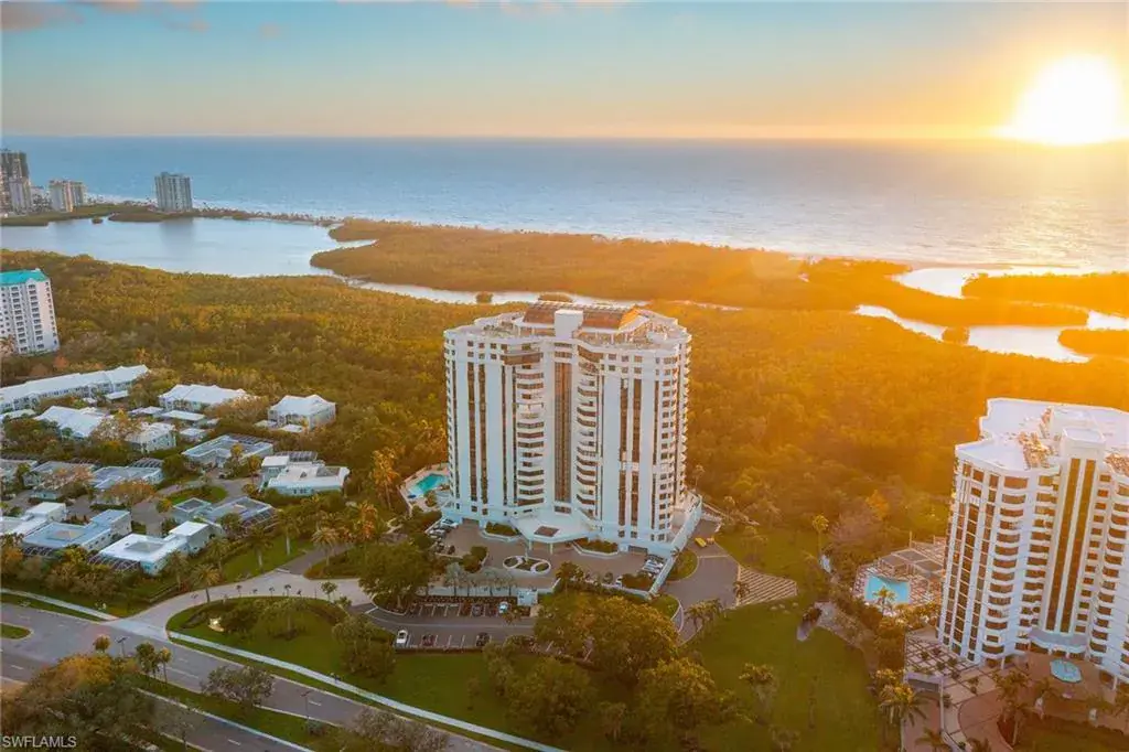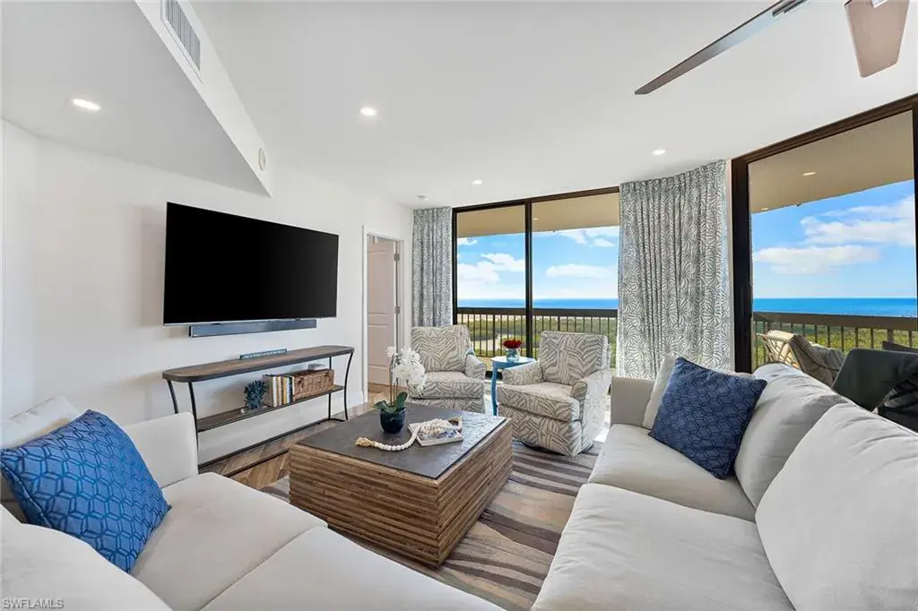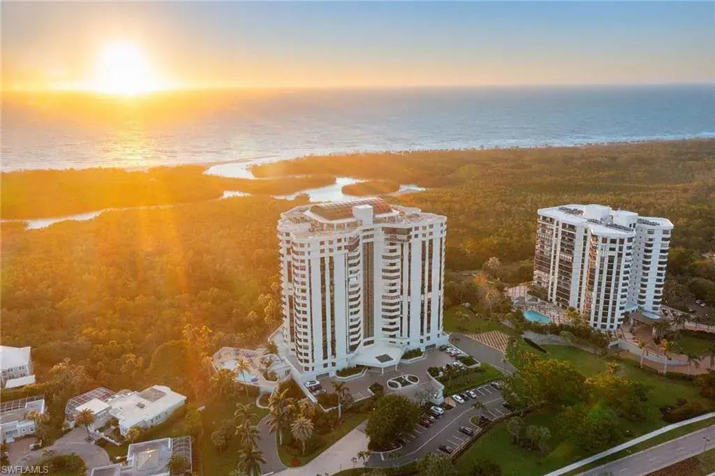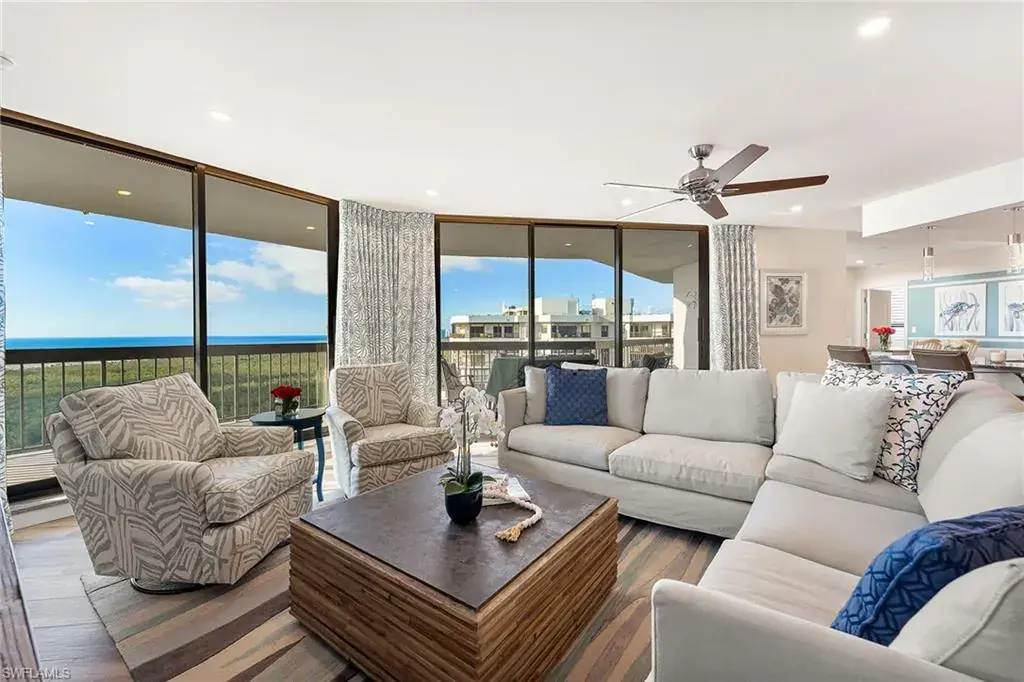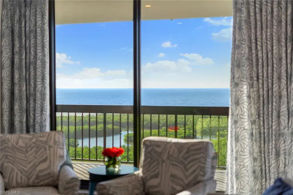 The work is done! Breathtaking 15th-floor views up to Sanibel from the sought-after 04 stack with northwest exposure, beachy vibes and a relaxing perch in the sky. This stunning high-rise retreat boasts a spacious 524-square-foot lanai with no screens ideal for soaking in sunsets, sunrises and endless gulf breezes. Remodeled and professionally designed, this move-in-ready condominium, featured in Home & Design, comes turnkey furnished for effortless luxury. New hurricane impact windows and sliders throughout provide ultimate peace of mind and unobstructed views. The den has a sleeper sofa and TV for guest or bonus room. On the berm, one of the closest buildings to private South Beach and tennis. Top-tier amenities include updated lobby, reimagined social room by EBL Interiors, secure under-building parking, bike storage, three guest suites, three elevators, lap pool with sunny pool deck, barbecue and fitness. Live the Pelican Bay dream. Exclusive private beach club with two beachfront restaurants, cabana service and miles of pristine sand. World-class tennis with 18 Har-Tru courts plus a new racquets center coming soon featuring 20 pickleball and eight tennis.