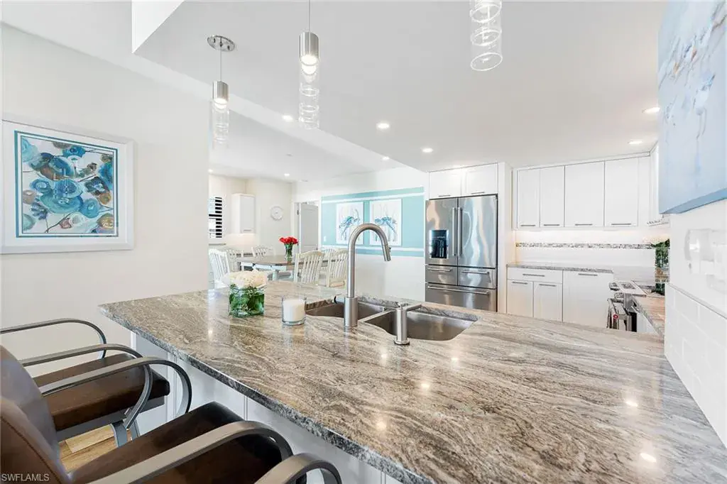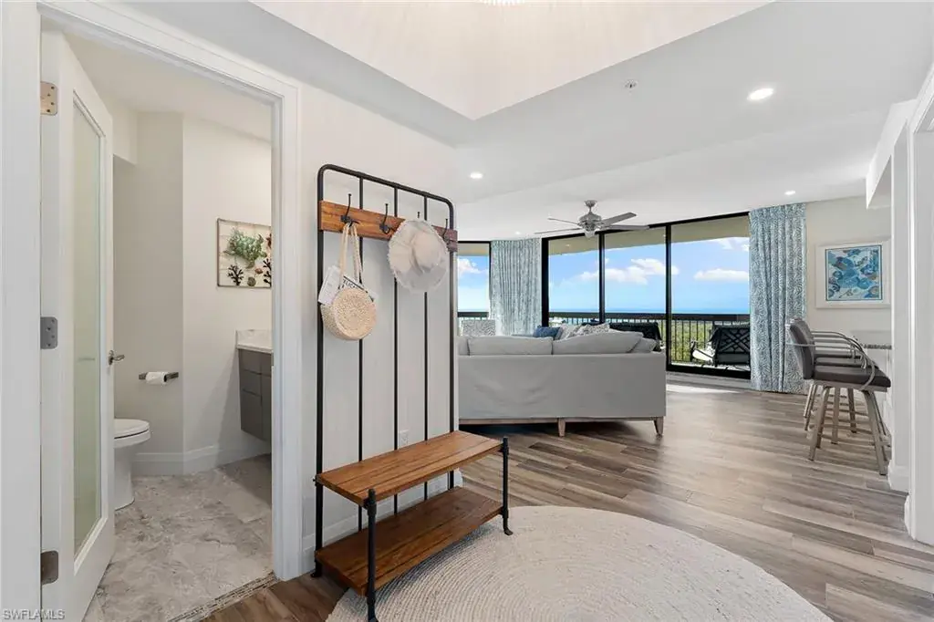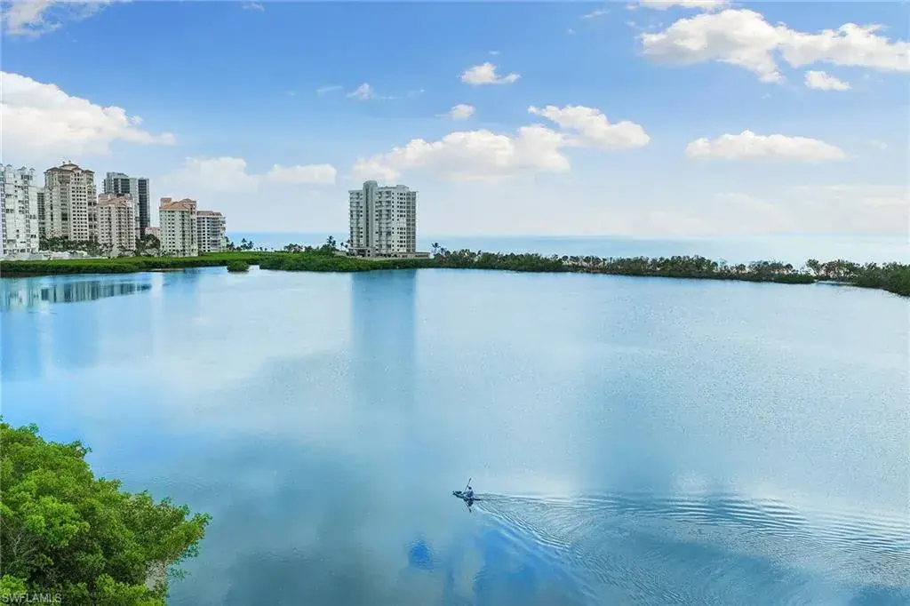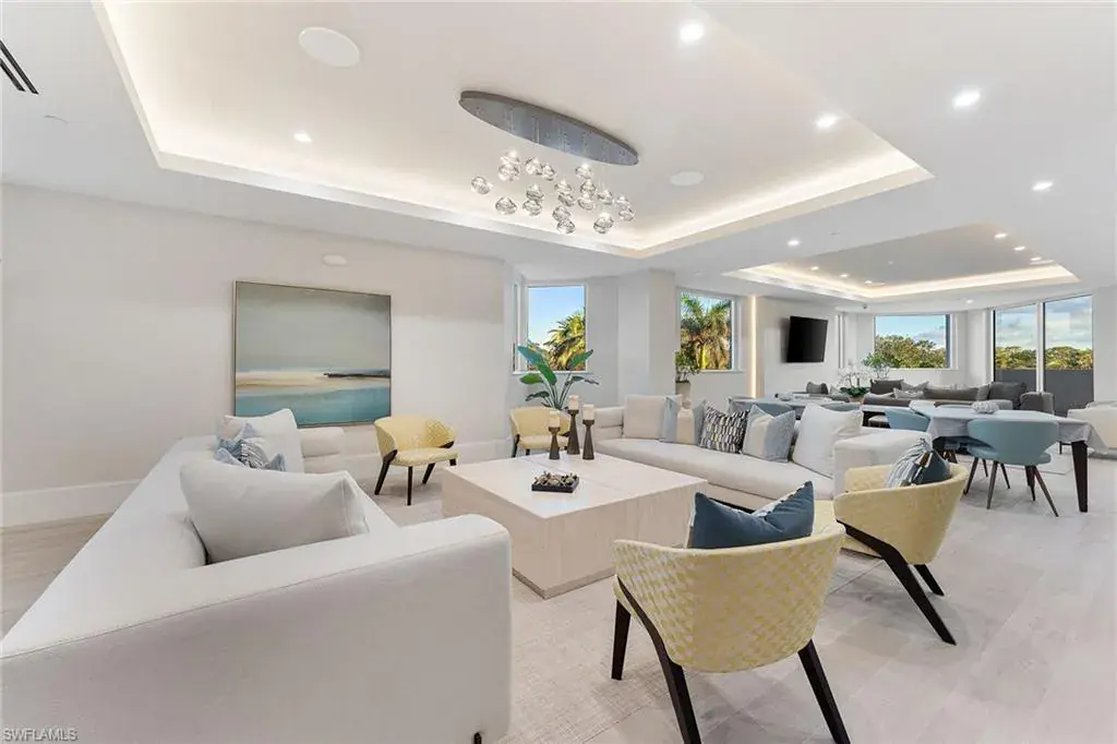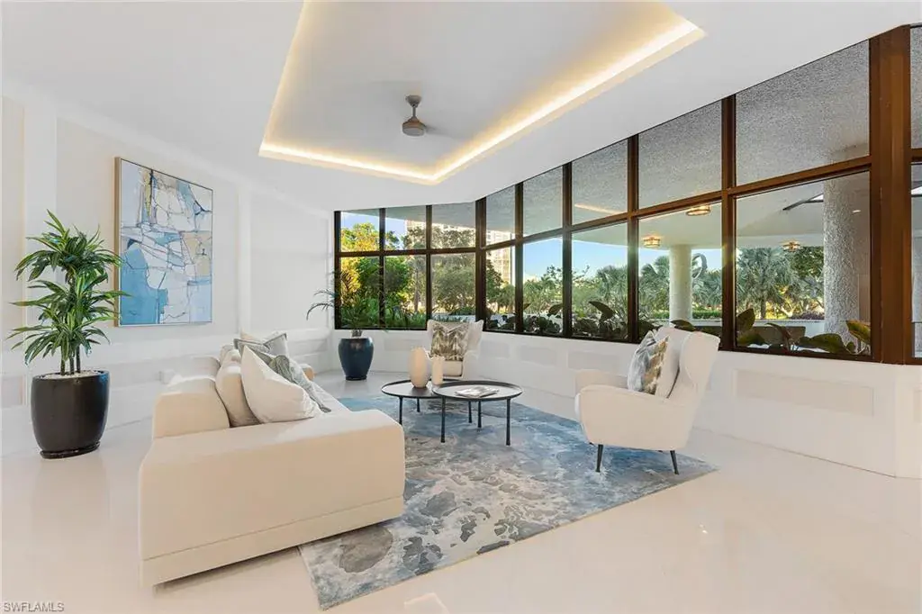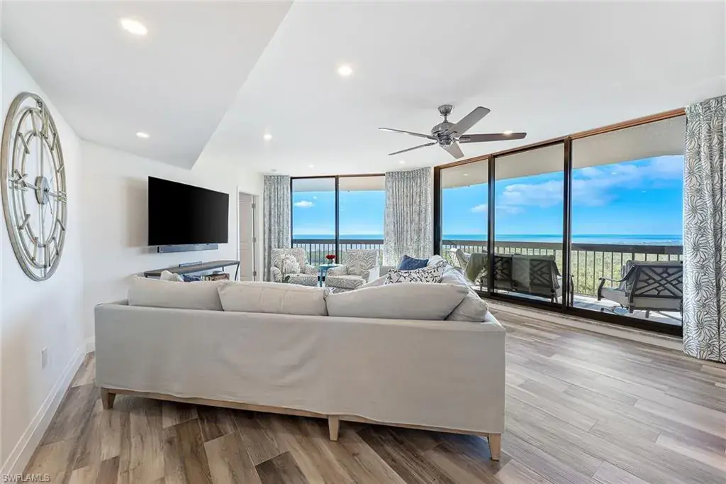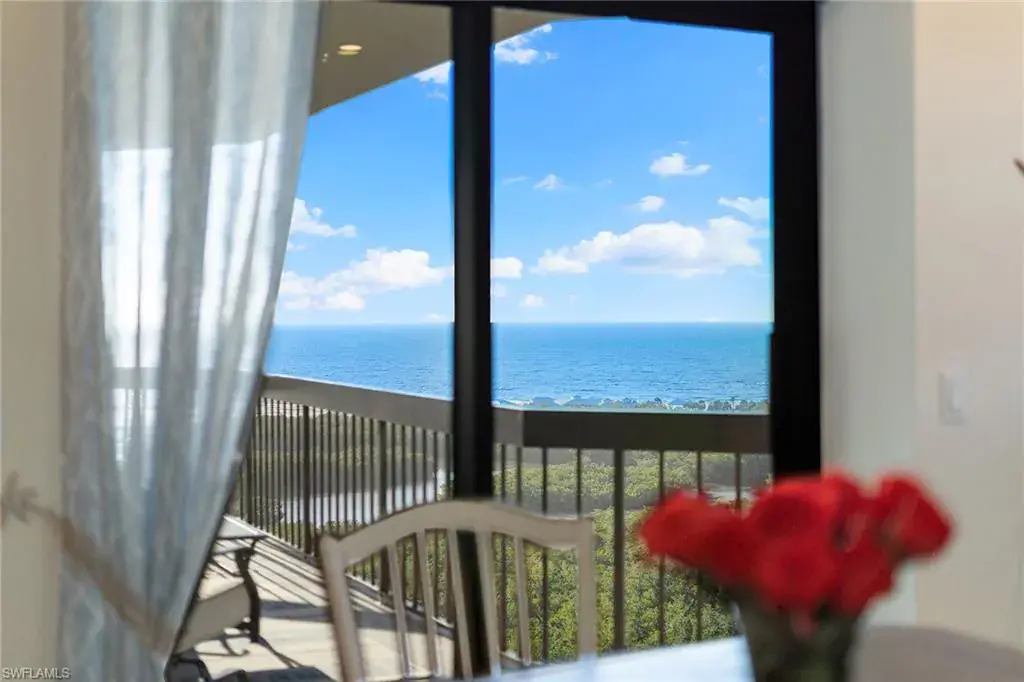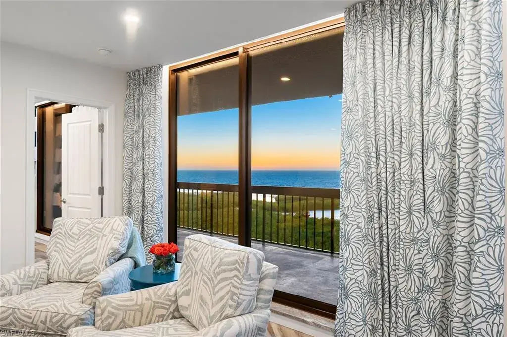 The work is done! Breathtaking 15th-floor views up to Sanibel from the sought-after 04 stack with northwest exposure, beachy vibes and a relaxing perch in the sky. This stunning high-rise retreat boasts a spacious 524-square-foot lanai with no screens ideal for soaking in sunsets, sunrises and endless gulf breezes. Remodeled and professionally designed, this move-in-ready condominium, featured in Home & Design, comes turnkey furnished for effortless luxury. New hurricane impact windows and sliders throughout provide ultimate peace of mind and unobstructed views. The den has a sleeper sofa and TV for guest or bonus room. On the berm, one of the closest buildings to private South Beach and tennis. Top-tier amenities include updated lobby, reimagined social room by EBL Interiors, secure under-building parking, bike storage, three guest suites, three elevators, lap pool with sunny pool deck, barbecue and fitness. Live the Pelican Bay dream. Exclusive private beach club with two beachfront restaurants, cabana service and miles of pristine sand. World-class tennis with 18 Har-Tru courts plus a new racquets center coming soon featuring 20 pickleball and eight tennis.