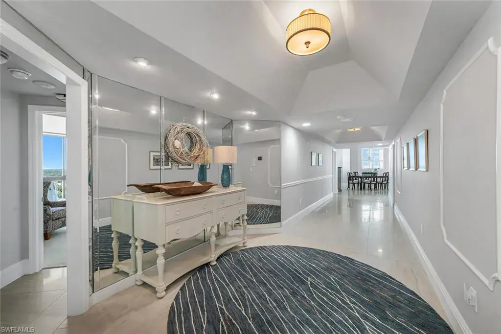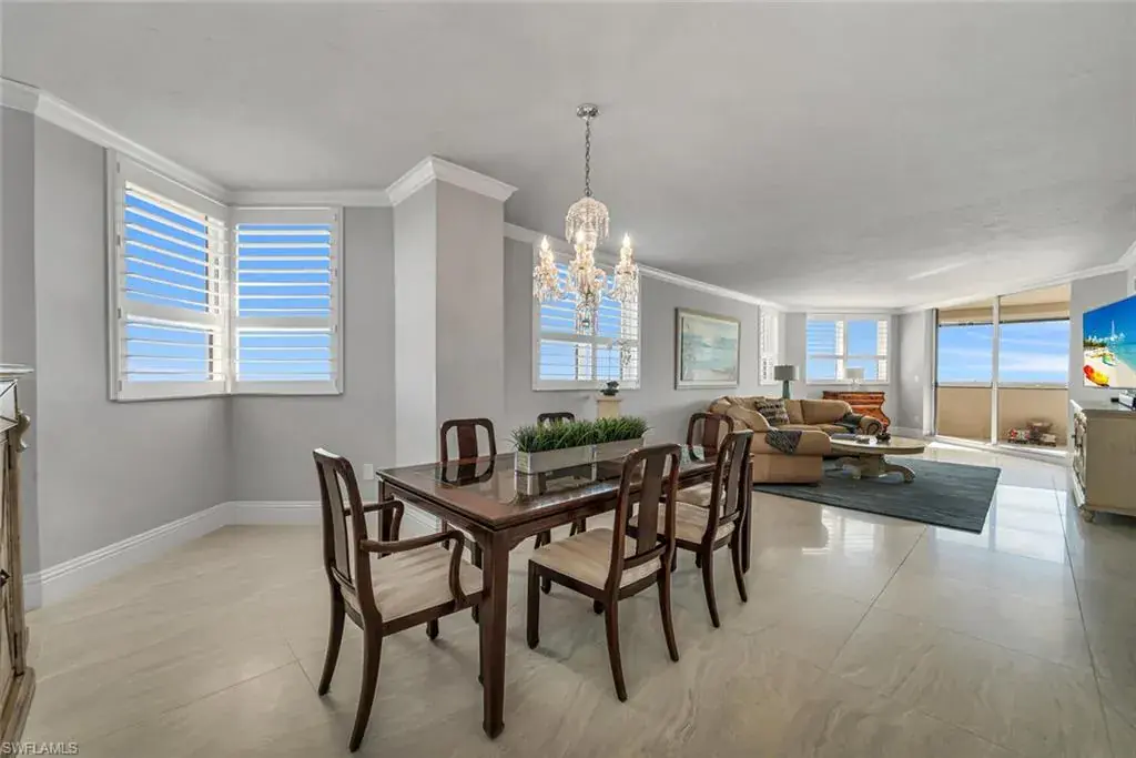 C8345 – SUNRISES, SUNSETS, Dramatic views from the Penthouse Level in the Sky! Rare Offering with over 3100 feet -3br. Plus den, Remodeled with 32 x32 porcelain timeless flooring, Baseboards, plantation shutters, elegant renovated Master Bath with heated shower bench, superb flowing floorplan with spacious Primary suite of 25 by 14 feet-all bedrooms open to screened balconies. 2 GARAGE spots at LOBBY LEVEL-steps from elevator. THE Grosvenor famous for its panoramic sweeping SW views and building integrity, with the Atrium Roof, HUGE resort style pool smartly planned on the South side, Fitness Center, Social Room, Guest Suites, building staff.