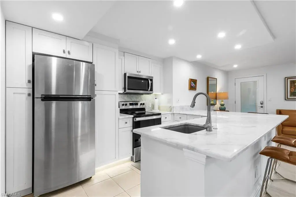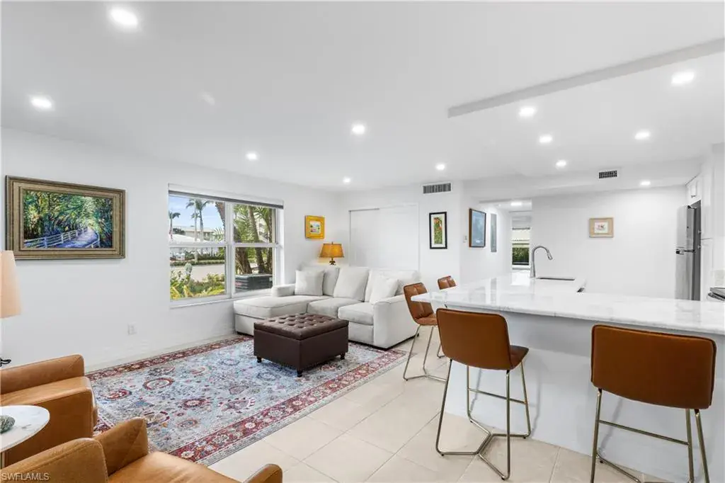 Beach to Bay Bungalow Waiting For You!. This 1 bedroom totally updated condo is steps away from Via Miramar Beach access. Located on the first floor in Gulf Bay Apts on Moorings Bay. Relax in the community pool on the bay or sun on the beach. Covered parking available. Community boat slip available for lease on first come basis. Condo comes furnished, personal affects not included. Light and bright. Kitchen has stainless steel appliances you would expect. Eat at the bar or in the Living Room. Window looks west across the street between buildings to the beach. Bedroom is spacious with walk-in closet. Totally updated bathroom with shower. Great quiet location. Smaller building. More privacy than you will find in other condos on Gulf Shore Blvd. You have it all here!