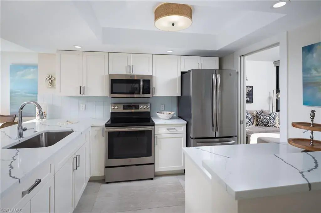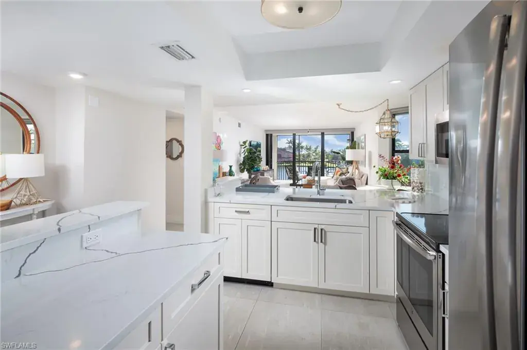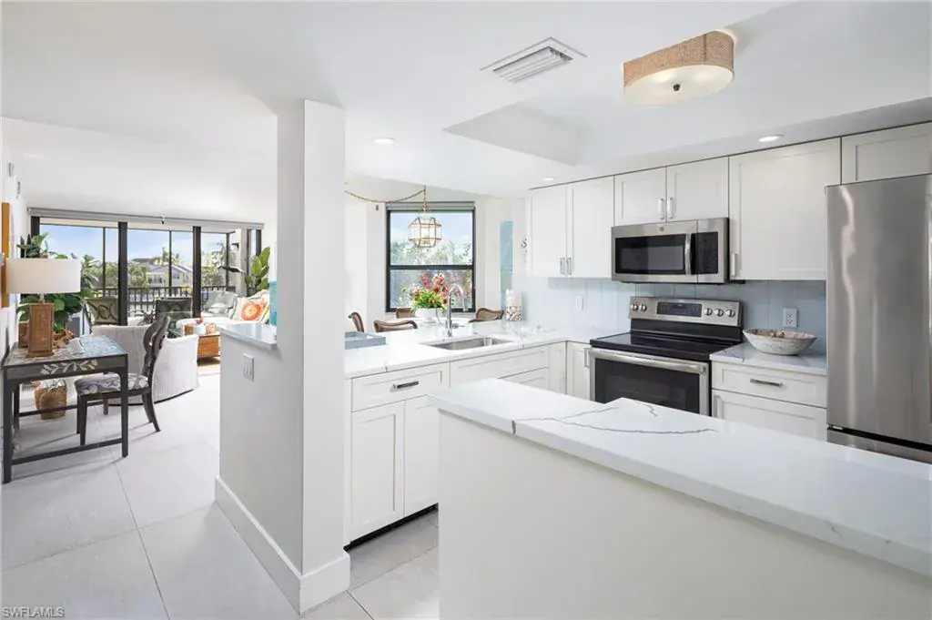 The open kitchen is designed for both function and style, offering expanded water views, abundant cabinetry, modern countertops, stylish hardware, stainless steel appliances, and a Juliette balcony perfect for morning coffee or evening cocktails. Both bathrooms feature designer tile and spa-like finishes, while tile flooring, elegant lighting, and tasteful furnishings create a serene, coastal atmosphere. Brand-new AC installed in 2025—move right in and start enjoying immediately!