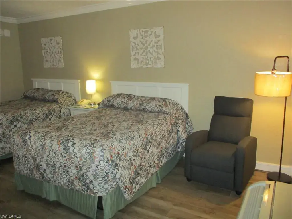 The room is nicely furnished, wood grain porcelain tile flooring, equipped with 2 queen beds, table and chairs for 2 to dine, recliner, TV, kitchenette, Bathroom with tub/shower combination, maple cabinetry with plenty of storage and a safe.