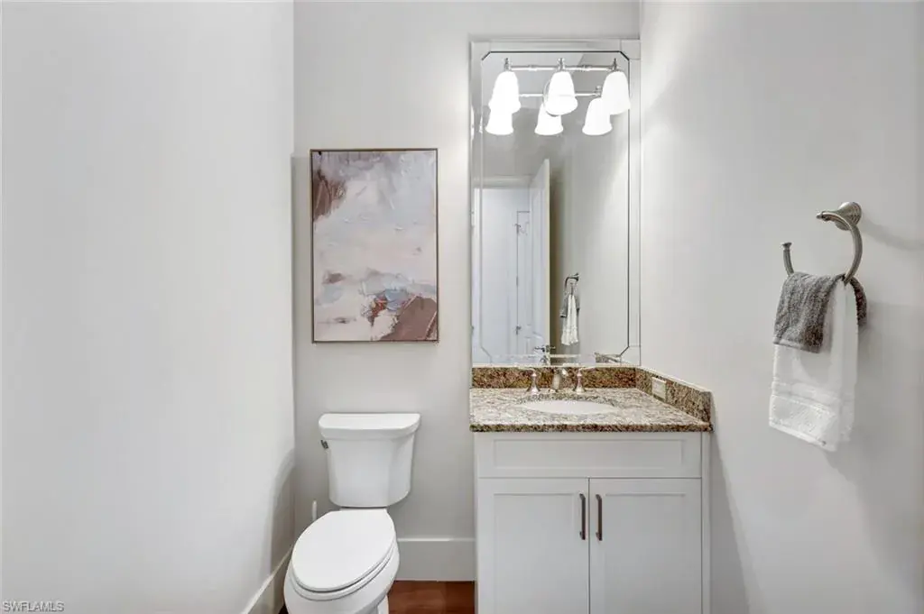 The kitchen offers recently upgraded appliances, an eat-in area, and a pantry. A well-appointed laundry room includes a 2022 washer and dryer, utility sink, custom cabinetry, and generous granite counter space. Two guest bedrooms feature cozy carpeting and plantation shutters.