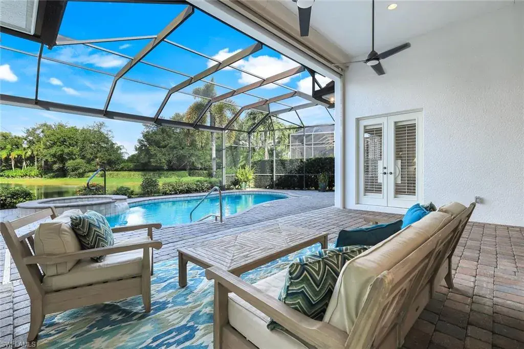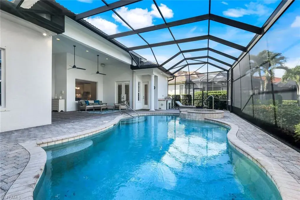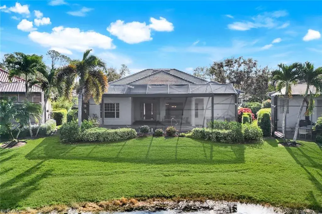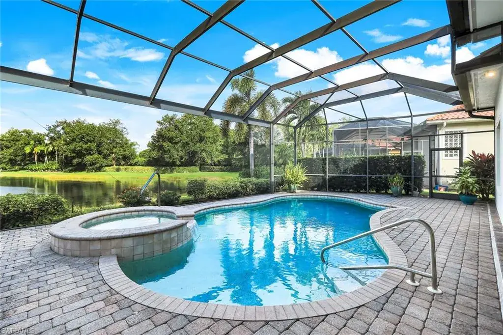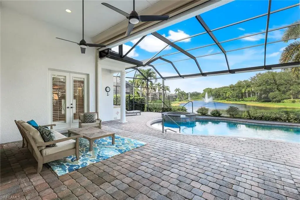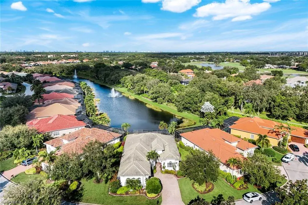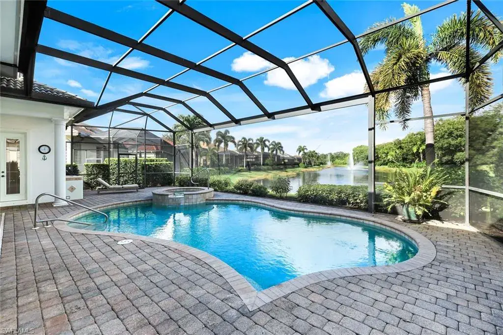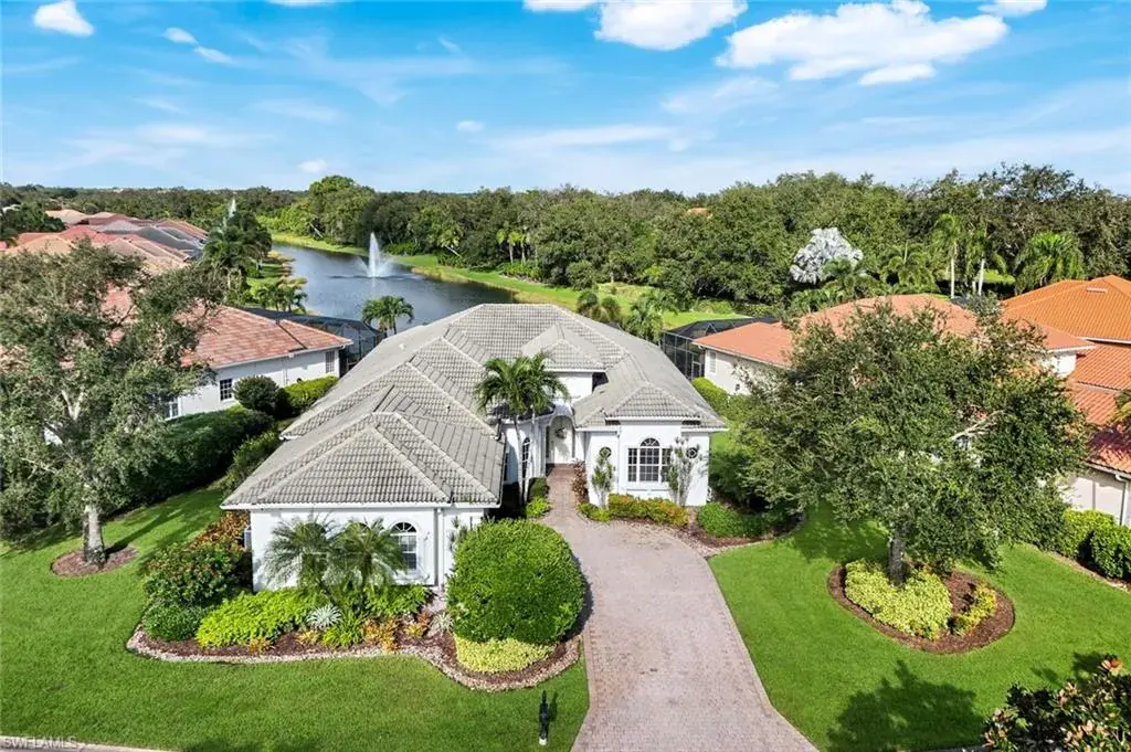 Expansive long lake views with two sparkling fountains and unforgettable evening skies! This stunning 4-bedroom + den, 4.5-bath estate home in Hammock Isles at The Vineyards combines timeless elegance with luxurious updates throughout. Recently refreshed interior, this home truly shines inside and out. Step inside and be greeted by hand-painted ceilings and columns, granite and marble countertops, a Sub-Zero refrigerator, and wood floors in the den. Thoughtful details abound, including crown molding, built-in closets, lighting fixtures and fans. Each bedroom features its own ensuite bathroom, ensuring privacy and comfort for family and guests alike. The home’s true showstopper? A breathtaking western long lake view with double fountains; a perfect setting for magnificent sunsets. Enjoy it all from your extended lanai with with picture window screens, and a large custom pool and spa, surrounded by lush tropical foliage that provides both privacy and beauty. Located within the gated community of Hammock Isles in The Vineyards, this home offers not only luxury but also an exceptional lifestyle. Optional Vineyards Country Club membership available and includes access to a world-class Wellness Center, newly renovated Clubhouse and Pool, Tennis and Pickleball, and two championship 18-hole golf courses. Just minutes from Naples’ world-class beaches, dining, and shopping, this home is the perfect blend of luxury, lifestyle, and location. Once you walk through the front door. You’ll never want to leave.