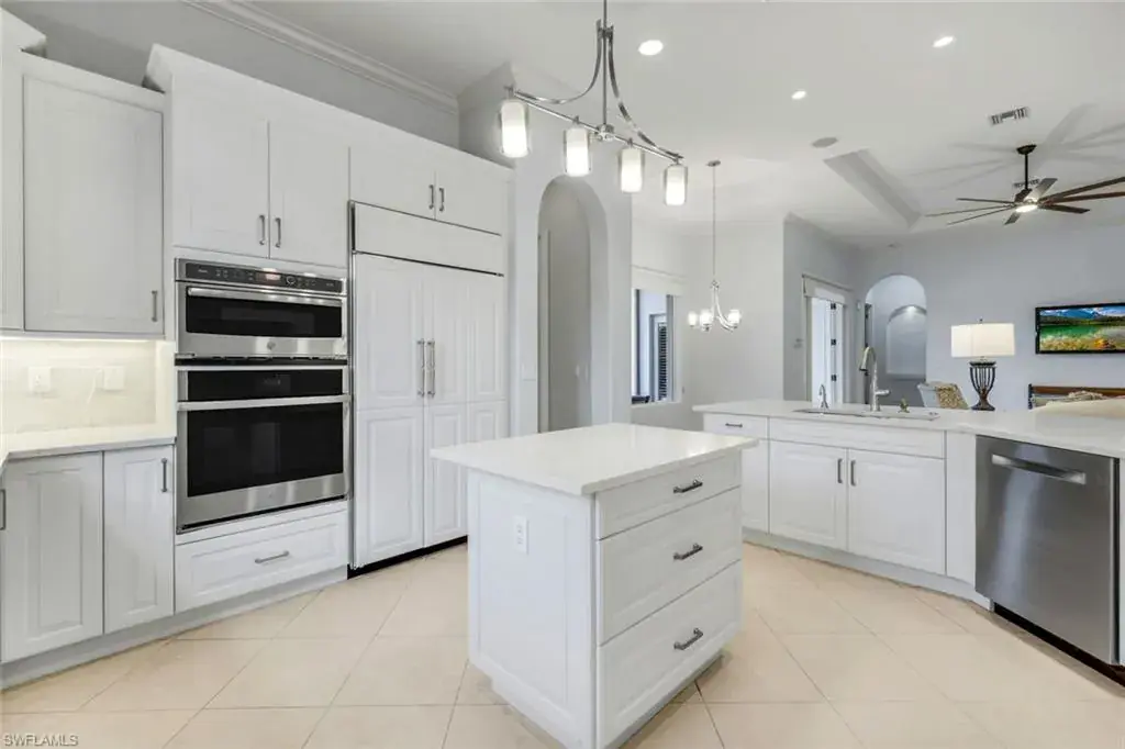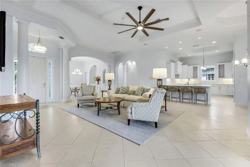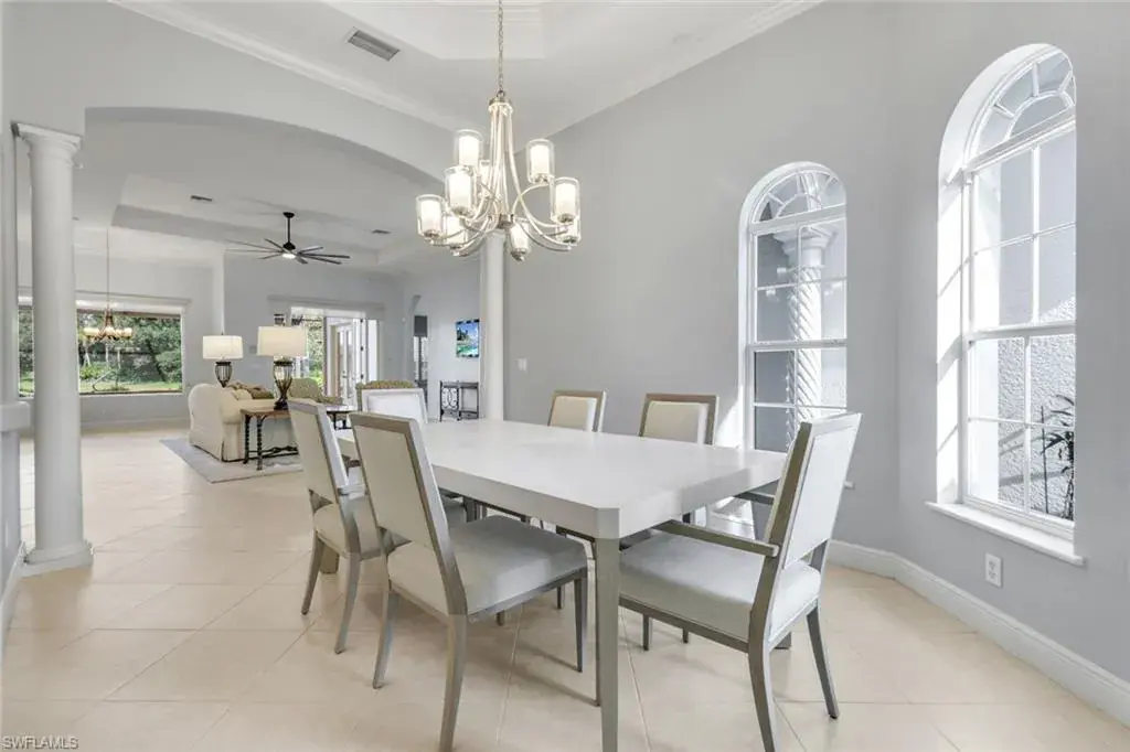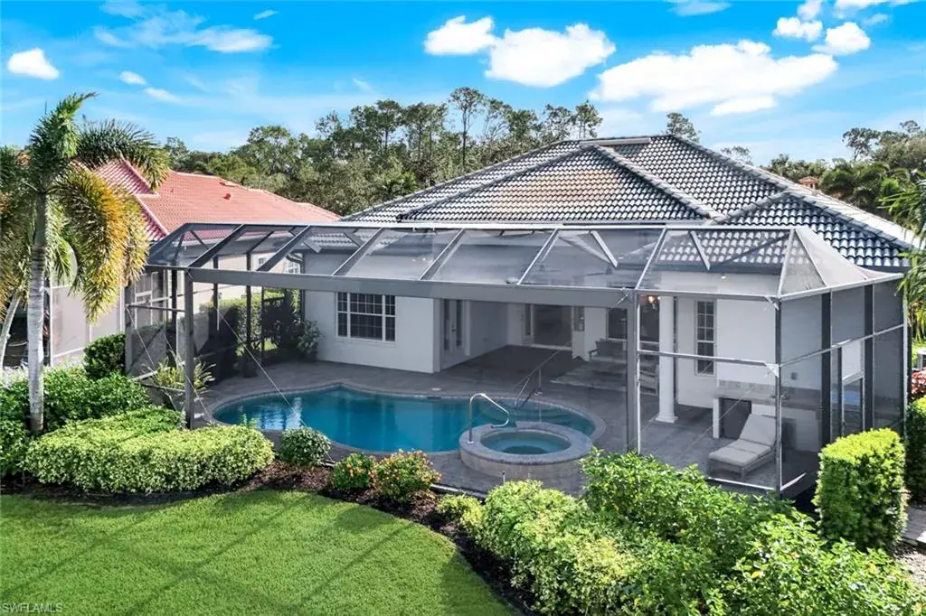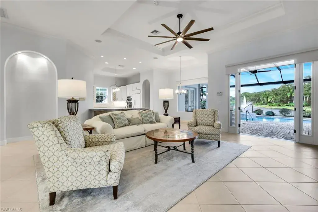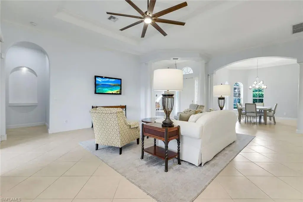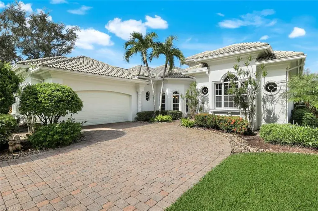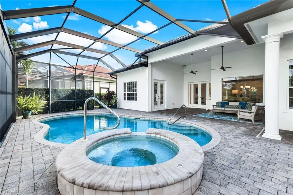 Expansive long lake views with two sparkling fountains and unforgettable evening skies! This stunning 4-bedroom + den, 4.5-bath estate home in Hammock Isles at The Vineyards combines timeless elegance with luxurious updates throughout. Recently refreshed interior, this home truly shines inside and out. Step inside and be greeted by hand-painted ceilings and columns, granite and marble countertops, a Sub-Zero refrigerator, and wood floors in the den. Thoughtful details abound, including crown molding, built-in closets, lighting fixtures and fans. Each bedroom features its own ensuite bathroom, ensuring privacy and comfort for family and guests alike. The home’s true showstopper? A breathtaking western long lake view with double fountains; a perfect setting for magnificent sunsets. Enjoy it all from your extended lanai with with picture window screens, and a large custom pool and spa, surrounded by lush tropical foliage that provides both privacy and beauty. Located within the gated community of Hammock Isles in The Vineyards, this home offers not only luxury but also an exceptional lifestyle. Optional Vineyards Country Club membership available and includes access to a world-class Wellness Center, newly renovated Clubhouse and Pool, Tennis and Pickleball, and two championship 18-hole golf courses. Just minutes from Naples’ world-class beaches, dining, and shopping, this home is the perfect blend of luxury, lifestyle, and location. Once you walk through the front door. You’ll never want to leave.