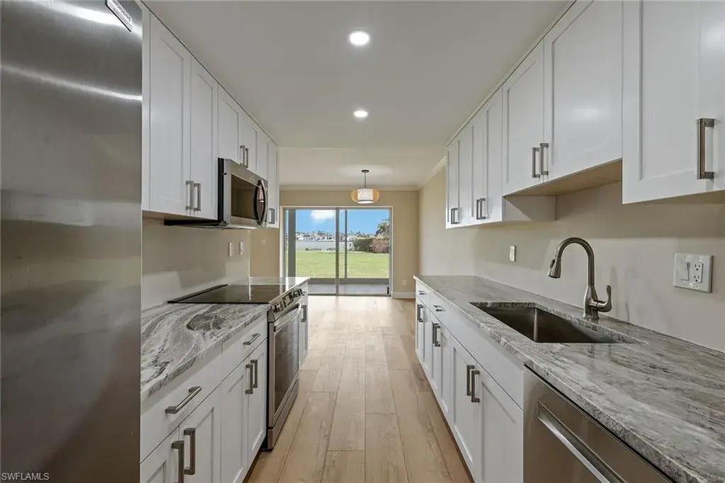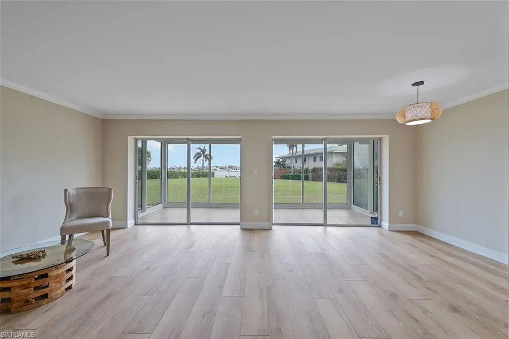 Near the gulf, this newly remodeled two-bedroom, two-bath condominium offers beautiful views of Moorings Bay from every room. Luxury vinyl plank flooring throughout, recessed lighting, crown molding, and impact sliders and windows are just a few of the notable features. The kitchen highlights quartzite countertops, stainless steel appliances, soft-close custom cabinetry with ample storage space and more. With a neutral palette, this home is ready for you to add your personal touches. Have peace of mind with a secured entry, onsite manager and a deeded covered parking space. Be the first to experience the recently updated social room with a full kitchen, fitness room, extra storage, community pool, grilling facilities, bike and kayak storage and a fishing pier. Those looking for income potential can lease their unit once a year for a minimum of 90 days. Its prime location is only a short distance to Venetian Village where you can indulge in upscale dining and shopping or just a quick drive to 5th Avenue South or 3rd Street South.