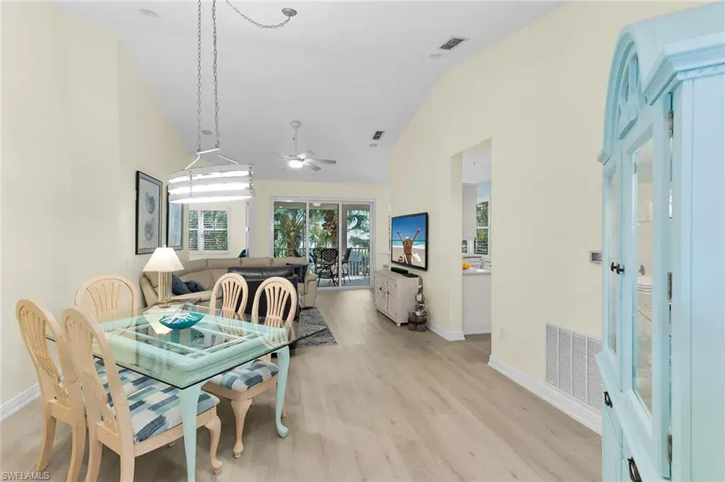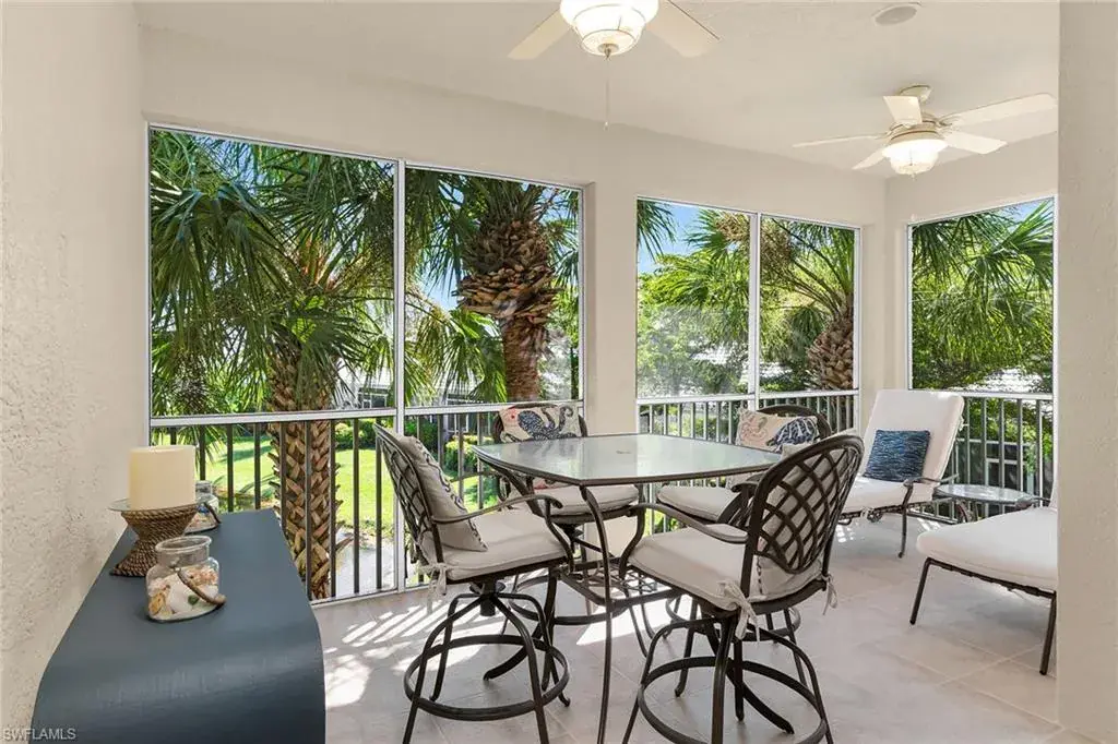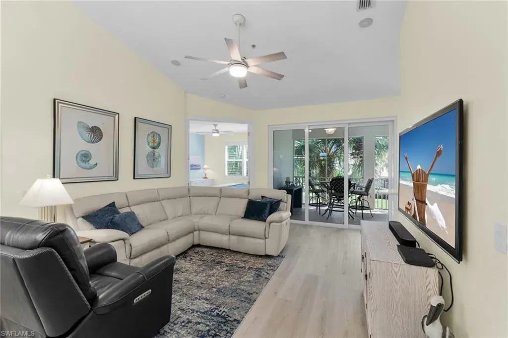 On the cul-de-sac in the quaint village of Hawk’s Nest, this light and bright end-unit, second-floor condominium is in the upscale gated community of Fiddler’s Creek. This beautifully furnished 2 Bedroom plus Den coach home has neutral luxury vinyl plank flooring, creating a smooth flow throughout. With three bedrooms, vaulted ceilings and an open floor plan, this home is spacious and designed to optimize natural light. This upstairs unit features tasteful finishes, impact glass windows and sliding door, creating an appealing atmosphere. The well-appointed kitchen features white cabinetry, modern stainless appliances and ample counter with a bar and eat-in area, while the primary suite provides a peaceful retreat with a spacious en-suite bath and a large walk-in closet. There is a convenient laundry room in this condominium and an attached garage has epoxy flooring. With desirable parking spots, this unit has a 2020 roof and is not far from the village pool. Residents enjoy resort-style amenities including a 54,000-square-foot clubhouse, lagoon-style pools, a fitness center, tennis and pickleball courts, and an array of dining options. Optional golf, beach and marina memberships allow for endless recreation and entertainment possibilities. With its prime location just minutes from Marco Island, downtown Naples, pristine beaches, boating, shopping, movies, theatre, restaurants and airports, this condominium offers the ideal blend of luxury and convenience.