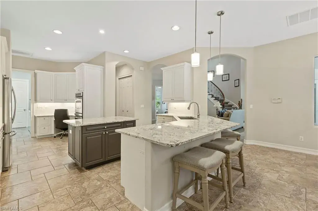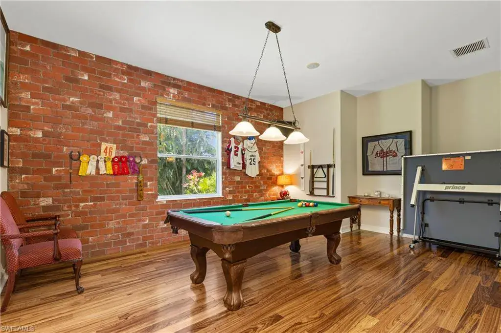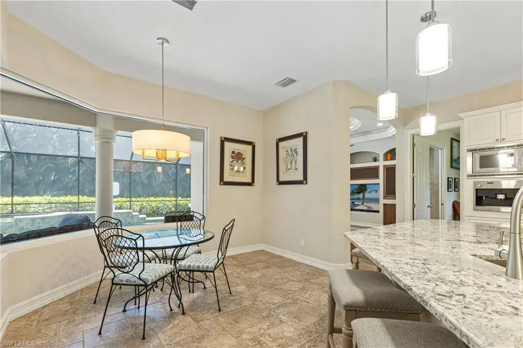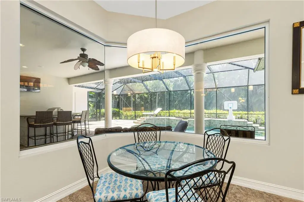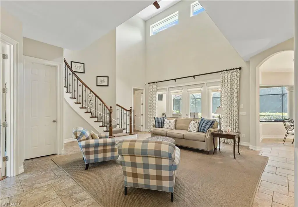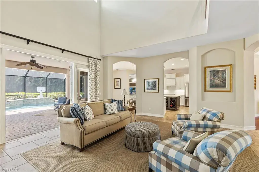 Welcome to this beautifully updated and meticulously maintained 4-bedroom + study + bonus room home, set on over a half acre in the centrally located, highly desirable community of Hawksridge. Nestled on a quiet cul-de-sac and surrounded by mature trees, lush landscaping, and a tranquil pond with a water feature, this home offers privacy, space, and timeless appeal—just minutes from Naples’ beaches, 5th Avenue, Waterside Shops, Mercato, and top-rated schools. With over 4,000 square feet of living space, the flexible layout features a dramatic two-story living room with vaulted tray ceilings, a newly re-carpeted curved staircase, and a natural stone fireplace. A custom billiards/game room and private study provide ideal spaces for work and play. The kitchen showcases a bright coastal design with white cabinetry, granite countertops, stainless steel appliances, and an open layout perfect for entertaining. The luxurious primary suite is located on the main level and includes a tray ceiling and an adjoining flex room—ideal as a second office, nursery, or fitness space. Upstairs, you’ll find a spacious media/bonus room. Hurricane-impact windows on the upper level and a new roof offer peace of mind, while fresh interior and exterior paint give the home a crisp, modern feel. Step outside to your private oasis: a large covered lanai with a full outdoor kitchen, oversized pool and spa with cascading water features (Aqua-Link system), and an expansive fenced backyard—perfect for kids, pets, or entertaining. Additional features include an oversized 3-car garage with space for vehicles, storage, and hobbies. Hawksridge is a low-density community known for its mature landscaping, tennis courts, clubhouse, and unbeatable proximity to downtown Naples, shopping, dining, beaches, and A+ schools. This home offers the perfect balance of space, style, and location—an exceptional opportunity in one of Naples’ most desirable neighborhoods.