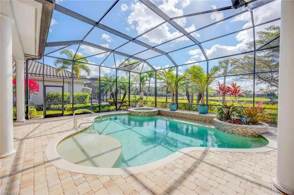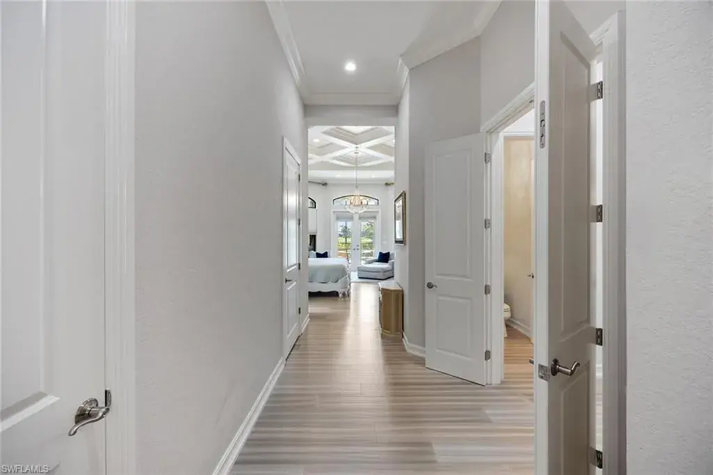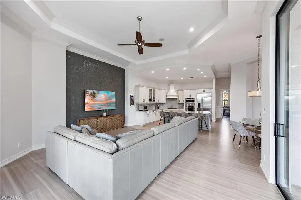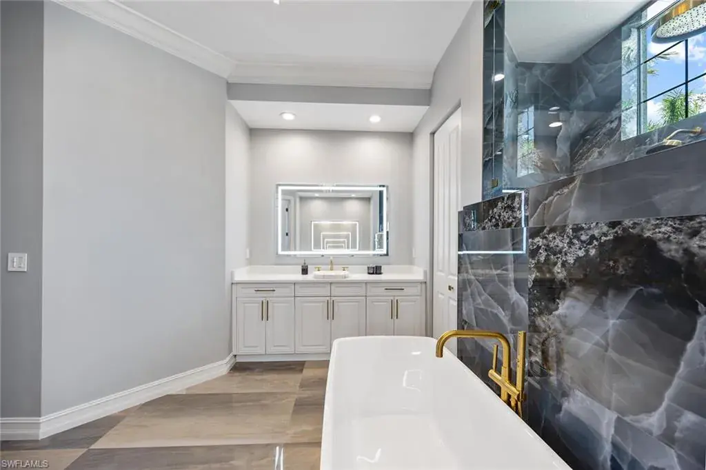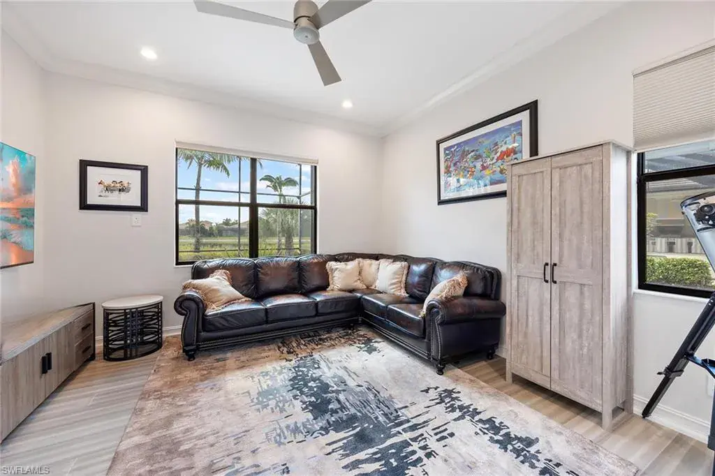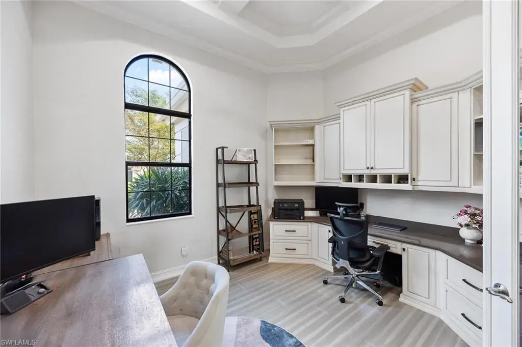 A masterpiece of refined luxury, this former Estate Builder Model in Twin Eagles offers an unparalleled living experience, with full and partial golf memberships available. Featuring four bedrooms with en suites plus two offices/dens, 4.5 baths, and an open-concept design with soaring ceilings and exquisite architectural details. The gourmet kitchen boasts a gas cooktop and premium finishes, while the grand great room and formal living spaces provide effortless flow for entertaining. Meticulously updated with new paint, flooring, a whole-home generator, two new air-conditioning units, custom lighting, a water filtration system, a new pool heater and an upgraded temperature-controlled garage with designer flooring. The lavish primary suite boasts a custom-designed bath with imported marble flooring, a spa-inspired shower, quartz countertops and opulent gold-leaf sinks. Enjoy southern exposure with breathtaking lake views from the lanai, complete with an outdoor kitchen, pool and spa. In prestigious Twin Eagles, residents enjoy two championship golf courses, a state-of-the-art fitness center, tennis, pickleball, bocce, a fine dining restaurant and a vibrant tiki bar.