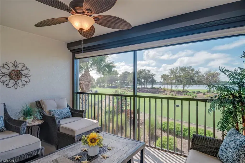 Welcome to the bundled golf community of Heritage Bay, where this luxurious residence offers a lifestyle of unparalleled leisure and convenience. This HIGHLY DESIREABLE ABBEY MODEL END UNIT which is part of a low-rise building, features 2 bedrooms plus a den, 2 bathrooms, and a garage. From the moment you arrive, you will be captivated by the scenic golf course and lake views visible from the private lanai.Additional upgrades include custom lighting, fans, and plantation shutters, COREtec flooring in den and bedrooms( no carpet ). New HVAC (2022) new water heater (2025). Storm Smart hurricane shade on rear lanai.