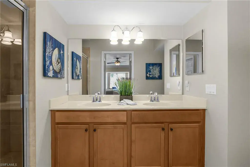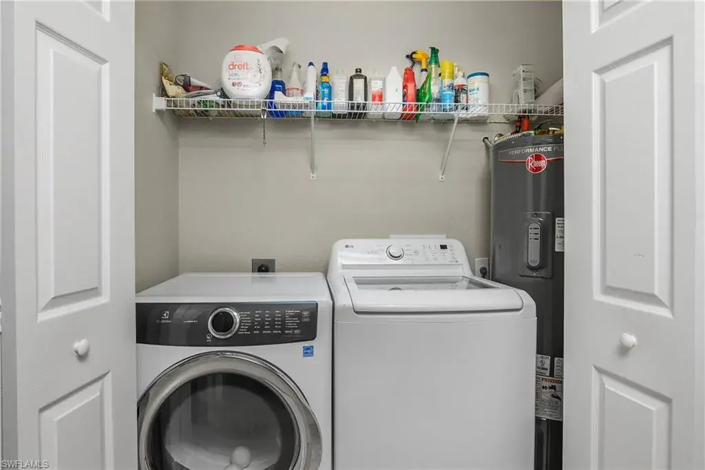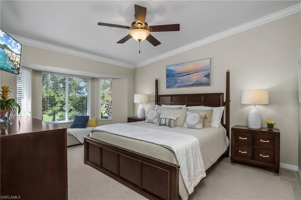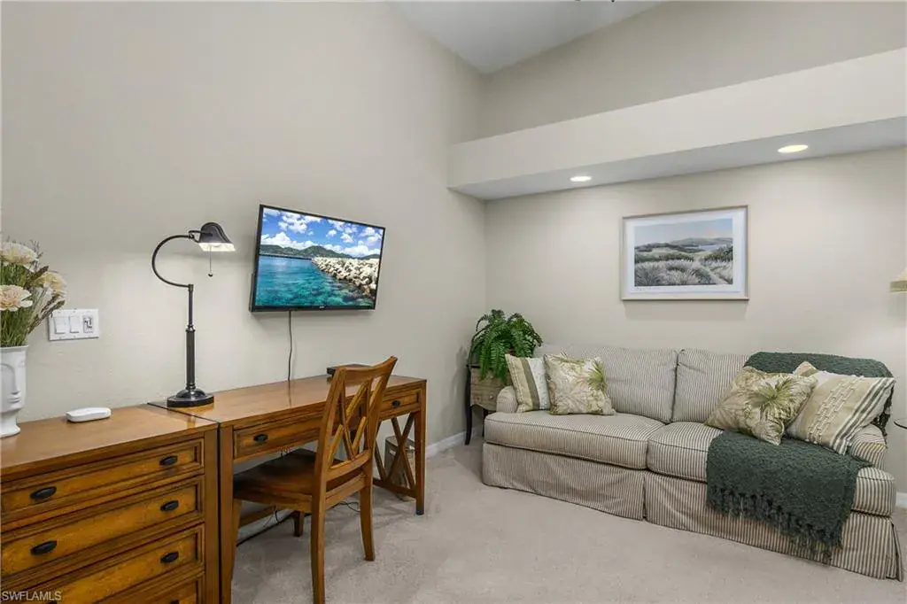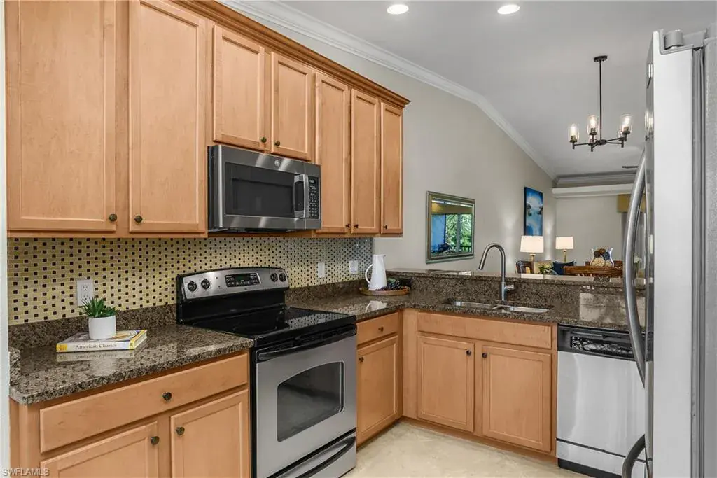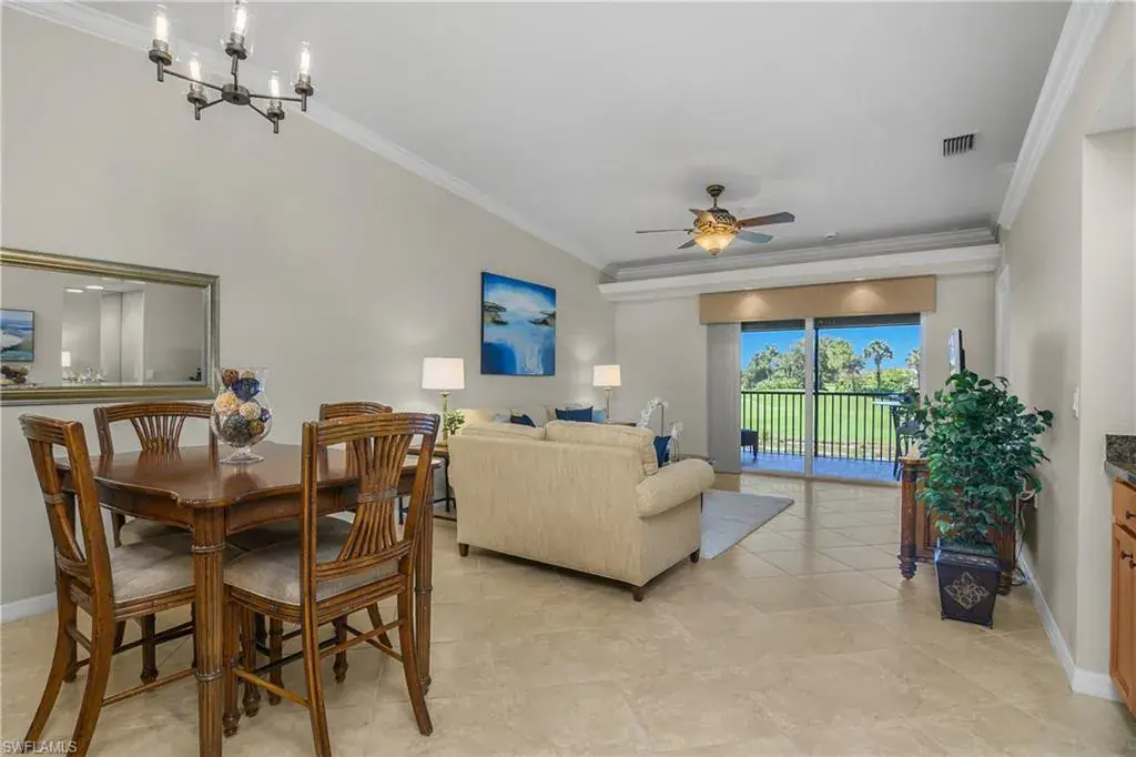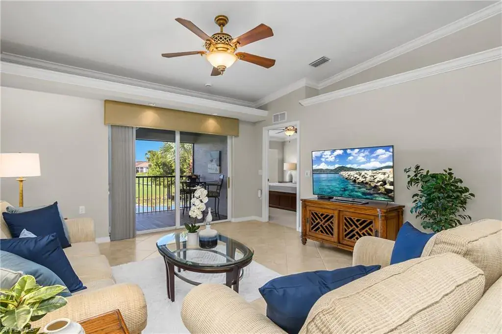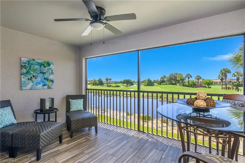 Welcome to this beautifully maintained second-floor Barrington model, 2-bedroom and a den, 2-bathroom Veranda in the highly sought-after bundled golf community of Heritage Bay in Naples, Florida. This residence is being offered turnkey furnished, allowing you to move in and immediately enjoy the resort-style lifestyle that Heritage Bay is known for. Enjoy southern exposure and breathtaking panoramic golf course and water views from your rear lanai, enhanced with no-see-um screens and upgraded wood-look plank tile flooring. The front lanai also features no-see-um screens, providing multiple outdoor spaces to relax and entertain. Just steps away, you’ll appreciate the convenience of being located next to one of the community’s five satellite pools. Inside, this home showcases high ceilings, crown moulding, and tasteful décor that create a light and airy atmosphere. The kitchen is equipped with granite countertops, stainless steel appliances, and a new microwave, designed for everyday ease. Additional upgrades include a new washing machine (2025), newer dryer, and a 2024 water heater, all offering peace of mind and energy efficiency. The primary suite provides serene views and comfort, while the flexible den space offers options for a home office or guest accommodations. The condo also includes a one-car detached garage for added convenience. Heritage Bay is one of Naples’ premier golf and country club communities, offering 27 holes of golf, tennis, pickleball, bocce ball, a state-of-the-art fitness center, resort-style pools, and multiple dining venues. With its vibrant social calendar and beautifully renovated clubhouse, Heritage Bay delivers the perfect blend of active living and relaxation. If you are searching for a turnkey second home, seasonal retreat, or full-time residence in Naples, FL, this veranda condo combines luxury, comfort, and convenience in a community that has it all.