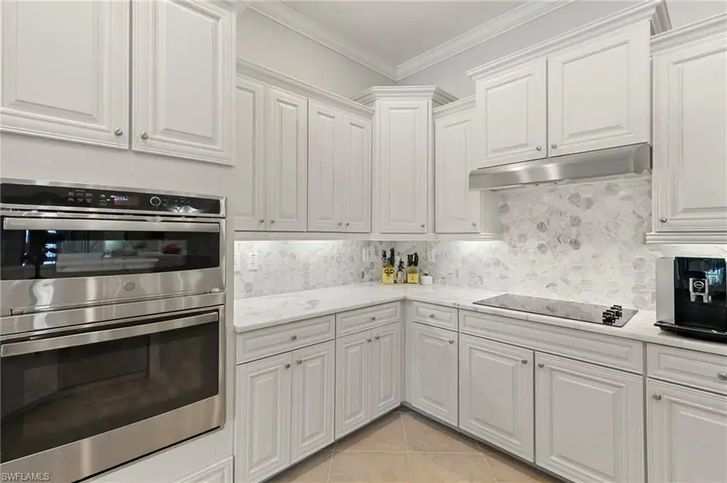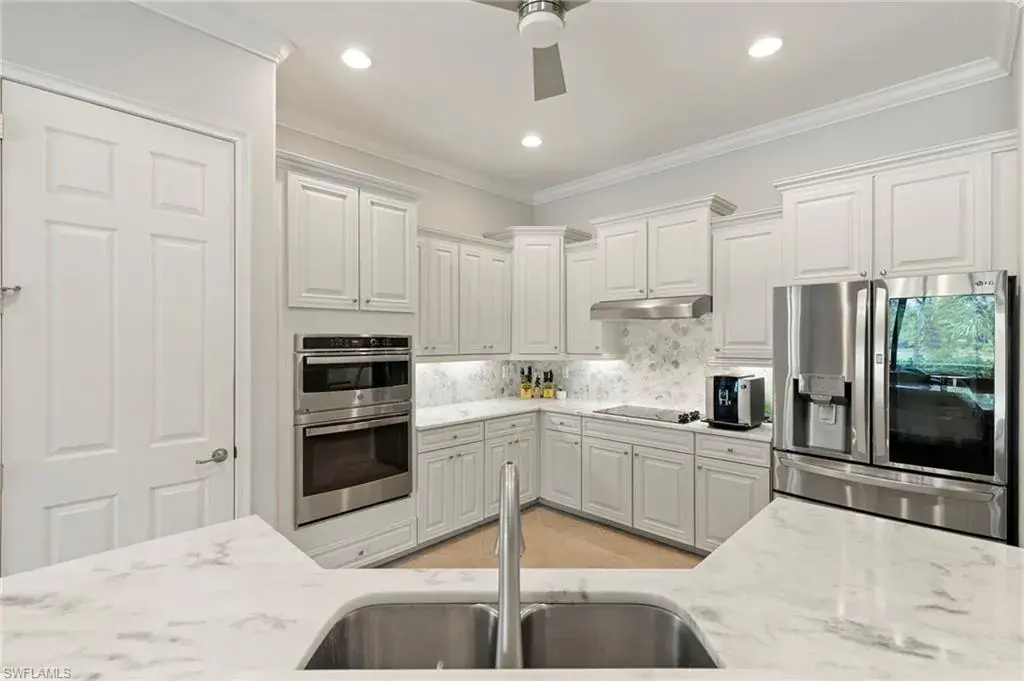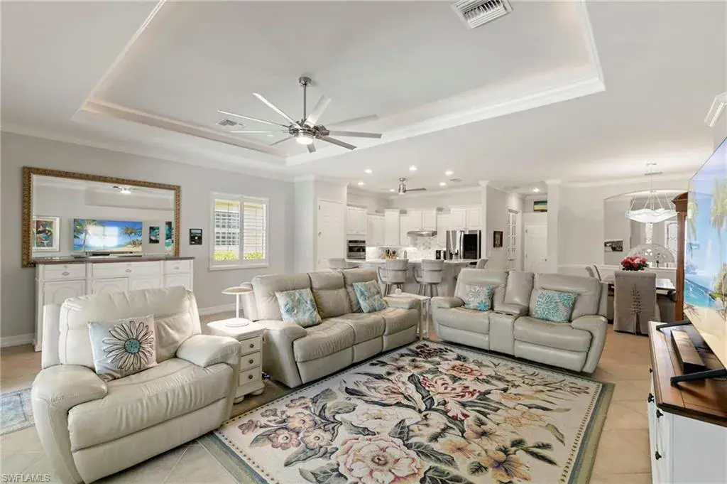 The upgraded kitchen boasts modern finishes, upgraded appliances, and sleek countertops, flowing seamlessly into the open and spacious living area with plantation shutters throughout.
