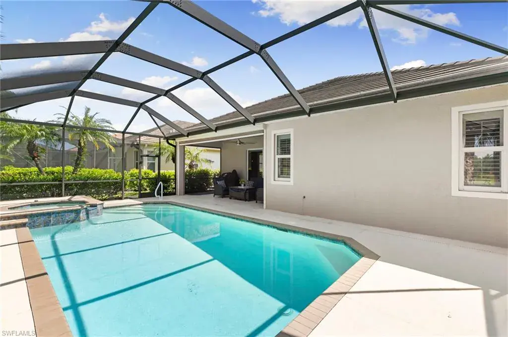 Major improvements include a new roof (2020), new HVAC system (2022), upgraded flooring in bedrooms, tastefully upgraded guest bathroom, interior & exterior paint, and a solar pool heating system that enhances energy efficiency. Resurfaced pool and relaxing spa complete with a covered lanai and hurricane rated sunscreen and windows.
