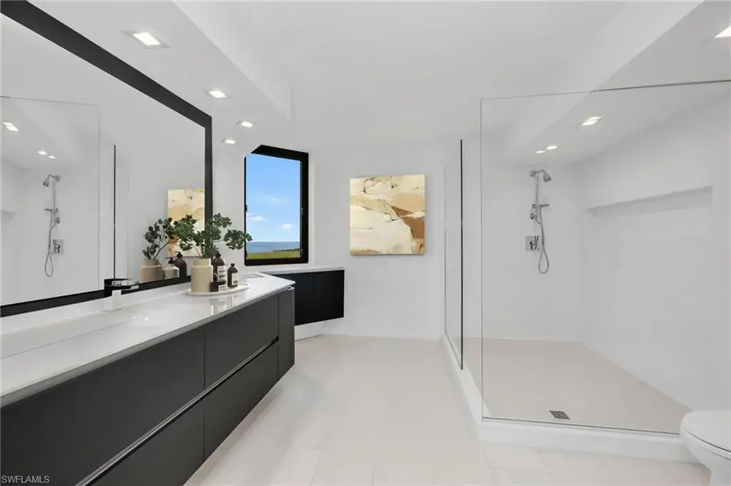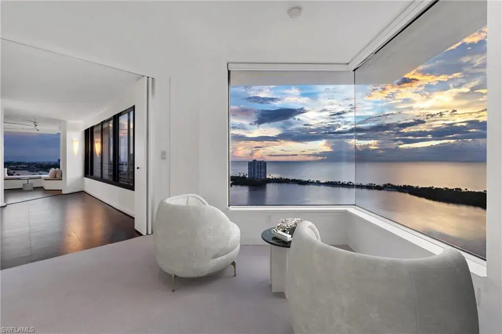 Start your mornings with breathtaking, uninterrupted panoramic views of the Gulf and Clam Pass through expansive walls of sliding windows that open and two mitered glass corner windows, a design marvel that invites the serene beauty of sunsets year-round. This residence is a haven for culinary aficionados, boasting loads of storage space and stainless high-end appliances, including Sub Zero, which cater to your every culinary whim. The generous primary suite with Gulf front sitting area has LONG water views & lovely sleek bath offering two sinks, an oversized glass shower, ample storage, and a fully outfitted walk in closet. Guests are tucked away in their own suite with VIEWS of Pelican Bay plus full bath & even more closets.