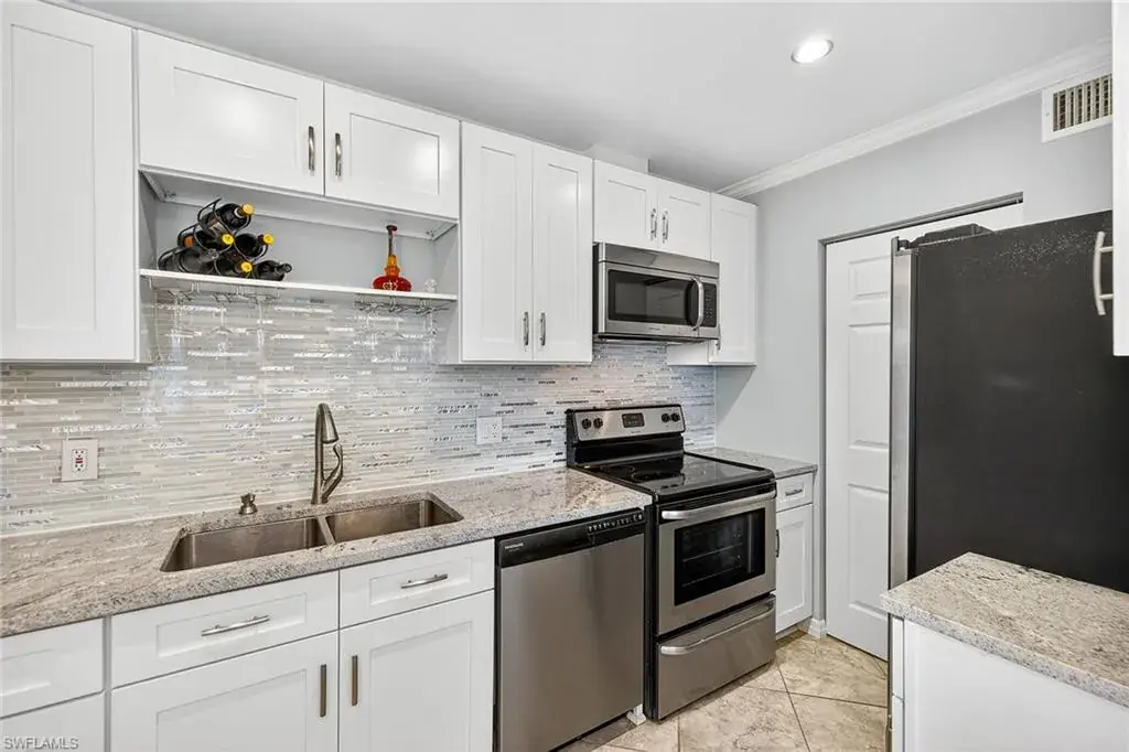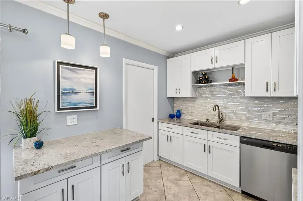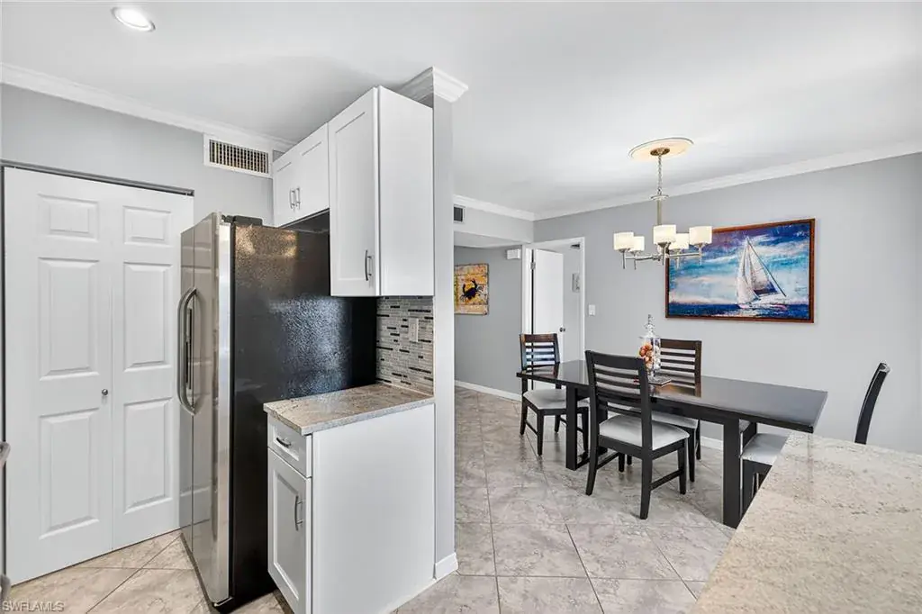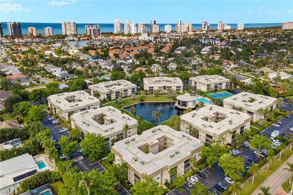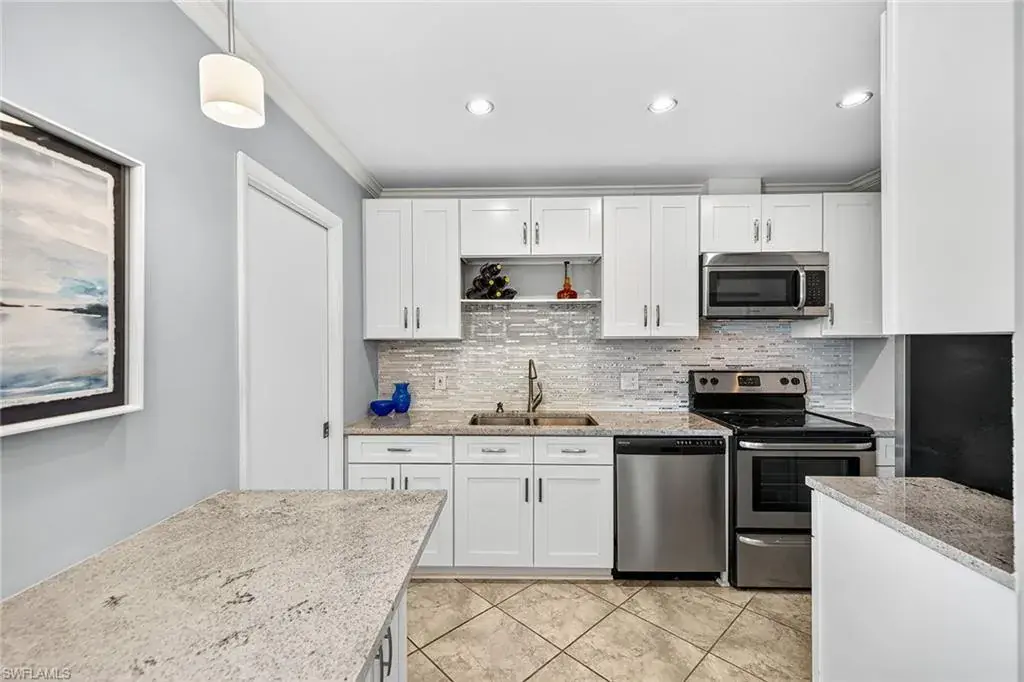 In beautiful Park Shore, this updated top-floor residence offers serene southern exposure with pool and lush landscape views. The home features tile floors throughout, a modern kitchen with quartz countertops, a custom tile backsplash and stainless steel appliances. The spacious primary suite includes crown molding and a renovated bath with a glass-enclosed walk-in shower. A screened lanai, accessible from the living room and bedroom, captures soft sunlight all day while hurricane-rated windows and shutters provide peace of mind. Hidden Lake Villas offers resort-style amenities including a library, pickleball and tennis courts, highlighted by the largest community pool in the area, with lap lanes and low entry stairs. Residents can enjoy private access to Park Shore Beach through the Park Shore Association, complete with dedicated parking, showers and picnic areas. Near 5th Avenue South, Venetian Village and Mercato, this location delivers effortless access to Naples signature coastal lifestyle.