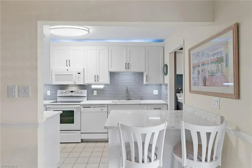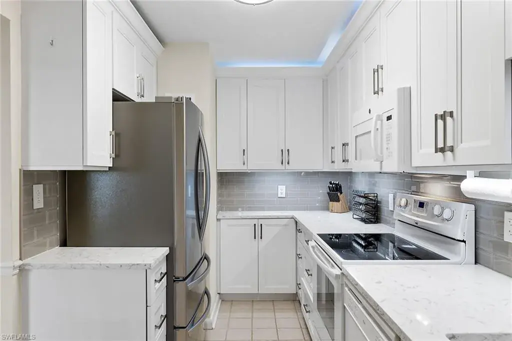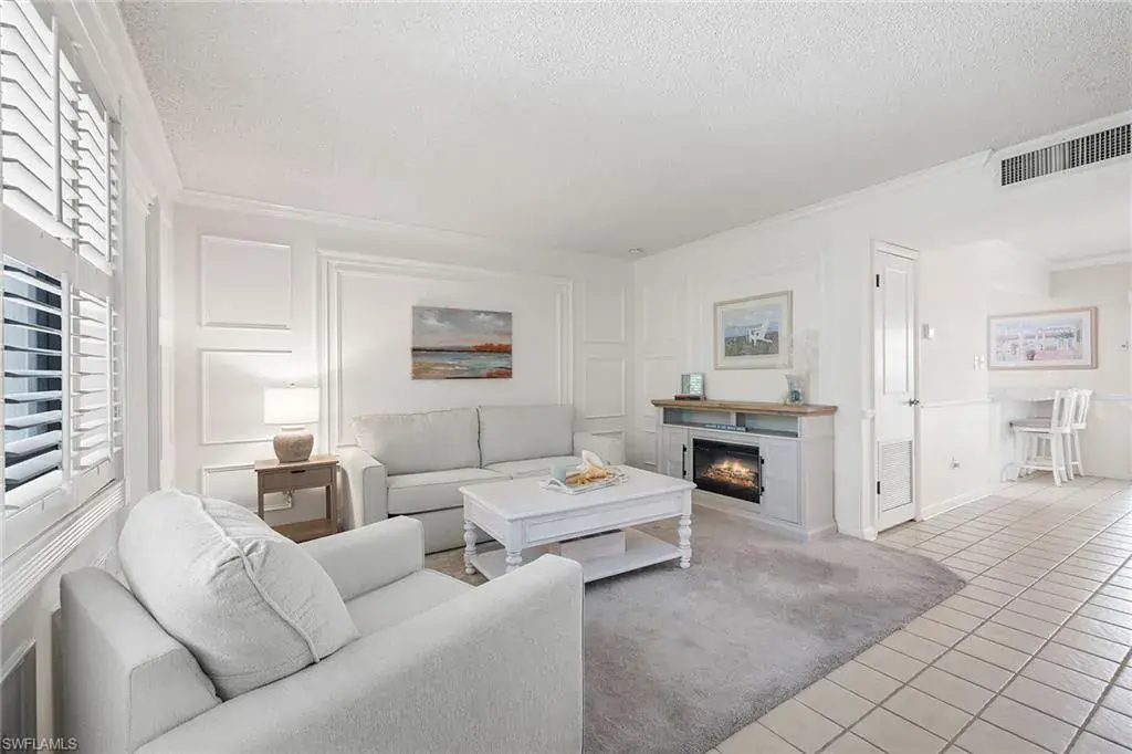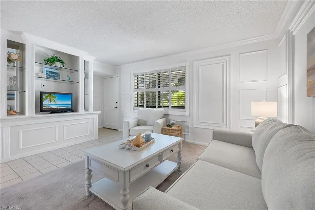 Hidden Lake Villas offers a worry-free living experience with its beautifully landscaped grounds and modern amenities, having survived severe storms like Ian and Helene without any flooding issues. The combination of hurricane shutters, impact windows and durable building design provides a safe and secure environment. Enjoy your breakfast on the lanai or take in the afternoon sunlight in the courtyard, just steps away from your private corner unit. This tastefully updated home features a stylish kitchen, main bath, and newer A/C, complemented by elegant trim work and built-in display cabinetry. Private Park Shore beach is available to you nearby as is Venetian Village, offering an array of upscale dining and shopping options to make this your ideal Naples home.