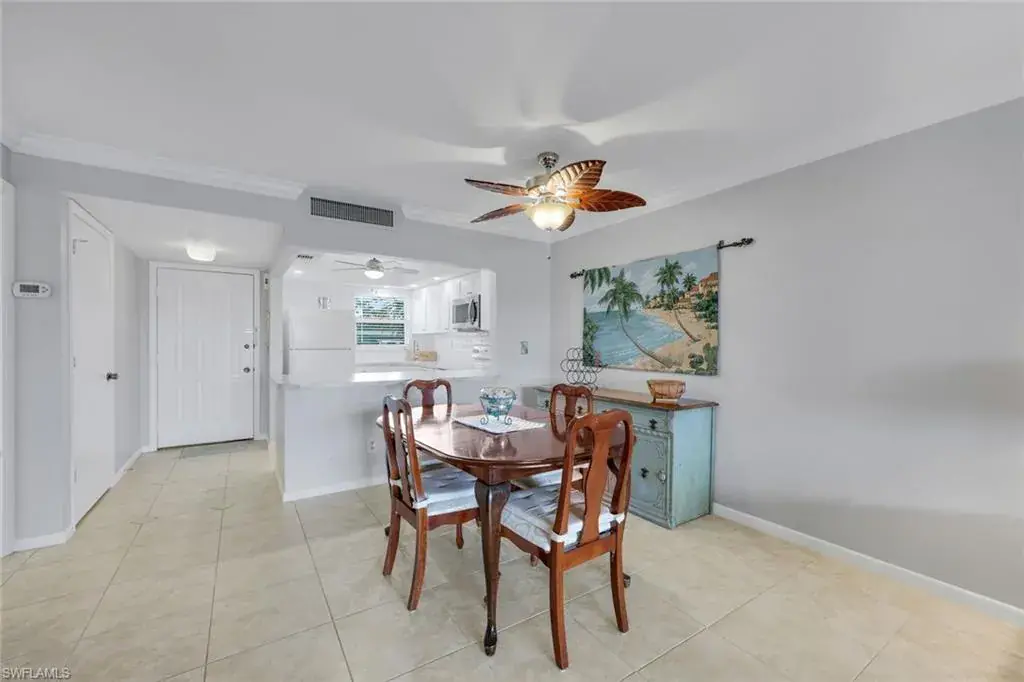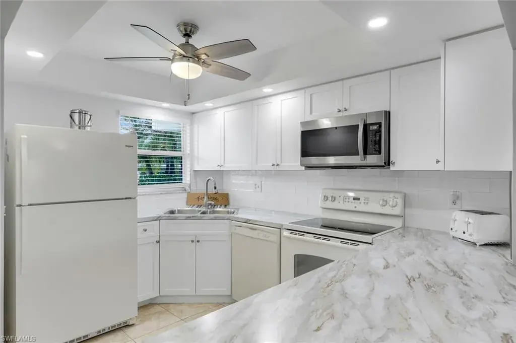 TURNKEY FURNISHED 2 Bed 2 Bath ground floor condo with covered parking space is located in the heart of Naples, just 1.5 miles to the beach! Beautiful kitchen offers soft-close cabinetry, recessed LED ceiling lighting, contemporary counter top, stainless steel microwave, stylish backsplash, stainless sink and premium faucet. The kitchen provides an open view into the living/dining room with crown molding. Tiled flooring throughout. Upgraded ceiling fans throughout.  Full-size washer & dryer. This condo is not in a 55+ age-restricted building. High Point Country Club is called a “hidden gem” with wonderful amenities: golf for two on the beautifully manicured par 3 course, 6 heated swimming pools, tennis & pickle ball courts, fitness room, bocce courts, bridge, mahjong and endless social activities and events at the clubhouse. Your water, sewer, cable TV, internet wifi and trash removal are all included in your condo association quarterly fee! High Point Country Club is a close-knit and welcoming community where friendships are a real asset. This beautifully landscaped neighborhood is centrally located in the 34103 zip code and is just minutes from shopping, restaurants and entertainment. Why wait? Move right in and enjoy your new home in “Paradise”!
