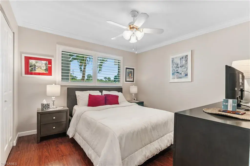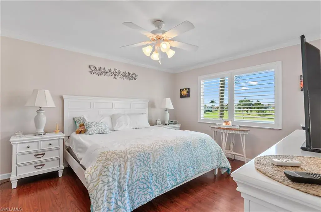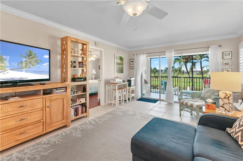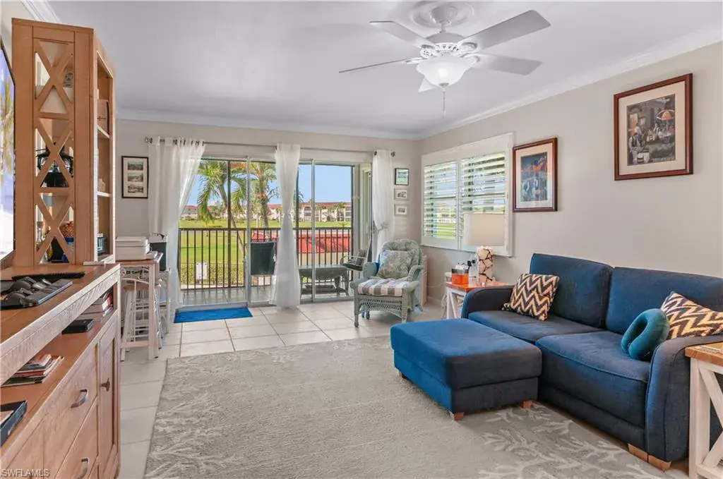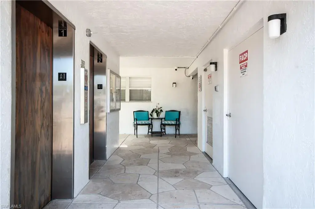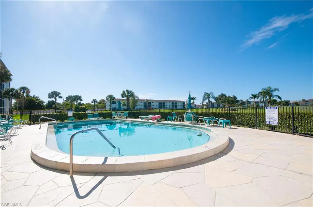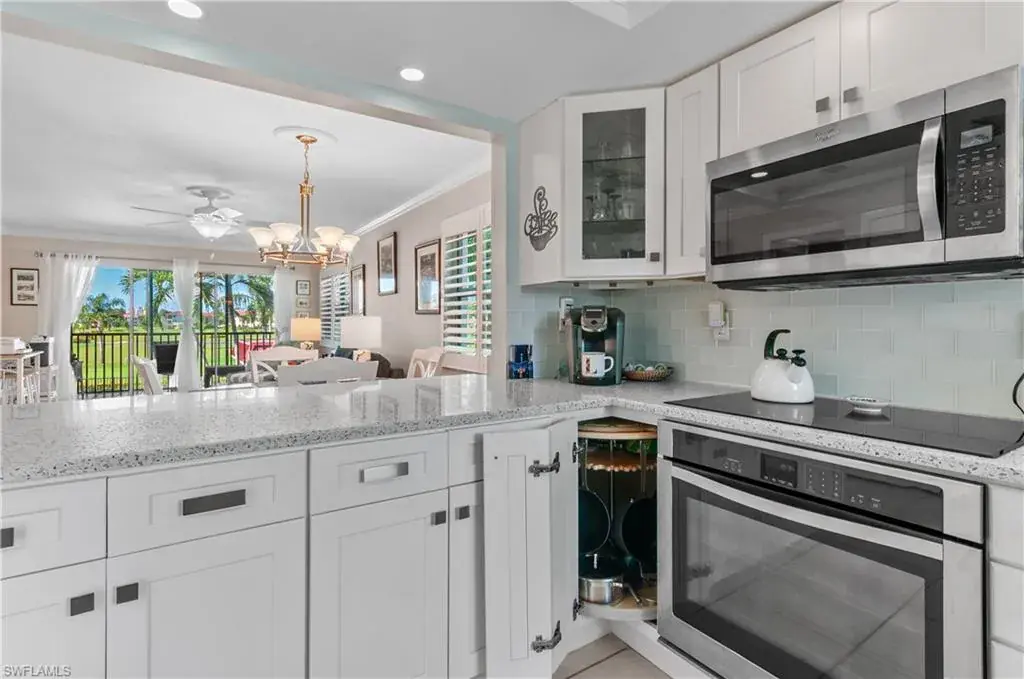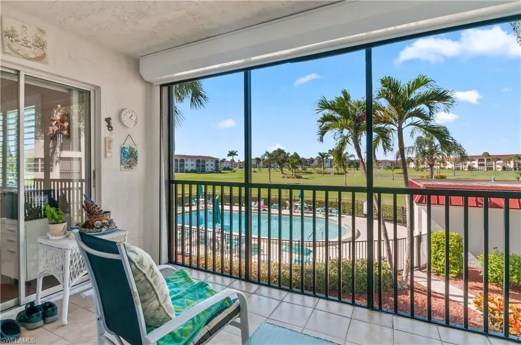 NEW Pictures!!! Rare RENOVATED CORNER UNIT with views of pool, golf course and water feature. Open kitchen has white cabinets, newer stainless appliances. Enjoy neutral tile floors, updated windows and doors, updated A/C and hot water heater and plantation shutters on all windows. The hot water heater and new electric panel have been upgraded in 2025. The building has a new roof and a generator for outside lights and for the 2 elevators. The owner has lovingly maintained this unit. This is a rare opportunity and a Must See! Low quarterly fee includes wi-fi, cable, water, sewer, trash, all amenities including FREE golf, tennis, pickleball, 6 pools, clubhouse with gym, pro shop and restaurant plus 6 pools and just 1 mile to beach! Enjoy a full activity calendar, a restaurant in season and the friendliest CC in Naples.