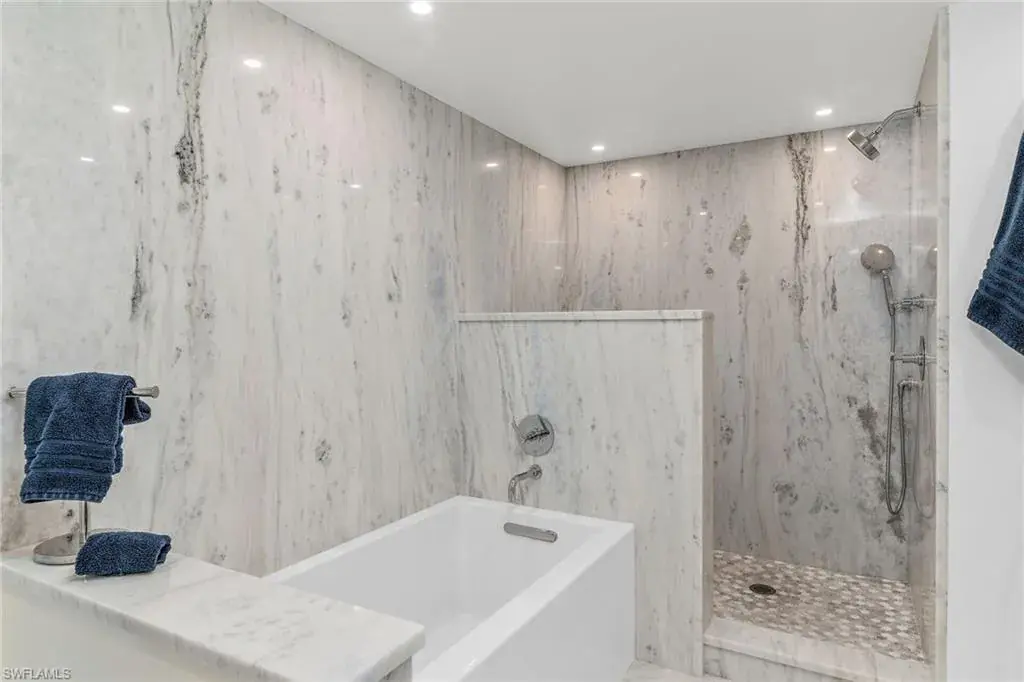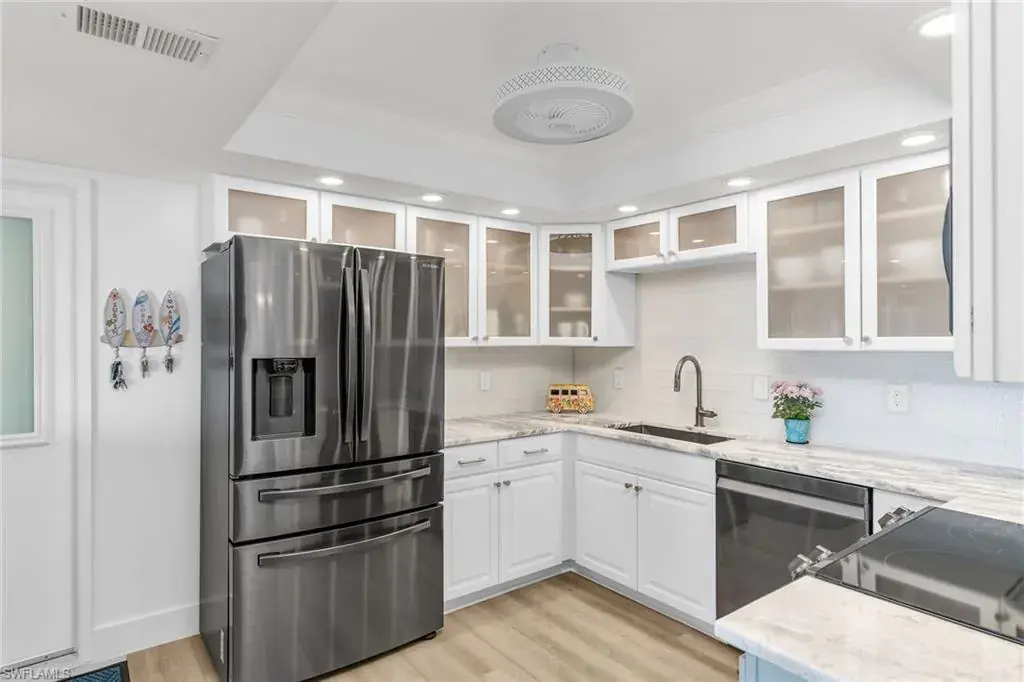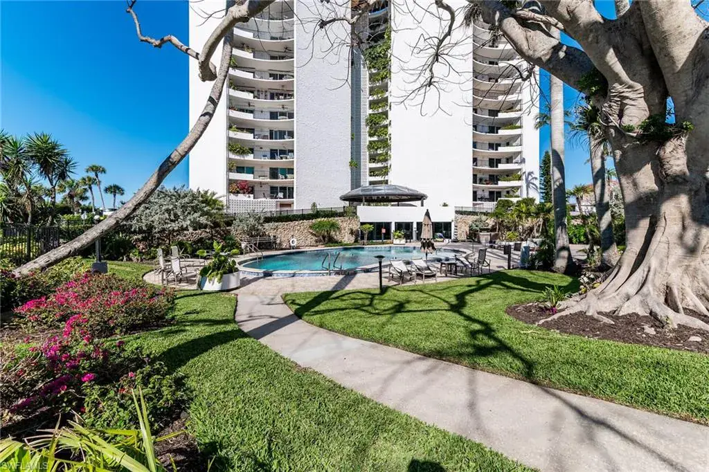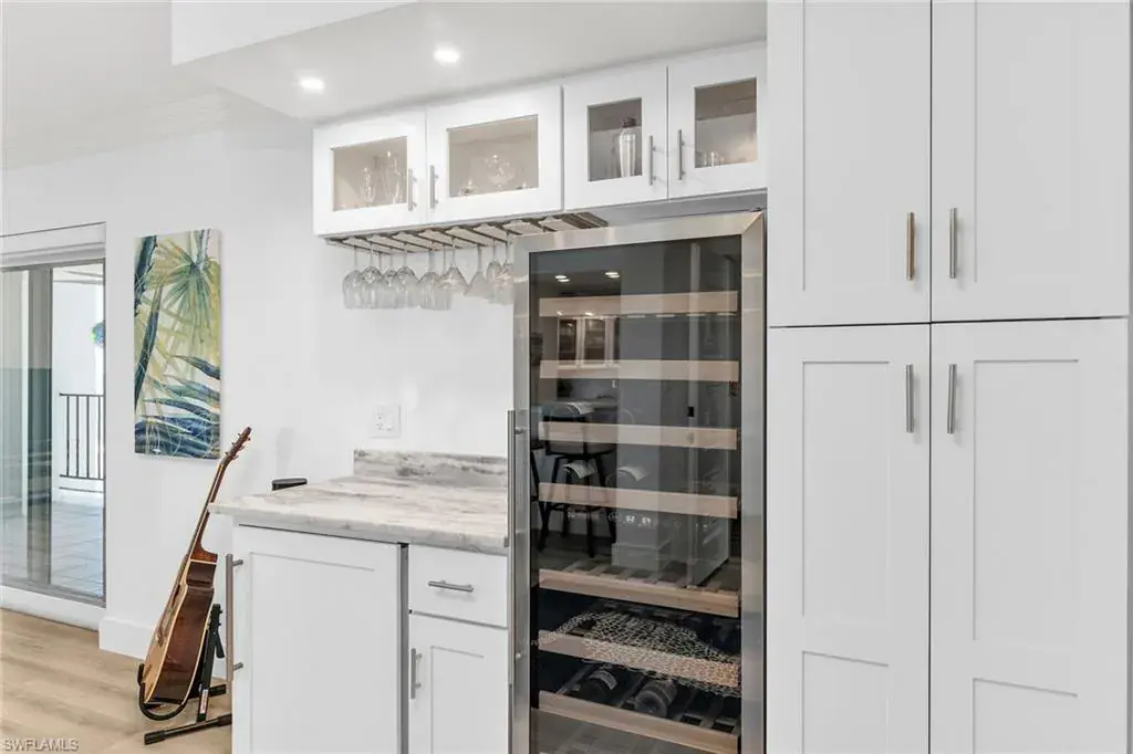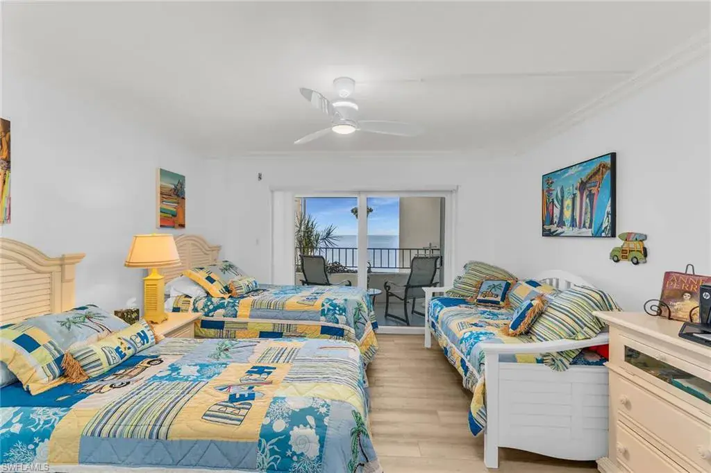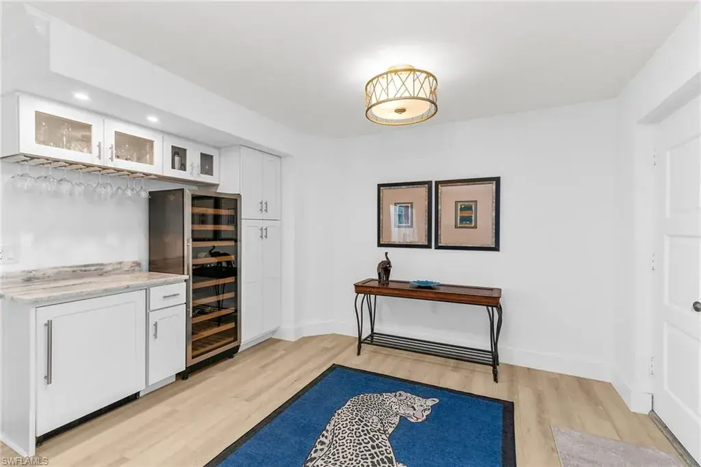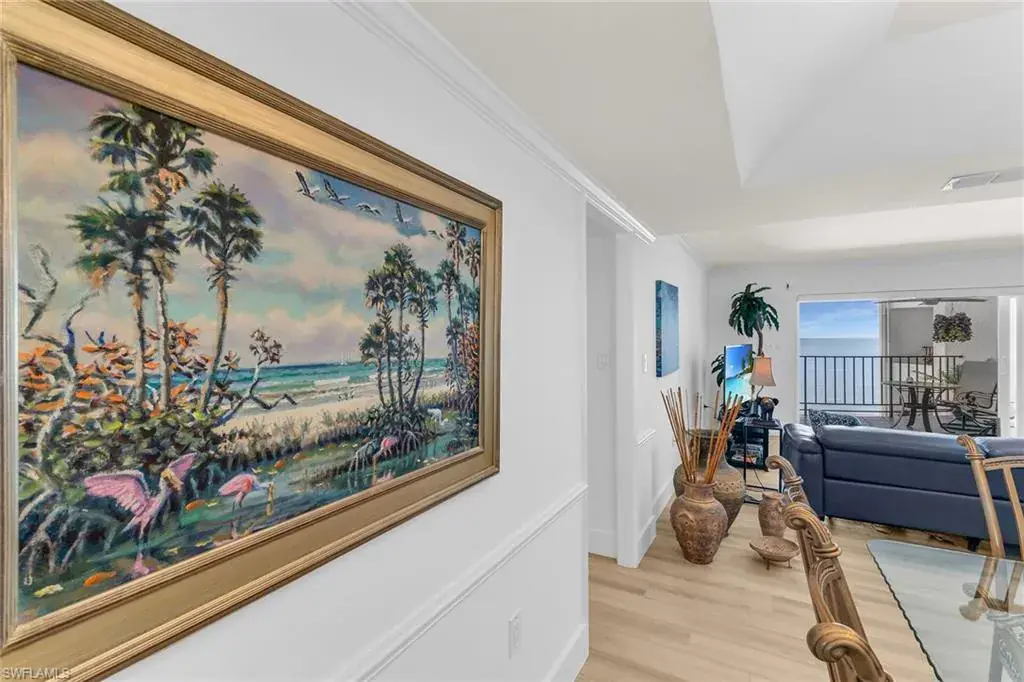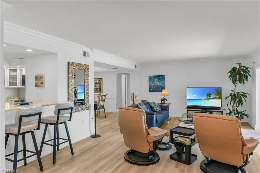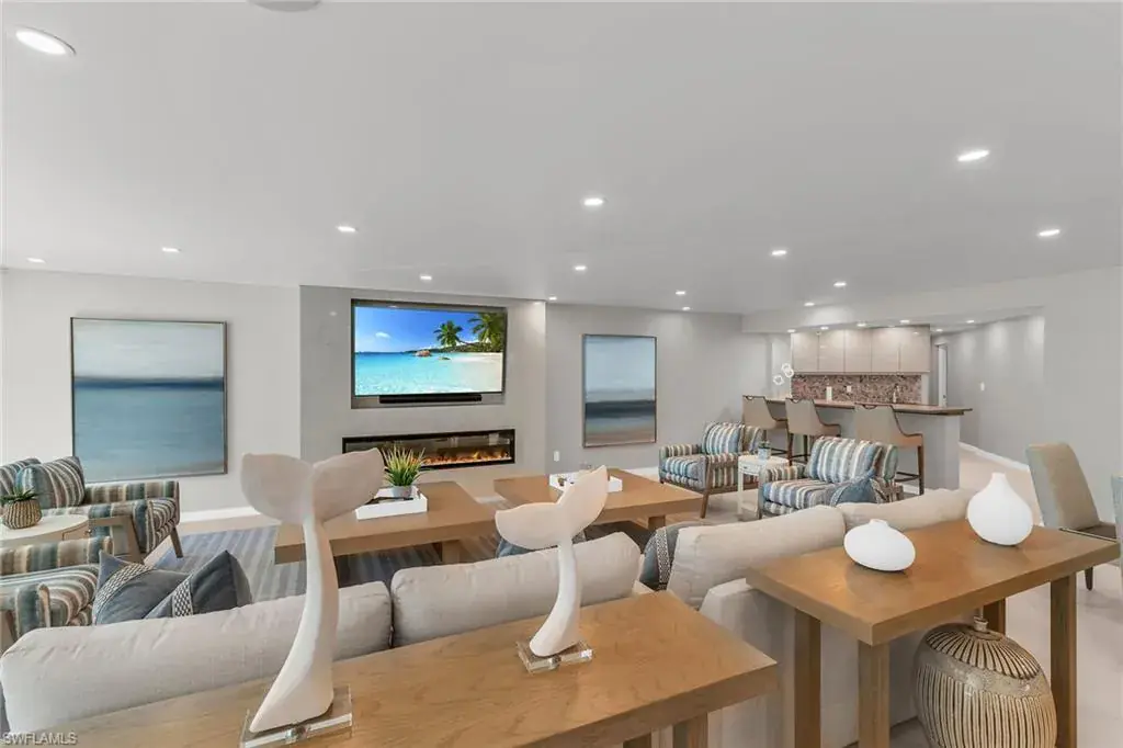 Rarely Available! This is your opportunity to own an incredible beachfront residence with unobstructed views of Park Shore beach. This coastal retreat is fully turn-key furnished and completely remastered with an open-concept design, blending coastal contemporary style with modern living functionality. A 300+ square feet covered balcony and multiple floor-to-ceiling impact windows showcase spectacular sunsets and all-day beach vistas. The newly reimagined spaces create an airy, sophisticated ambiance with light Pasadena Oak flooring, remote-controlled blinds, custom bar and entertainment area, a 54-bottle dual-temperature control wine chiller, bar fridge, bar storage, and luxurious fixtures and finishes. The kitchen features high-end Samsung black stainless appliances contrasting beautifully with light quartz countertops and white shaker and glass-front cabinetry. Both baths have been tastefully updated with new cabinetry and countertops. The primary bath is stunning with granite counters and walls and tons of storage. Amenities include a community room and library, fitness room, sauna, bike storage, game room, and an outdoor kitchen area, under-building covered parking and extra storage. Residents have direct access to the beach and the promenade, and nearby Venetian Village shopping and dining.