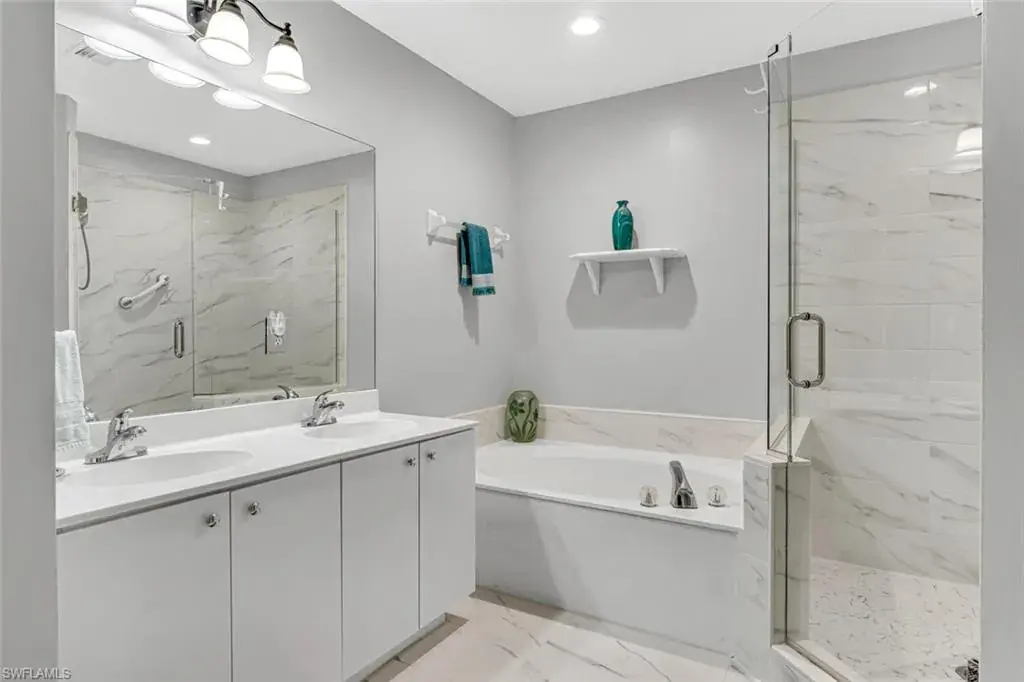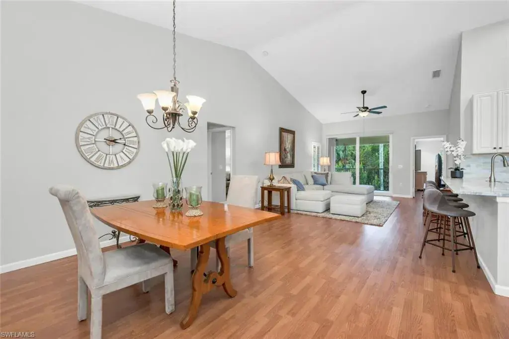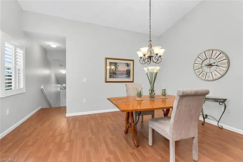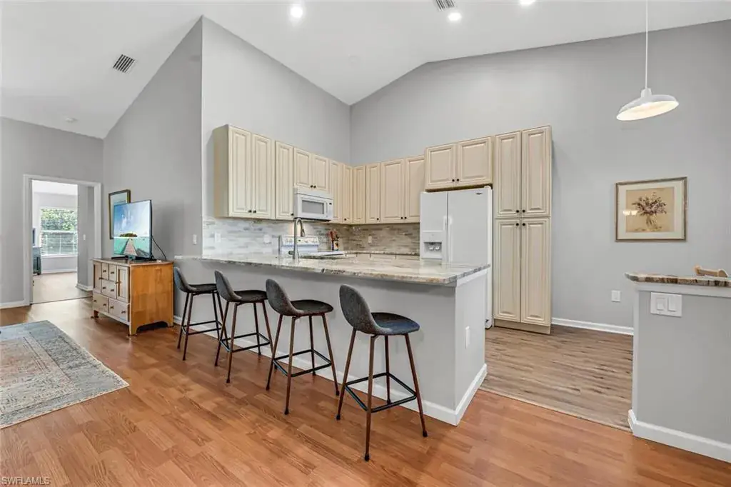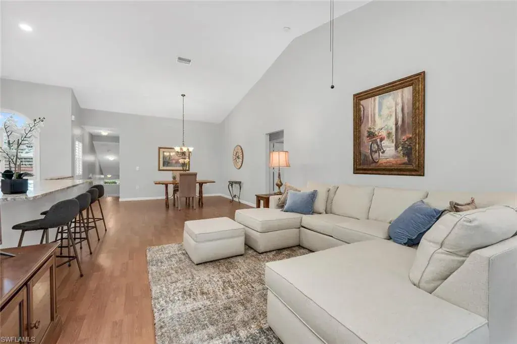 EXTENSIVELY RENOVATED KITCHEN CREATES AN OPEN FLOOR PLAN with BRAND NEW STAINLESS APPLIANCES (photos coming soon), granite countertops, soft close cabinets, new flooring. Newer roof, 2023 AC, impact windows and sliders, attached garage, wraparound lanai, light and bright turnkey home in desirable North Naples community of Huntington Lakes. This light and bright, stylishly turnkey furnished coach home offers an extraordinary living space. Serene paint colors, vaulted ceilings, new recessed lighting, and plantation shutters complete the luxury living experience. Enjoy every minute of Southwest Florida life in one of the community’s three beautiful pools, one of which is just steps away from this home. The community offers biking and walking space, tennis and bocce courts, and an active social calendar, mature trees coupled with five lakes and lots of well-manicured green space. Golf and pickleball groups gather to play together outside the community. Six miles to the beach, 20 minutes to the airport. You are going to love it here.