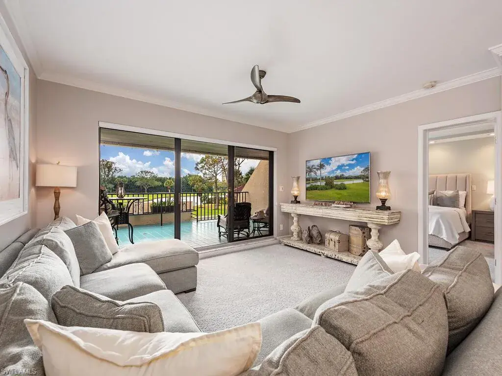 This updated coastal residence has 2 Bedrooms + Den/Flex, 2.5 Bath, with over 1600 square feet of well-planned living space. The spacious Owner’s Suite has two professionally designed walk-in closets, dual sinks, and a separate tub and shower. Lots of cabinet storage throughout to assist in keeping things neat and organized, including an extra outdoor storage room. The generous, southeasterly patio offers breathtaking views of the golf course, lake and sunset after glow, with plenty of room for alfresco dining and relaxation. Hyde Park is conveniently located across from Pelican Bay’s “berm” and tram stop, for quick and easy beach access. This unique, low-density community sits on 11 acres, with lush landscaping, pickleball courts, assigned under-building parking, guest parking, professional property management, swimming pool, spa, outdoor kitchen/grills, NEW roofs 2024, NEW elevator/cabs 2025, NEW lobby flooring and entrance door 2025, with a gorgeous Social & Fitness Room renovation planned for completion 2025. Pelican Bay extends many exclusive privileges, including private beachfront dining, attended beach services, a state-of-the-art fitness center, active tennis centers, pickleball 2025, kayaking, biking, paddle boarding & extensive walking/bike nature paths. This residence is close to renowned cultural and shopping destinations, such as Artis Naples Performing Arts Center, Waterside Shops, Whole Foods, Mercato, and just 6 miles to Olde Naples.