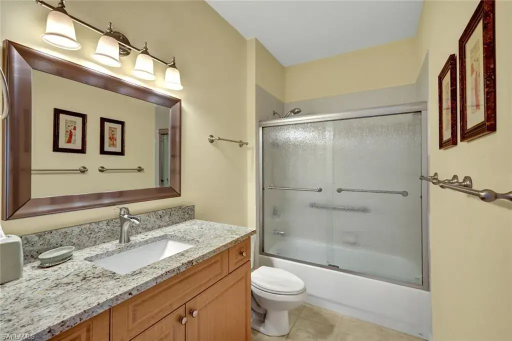 This Spectacular 3 Bedroom 2 Bath, 1st floor, condo in the desirable Ibis Pointe subdivision of Carlton Lakes is a dream 1st or 2nd home! At 1,654 sq ft, it is large and spacious for all of your living needs. This home features a fully renovated kitchen with granite countertops, stainless steel appliances, and two fully renovated Bathrooms. The living areas are newly refreshed tile, and the bedrooms have been finished with stunning hardwood flooring. The third bedroom is currently set up as a Den with a pull-out sofa and an attached private-glassed-in Lanai. The Lanai off of the Great Room has a spectacular Lake view that, combined with an evening glass of wine, is the epitome of Florida living. Additionally, this home has a one-car-attached garage and a separate laundry room.