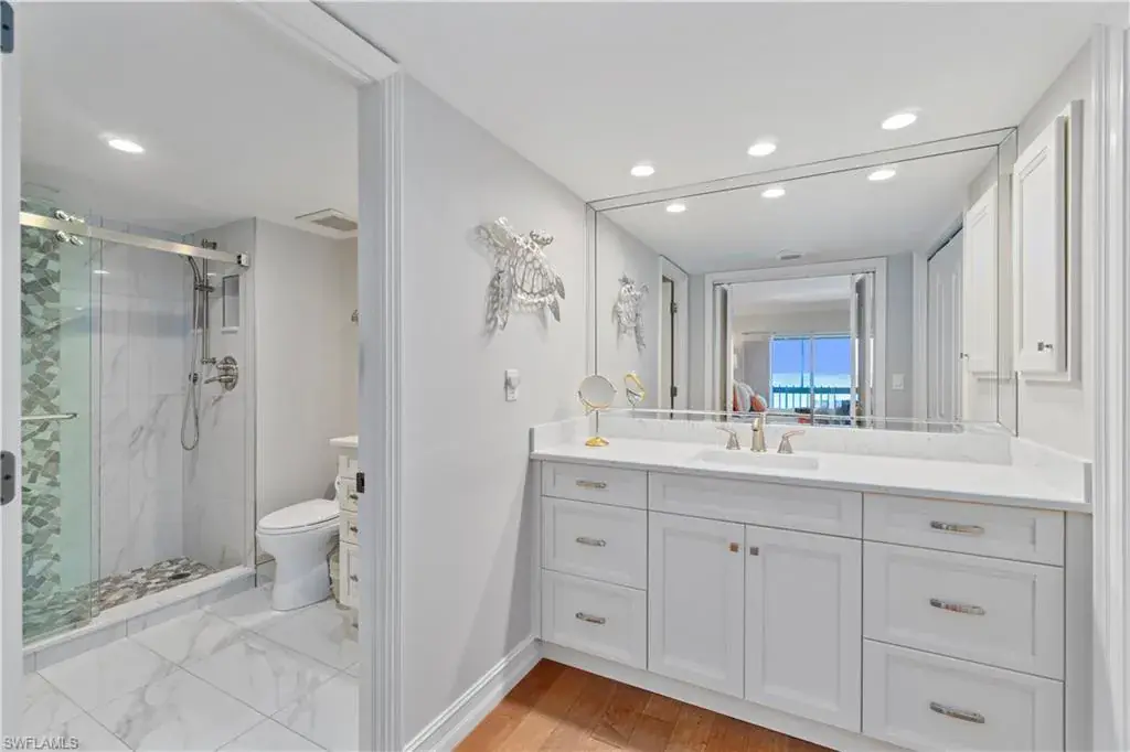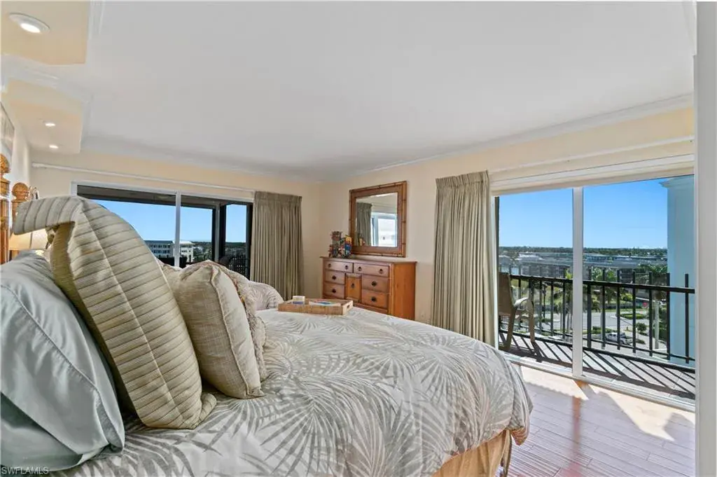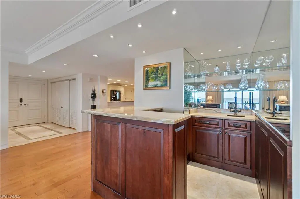 Enjoy sweeping SW Gulf and East Bay views from this rare three-bedroom plus den penthouse in the highly sought-after Moorings community of Imperial Club. Perfectly perched on Moorings Beach, this residence delivers the best of coastal living—sunset skies over the Gulf to the west, sparkling Moorings Bay and city lights to the east. A generous 38-foot west-facing lanai invites you to take in the sand, sea and sunset, while a second 38-foot east facing lanai showcases bayfront and city views. Inside, the thoughtful floor plan offers two equal-sized primary suites with large walk-in closets, plus a third guest bedroom, third full bath and a den that can easily serve as a fourth bedroom, TV room or home office. The kitchen features granite countertops and a separate dedicated bar area, ideal for entertaining. There is also a dedicated dining room, separate wet bar and a large laundry/utility room. Hardwood floors, electric roll-down hurricane shutters, and abundant storage throughout add both comfort and peace of mind. Additional highlights include TWO covered parking spaces and newly renovated amenities: a beachfront pool, stylish social room with catering kitchen, fitness center, and guest suite. No land lease, an unbeatable Moorings location, and move-in ready—this penthouse truly offers it all. Easy to show.