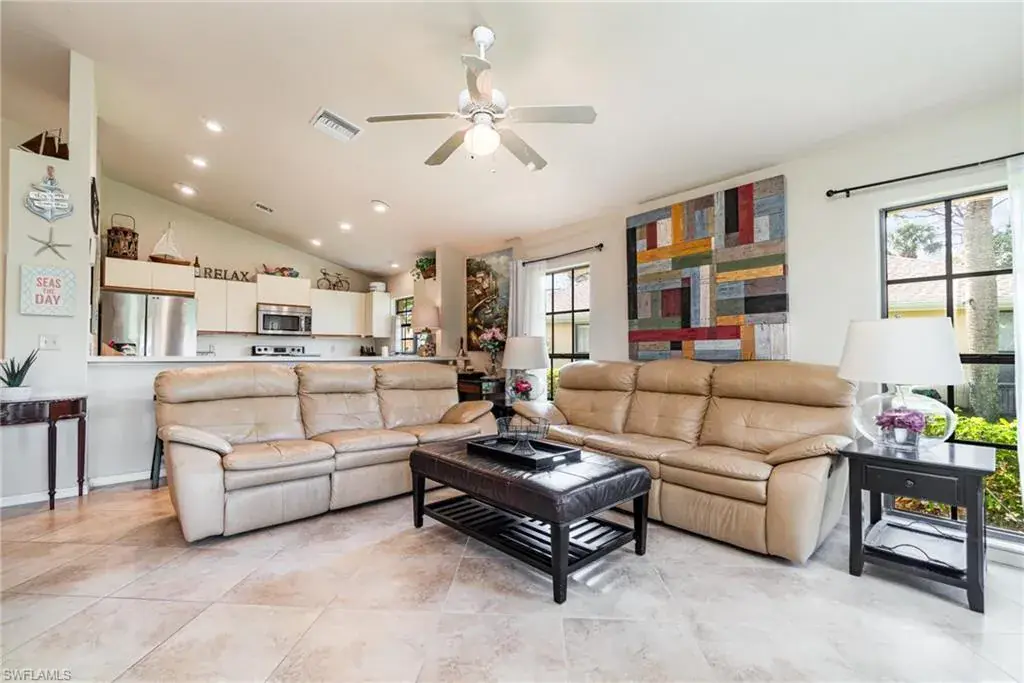 Welcome to this charming villa located in the highly desirable North Naples area within Imperial Golf Estates. This charming 2-bedroom, 2-bathroom residence boasts an open-concept floor plan with expansive windows that flood the home with natural light. Featuring vaulted ceilings, a generous living area, and a well-appointed open kitchen, this home is perfect for both entertaining and daily living. The kitchen is equipped with ample cabinetry, and thoughtful design for both style and functionality. The master suite offers a spacious walk-in closet and large en-suite bathroom, complete with dual vanities, soaking tub, and a separate walk-in shower. The guest bedroom is also generously sized, with a walk-in closet and direct access to the guest bathroom, ensuring privacy for both residents and visitors. The screened-in, tiled lanai and private backyard provide an ideal space for outdoor relaxation. Additional features include tile flooring laid diagonally throughout the home, a welcoming entryway, and a convenient storage room in the garage. The property is located at the end of a cul-de-sac and includes a one-car garage.