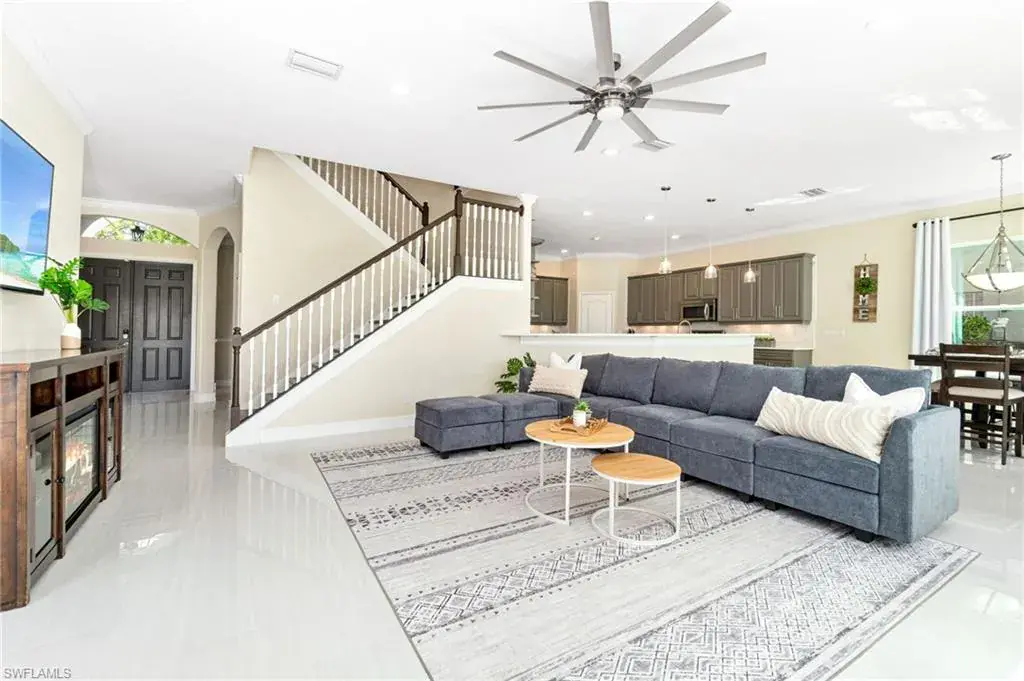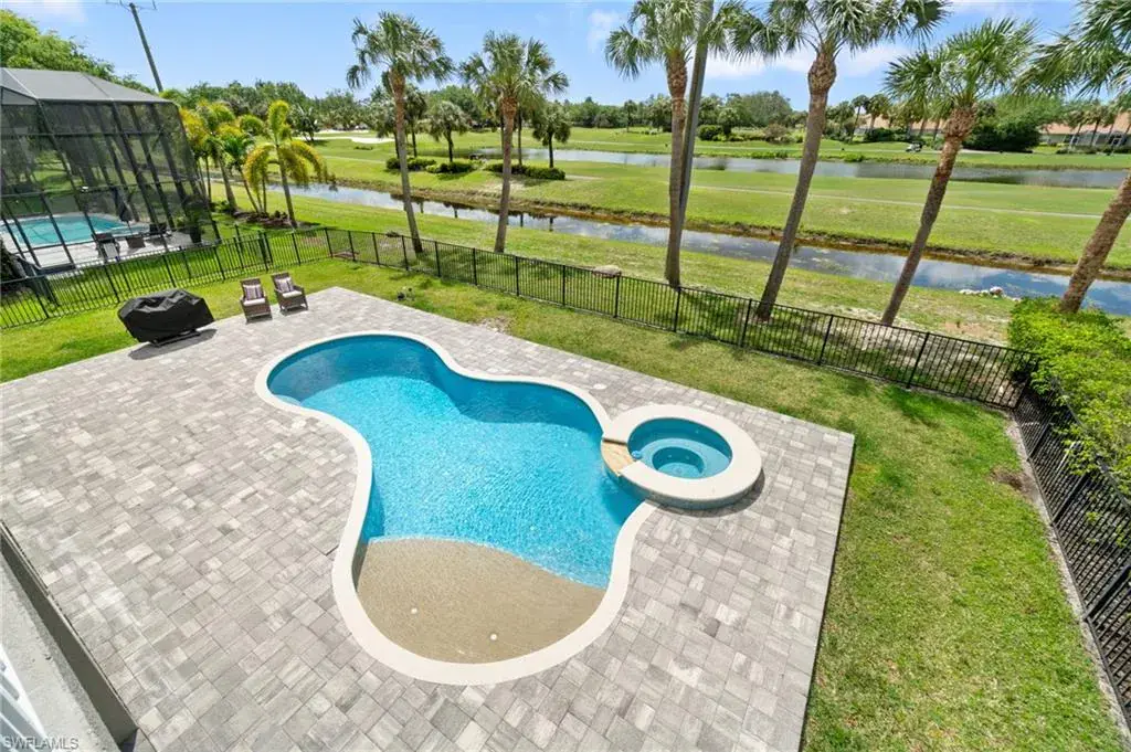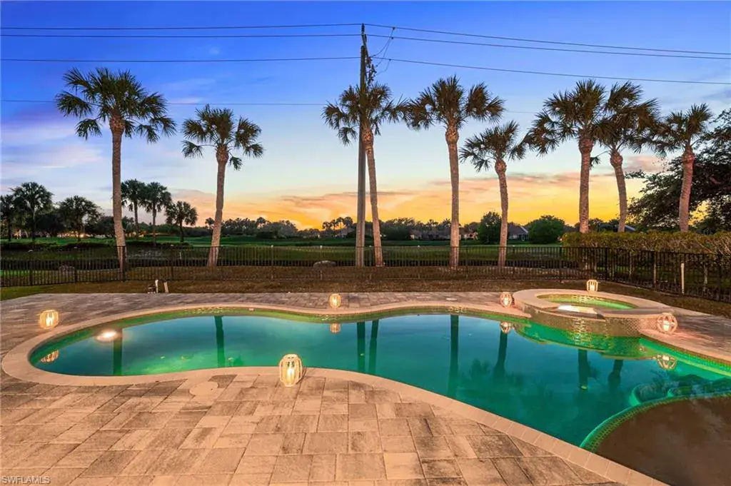 So many reasons to love this home – Starting with the wall of windows that capture the gorgeous sunsets over ArrowHead golf course! Beautifully updated and boasting five bedrooms plus a den, plus a loft, this pool home is located in Indigo Lakes in North Naples and offers low HOA fees! Nearly a quarter acre lot, the outdoor space features a fully fenced, oversized paver deck, with a yard for the kids and pets to enjoy! Inside you’ll love the high ceilings, spacious layout and neutral color palette! Open concept living in the main area while also having a formal dining room, office or den area, plus a loft which is setup as a theater room! Just up the stairs you’ll find french doors leading to a spacious master suite with a private balcony, built out closet, soaking tub, walk-in shower and dual vanities. Top it off with a three car garage and newer AC units and this one has it all! Community amenities include gated entry, tennis and basketball courts, fitness center, pool and spa, playground and located in an A-rated school district.
