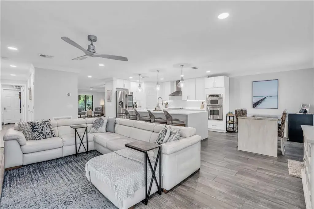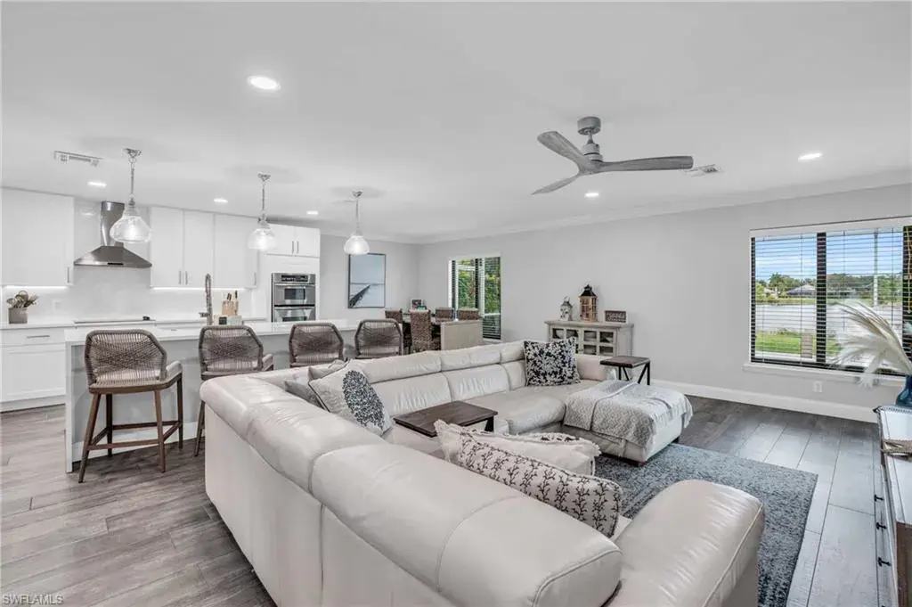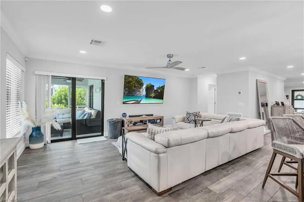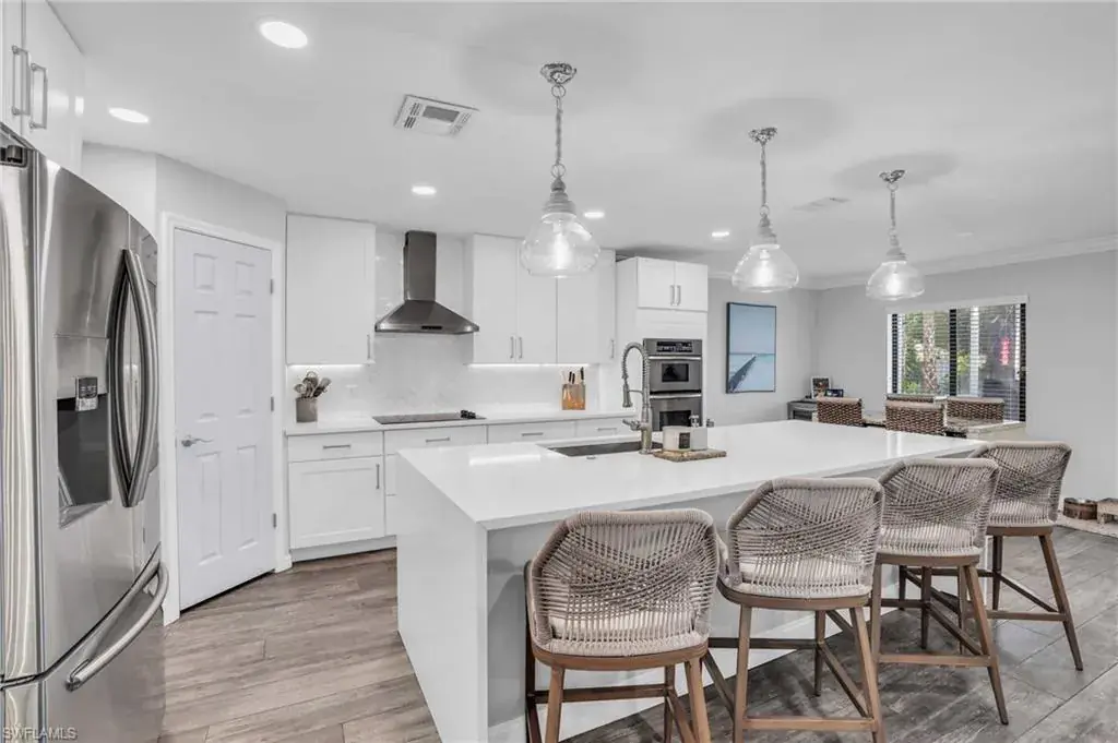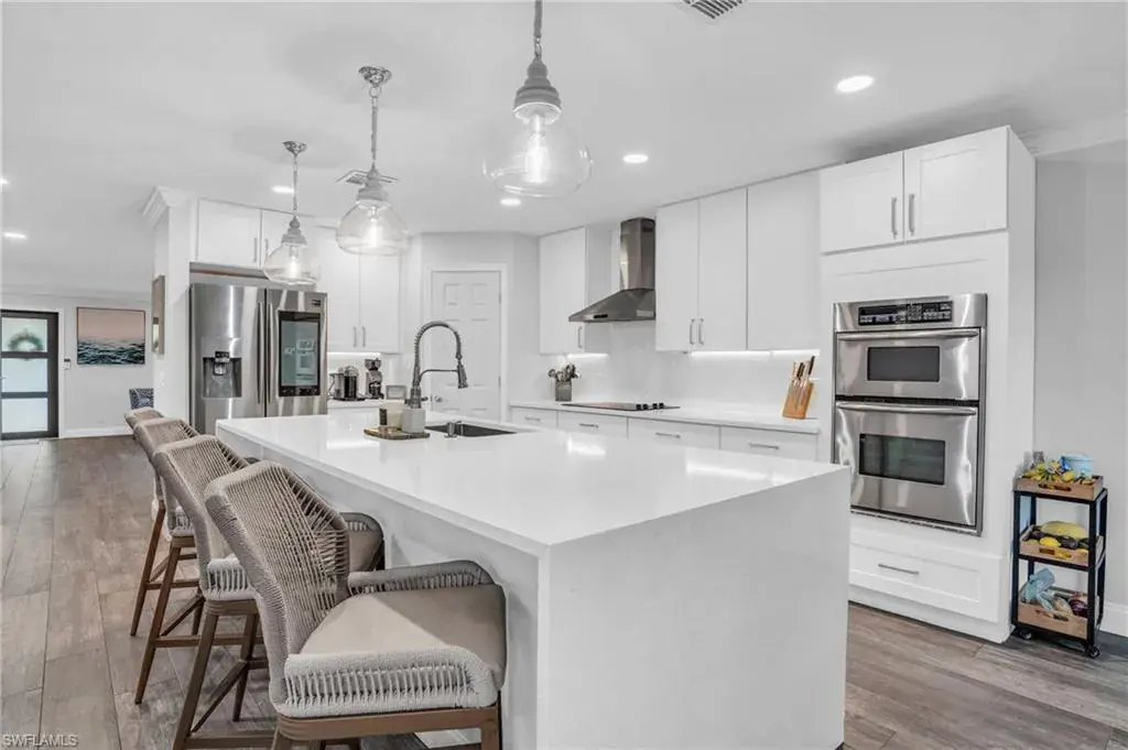 PRICE IMPROVEMENT! Welcome to 14971 Savannah Drive! Situated on over .25 acres, this beautiful 5 bed, 3.5 bath nestled in Indigo Lakes has been updated throughout. Walk into the inviting foyer that leads you to a large dining and sitting area. Wood look tiled floors throughout the first floor enhance the coastal feel of the home. The spacious open floor plan leads to the fully updated kitchen and family room. Kitchen updates include shaker, soft touch cabinets, quartz countertops with a waterfall quartz island, top of the line stainless steel appliances, tiled backsplash and updated pendant lighting. The first floor primary bedroom has new luxury vinyl plank flooring and two walk in closets! The ensuite primary bathroom is a dream with large tiled shower with bench, dual vanities and updated flooring and dimmable lighting. The updated half bath and laundry room complete the first floor. As you make your way to the second floor, the media/flex room is perfect for entertaining or a workout area. Sliders off the flex room lead you to a screened in second story balcony where sunsets and views of the lake can be enjoyed. Four additional bedrooms with walk in closets and two full baths complete the well thought out upper floor plan. Fully screened in lanai with a heated in ground pool facing the lake with western exposure is both serene and private. UPDATES INCLUDE: Roof, gutters and soffits(2023), Hurricane impact windows, garage &front doors (2023), Exterior and interior paint (2023), Pool variable speed pump, heater, light and salt system (2023), New lighting and ceiling fans (2023), Kitchen backsplash (2023), Carpeted steps and primary bath flooring (2023)The wonderful location of this home allows you to walk to all of the amenities that Indigo Lakes has to offer: clubhouse, community pool, fitness center, tennis, playground and basketball courts. Indigo Lakes is located minutes from I-75 access, Founders Square and close proximity to the local beaches. Hurry and schedule your private showing today! This one is truly a showstopper!