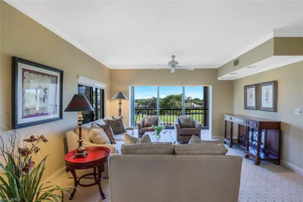 C7370 – Postcard-perfect lake and golf course views await at this sought-after top-floor corner residence. The spacious 3 BR plan showcases a wrap-around screened porch, with multiple sliding glass doors ideal for indoor-outdoor living. High ceilings make for light-filled interiors. Luxury renovations range from granite-topped custom wood cabinetry in kitchen and baths, to neutral palette tile floors, to rich crown molding and plantation shutters. The owner’s suite features a sitting area, re-designed bath with floor-to-ceiling tiled walk-in shower, dual vanities plus make-up vanity, and a large custom-fitted walk-in closet. Ample closet and storage spaces throughout are the icing on the cake. Meticulously maintained, the home has a newer (2020) energy-efficient AC system and is move-in ready. Furnishings are negotiable. Right across from Pelican Bay’s beach access and steps away from the Commons tennis center, Interlachen affords an ideal location for convenient proximity to Pelican Bay amenities. Resident privileges to Pelican Bay’s Lifestyle Center include wellness/fitness and community programs. Walkable to Club Pelican Bay with 27 holes of golf, spa/fitness & private dining.
