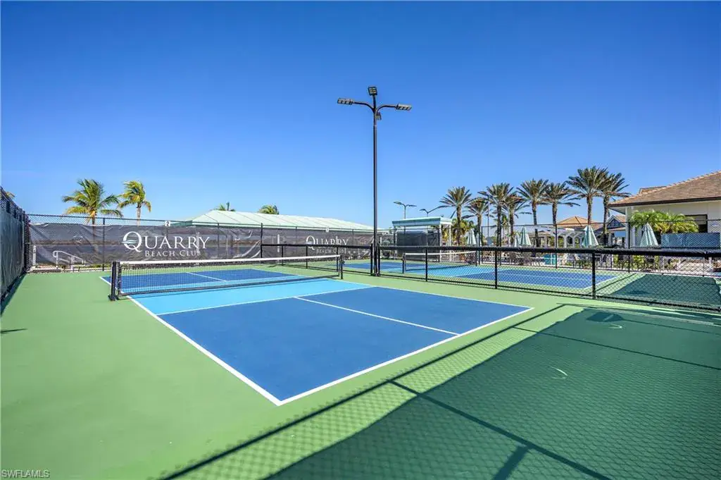 This beautiful two bedroom plus den, two bathroom coach home is located in the sought-after community of The Quarry. The spectacular western exposure features peaceful views overlooking the lake and golf course. Many upgrades include new roof and AC, upcoming new exterior paint, new appliances, new washer and dryer, primary bedroom flooring, and tile work in second bath. Additional overhead storage is available in the attached two-car garage. As a resident of The Quarry, access to the fantastic amenities includes the beach club, state-of-the-art fitness and wellness center, a resort-style pool with a pool bar offering food and beverage service, lap pool, an excellent restaurant, and boating lakes that can accommodate boats up to 26 feet and other water activities, in addition to five clay tennis courts, five pickleball courts, and three bocce courts. The Quarry also offers an optional golf membership with a Hurdzan Fry championship 18 hole golf course. The perfect Florida lifestyle awaits you!