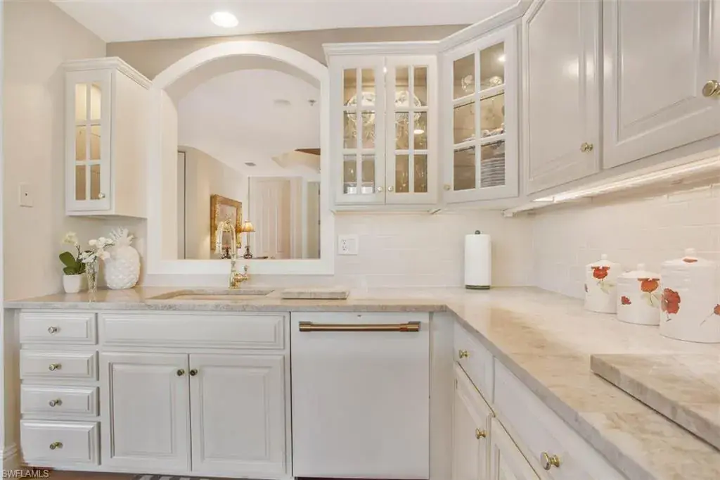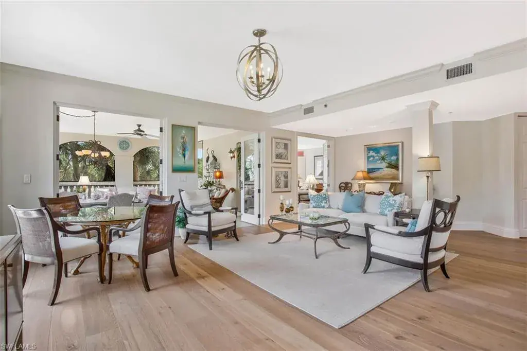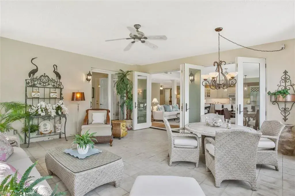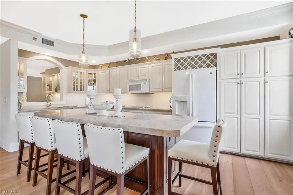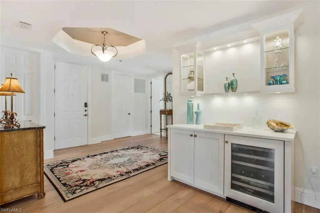 The thoughtfully designed open-concept floor plan boasts wide plank white oak floors, plantation shutters, and abundant natural light from its desirable southwestern exposure. The updated kitchen, complete with quartzite countertops and a stylish wine bar, makes entertaining effortless. French doors open to a spacious, 400 sq. ft. screened lanai, creating a seamless indoor-outdoor living experience.