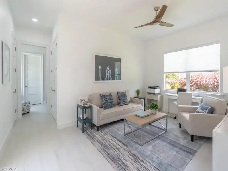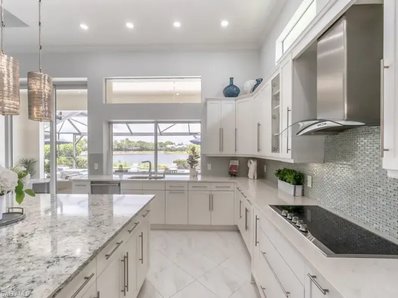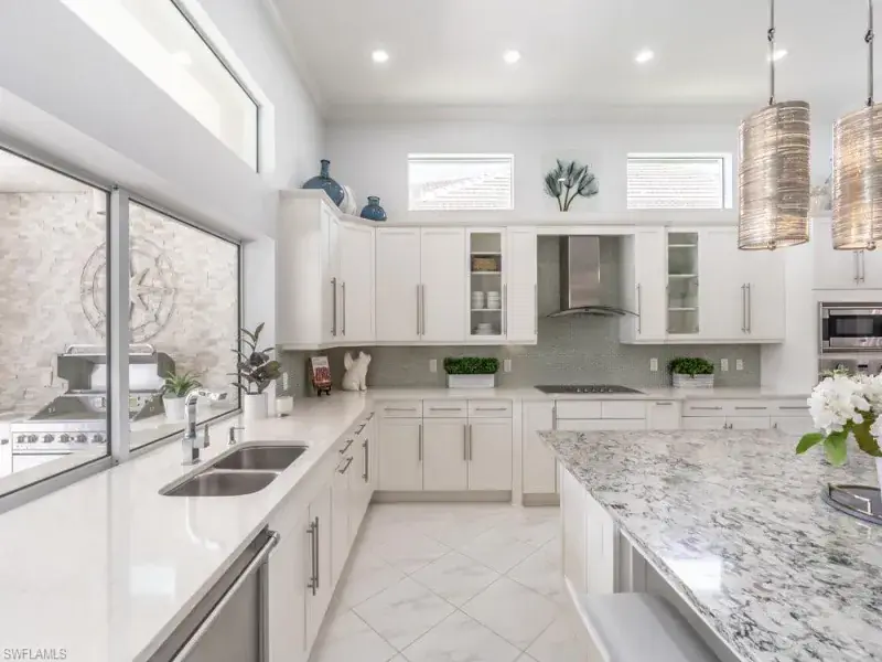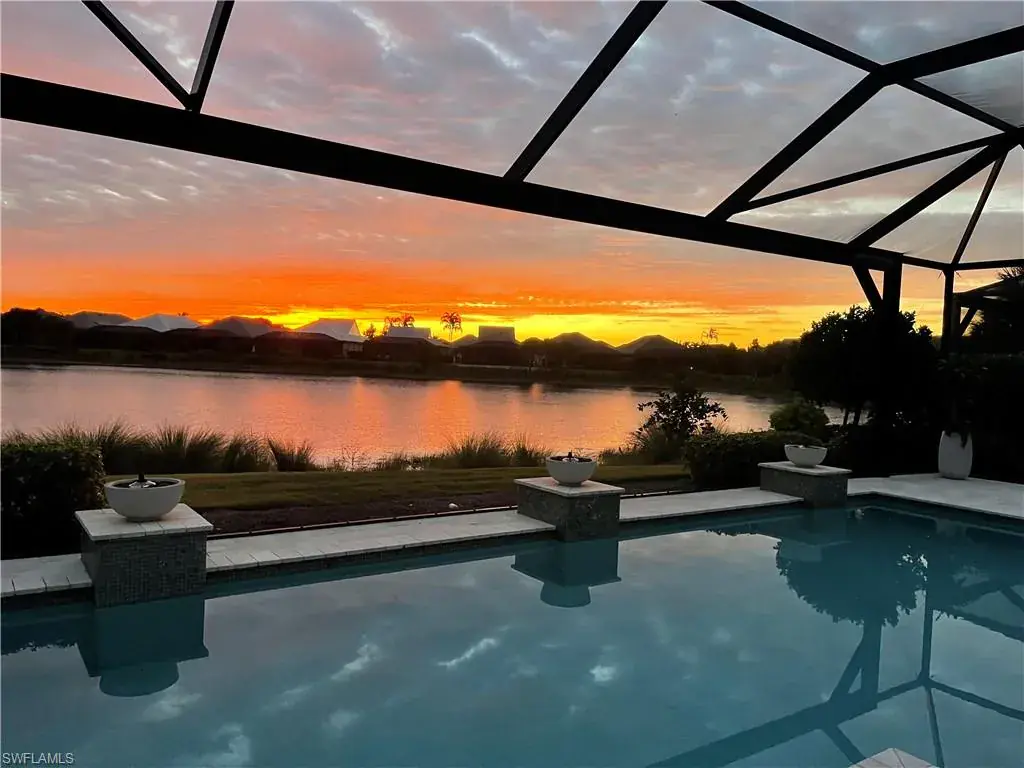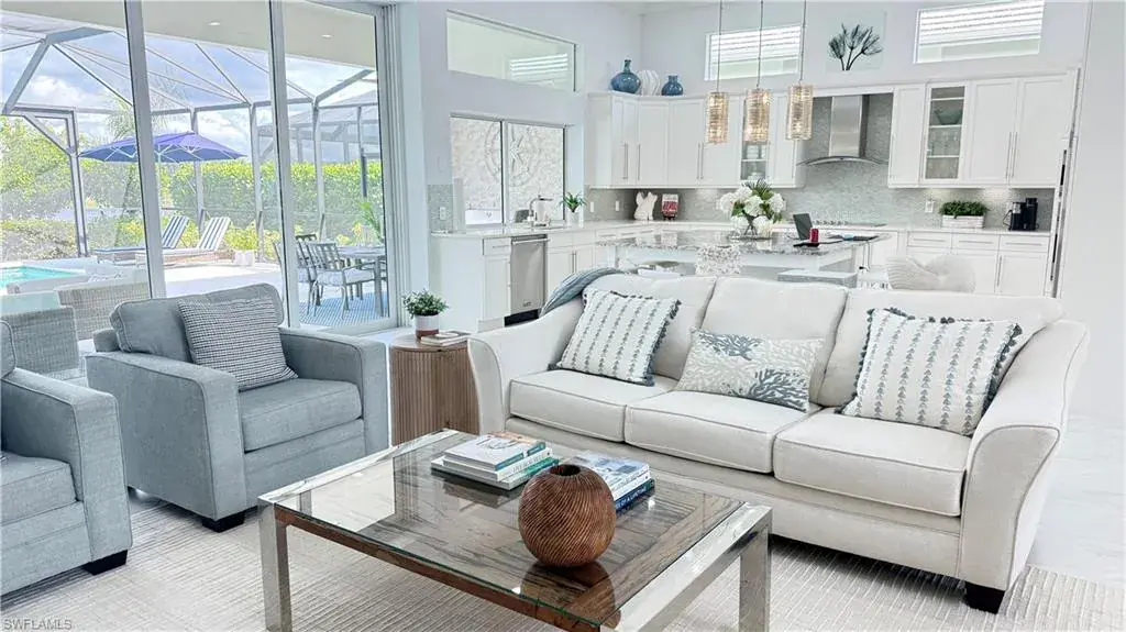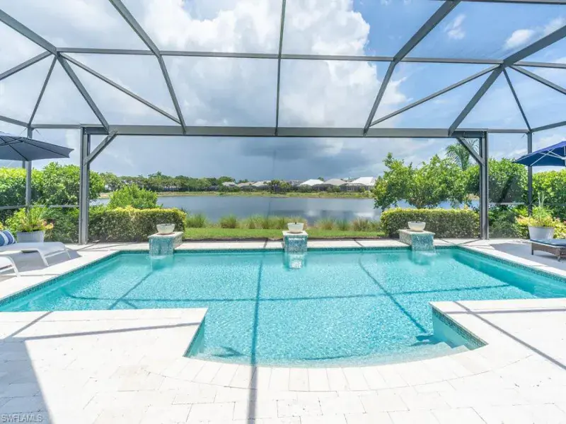 A spacious great room captures beautiful views through huge glass sliding doors that pocket inside the wall and dissolve the line between indoors and out, for effortless entertaining. The lanai is crowned by a soaring panoramic-screen pool cage framing a resort-style pool that shines with blue and green glass tile. Three cascading waterfalls are capped by fire bowls, creating a dramatic fire-and-water glow at night. A rock-accent wall enhances the outdoor kitchen with a new chef’s grill, side burner, refrigerator, and cabinetry. Multiple areas invite dining, entertaining, or relaxing, and the outdoor bar, with pocket sliders that disappear into the wall, seamlessly unite both indoors and out. Just beyond the enclosure, a lime tree provides cocktail garnishes.